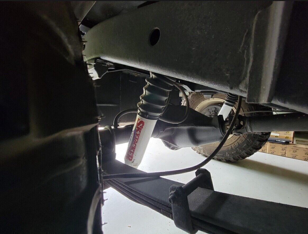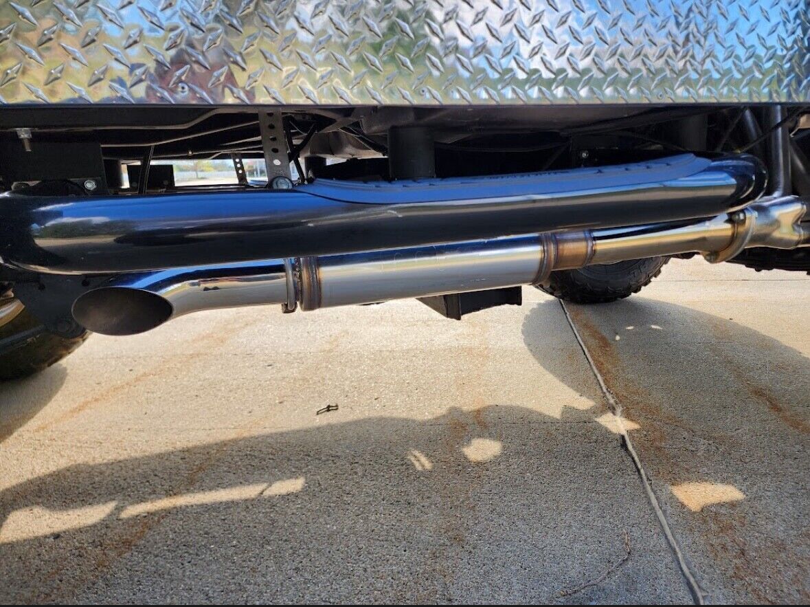 The body was repainted blue and ride on a 6” lifted suspension with Skyjacker shocks and springs over 15 inch, eight hole wheels and 33 inch mud terrain tires.