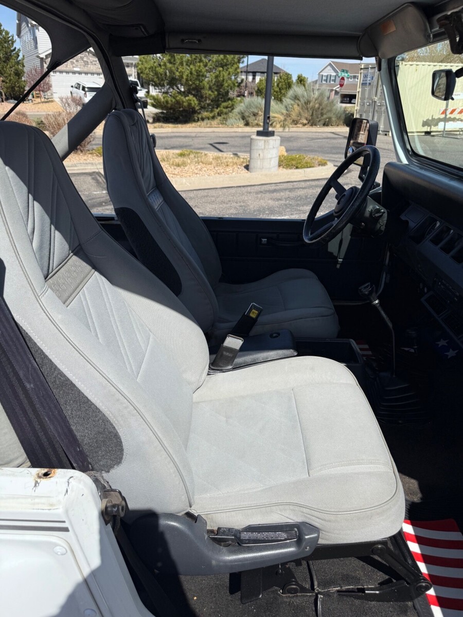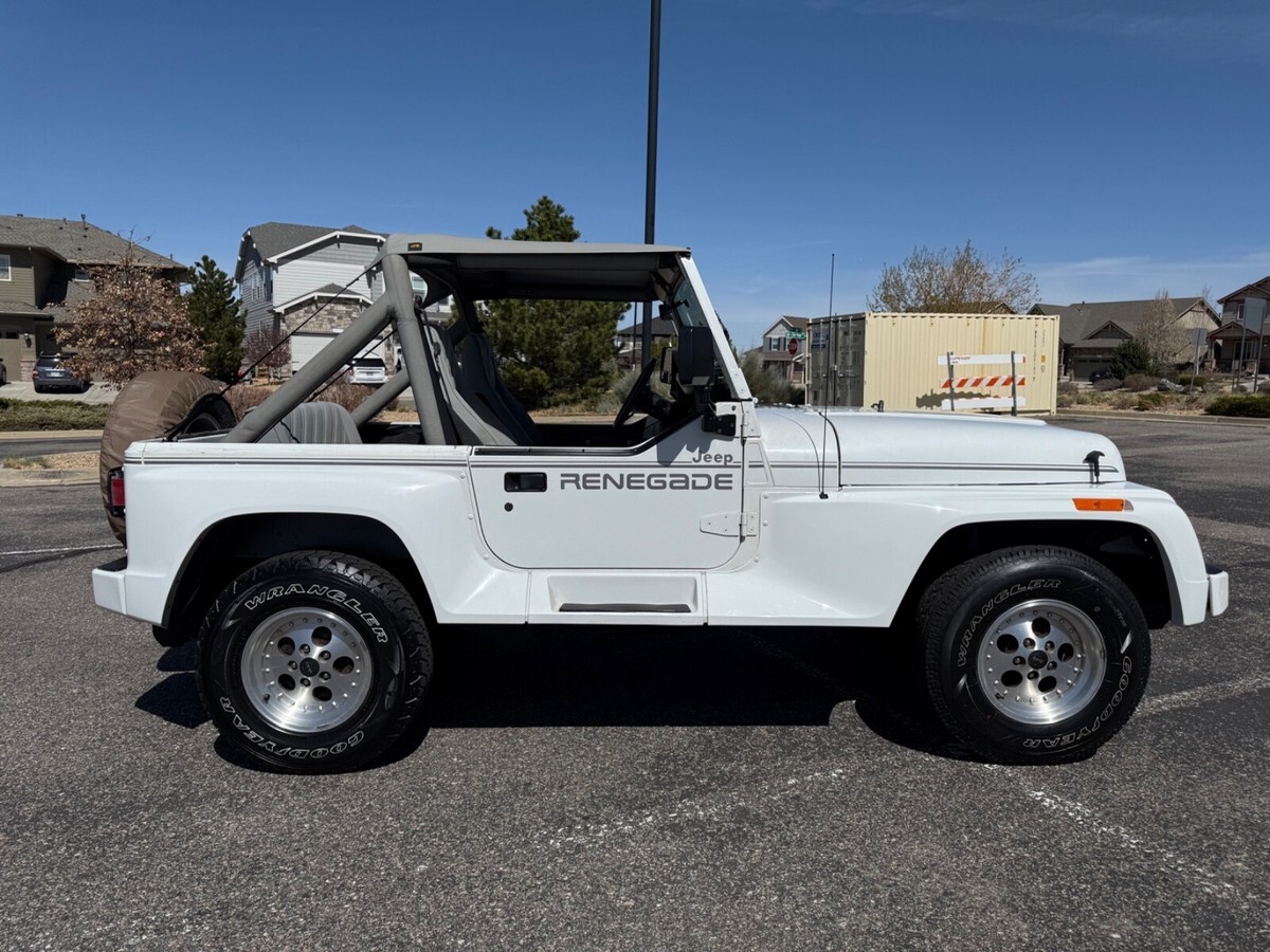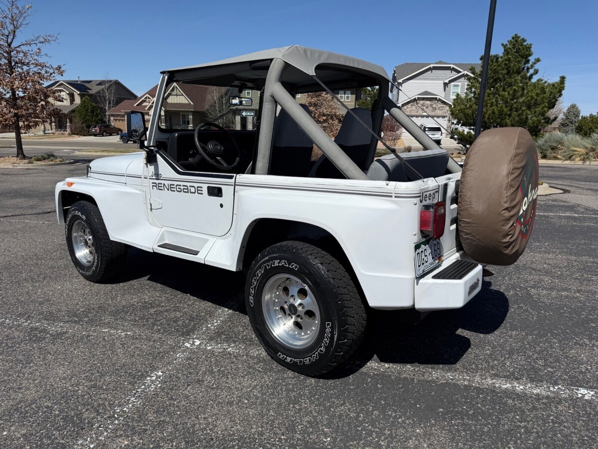 This Jeep was owned by a lady since 1993 in Houston Texas and the previous owner was her coworker at NASA. The jeep has a perfect autocheck and carfax reports also.The white paint looks good and interior is in great shape. The 4.0 just purrs and the 5 speed transmission shifts as it should with no issues. All lights work inside and outside and 4wd works as it should with the 4wd light coming on when engaged. I change the faded steering wheel with a oem steering wheel which looks like new! All gauges work but sometimes the temp gauge takes a minute to fire up. The jeep will come with the bikini top and I have the aftermarket hardtop that came with the jeep and if the winning bidder wants it I will put it back on. It’s a 2 piece hardtop and there is a picture that you can see it. This jeep was not driven much in the last 15 years. Only 100k miles and rot free no rust. The jeep has ac but could use a recharge but it slightly blows a little cold. Heat blows hot and horn works. Tires are in decent shape and no chips in the windshield. The jeep is located in Denver Colorado and could be driven home or I can suggest a shipper. The floor mats and spare tire cover do not go with the jeep. I do have the oem front black floor mats that will go with the jeep. I only take cash or bank wire. If you like more pictures or have any questions please ask. These renegades are getting harder to find for sure. This could be a great ice cream runner with the kids as Jeep season is about in full swing! It does have the original radio and sound bar and both work.