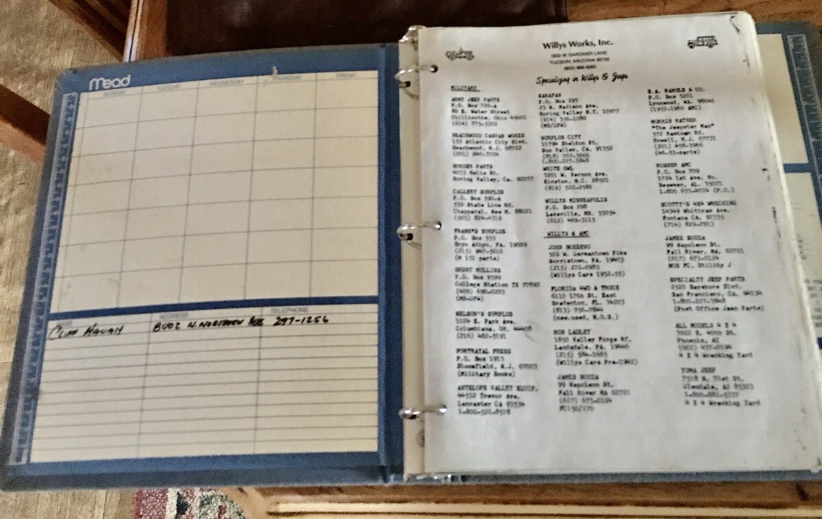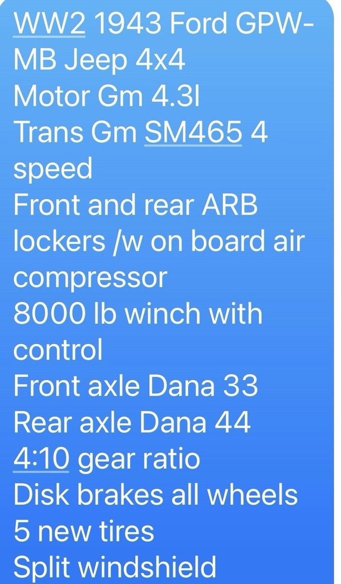 1943 Jeep Willy’s MB, registered and titled to one owner in AZ since March 1943. Two binders, one with all mods and products used one service manual, original title with Vehicle, new tires new battery 300 miles on motor and drive train drives great