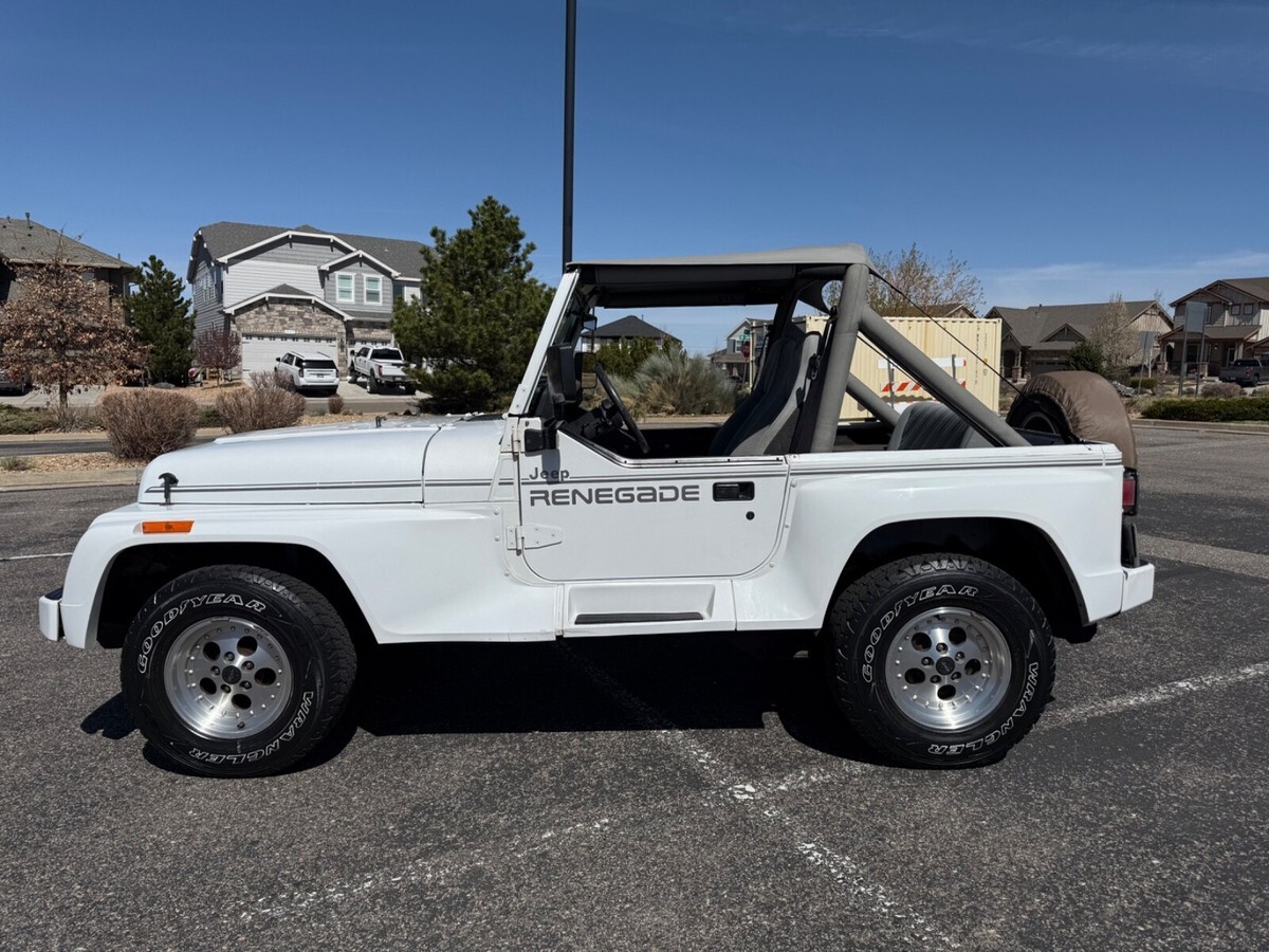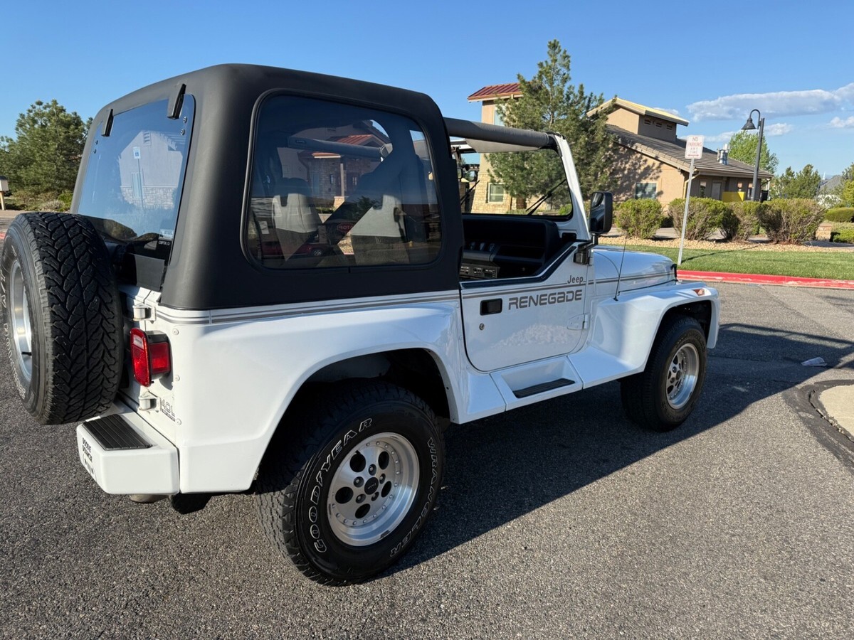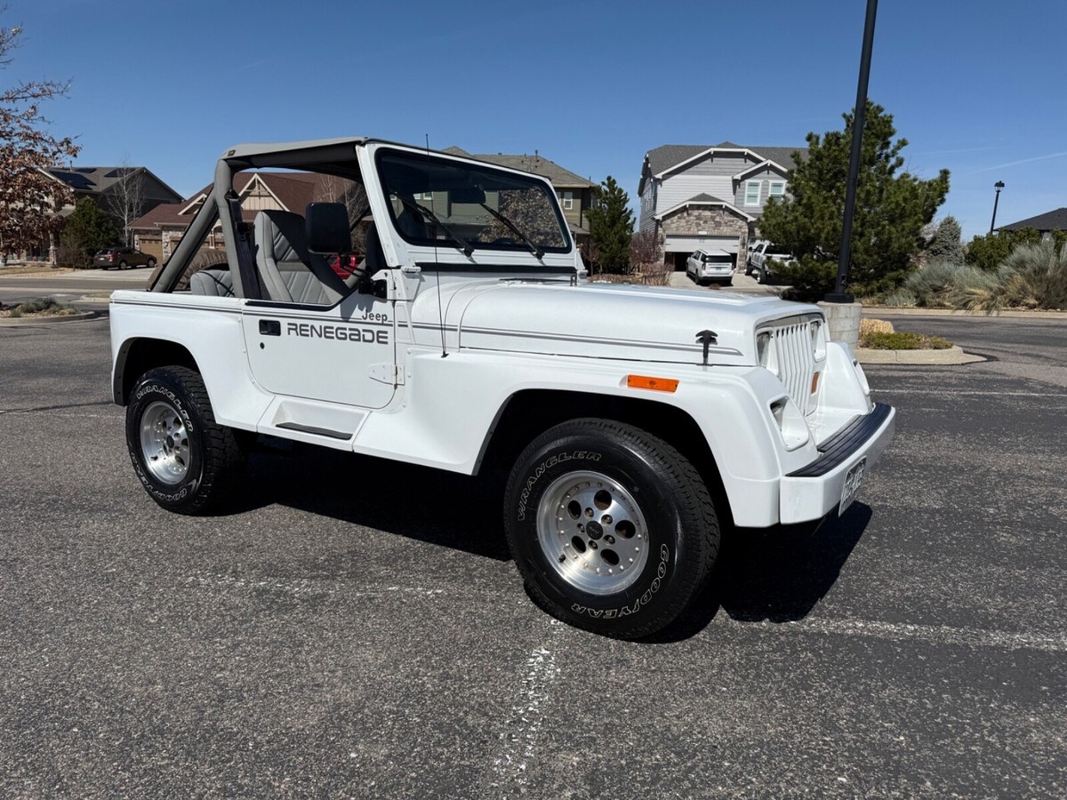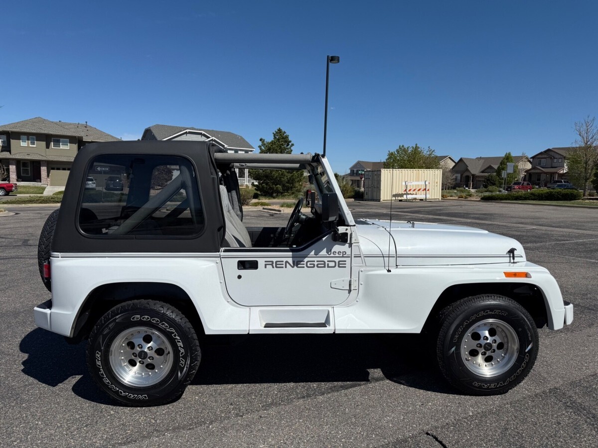 This Jeep was owned by a lady since 1993 in Houston Texas and the previous owner was her coworker at NASA. The jeep has a perfect autocheck and carfax reports also.The white paint looks good and interior is in great shape. The 4.0 just purrs and the 5 speed transmission shifts as it should with no issues. All lights work inside and outside and 4wd works as it should with the 4wd light coming on when engaged. All gauges work but sometimes the temp gauge takes a minute to fire up. The jeep will come with the bikini top and I have the aftermarket hardtop that came with the jeep and if the winning bidder wants it I will put it back on. It’s a 2 piece hardtop. This jeep was not driven much in the last 15 years. Only 100k miles and rot free no rust. The jeep has ac but could use a recharge but it does slightly blows a little cold. Heat blows hot and horn works. Tires are in decent shape and no chips in the windshield. The jeep is located in Denver Colorado and could be driven home or I can suggest a shipper. I do have the oem front black floor mats that will go with the jeep. I only take cash or bank wire. If you like more pictures or have any questions please ask. These renegades are getting harder to find for sure. This could be a great ice cream runner with the kids as Jeep season is about in full swing! It does have the original radio and sound bar and both work.