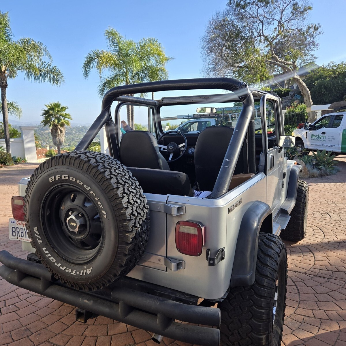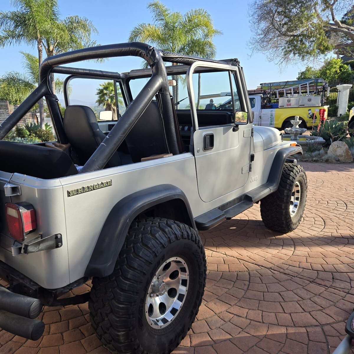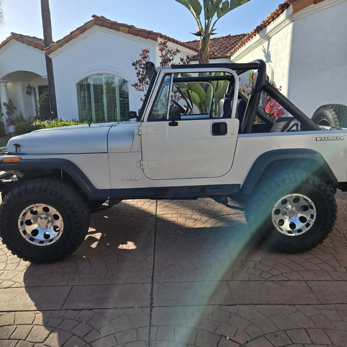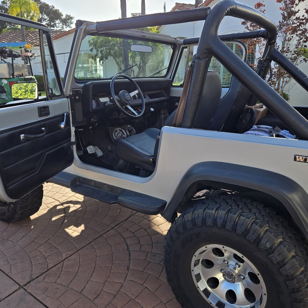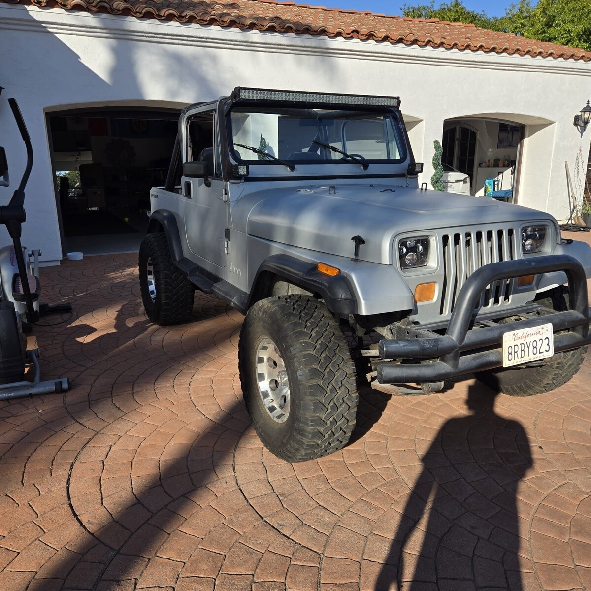 1987 Jeep Wrangler, V6. 33" tires, LED headlights, 2024 battery. No stereo faceplate, wired to speakers already. No cover(s) available. Passed smog in 2023. DMV fees paid through April 2026. Needs current smog.