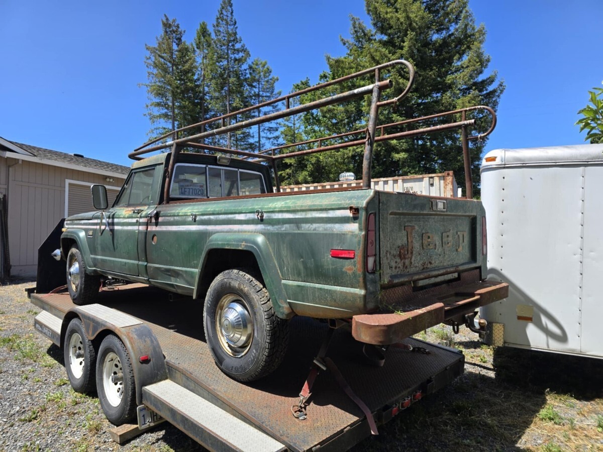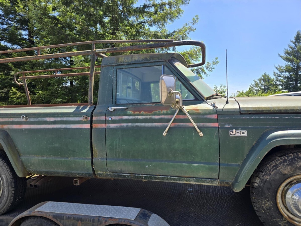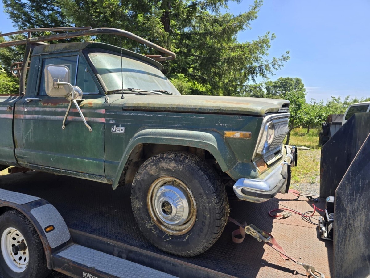 1977 Jeep J20 Truck Farm Fresh- Running Project Truck 4x4 Sm Block Chevy- has been sitting for 1-2 years- at the time of parking, had brake work done and new tires put on- this truck is not smog legal in the state of California as it has a small block chevy engine installed- no smog will be provided and prefer to sell out of state id possible- if you win and your in California, you understand that its not smog legal and i will not get it smoged. I jump started the truck with gas down the carb- it ran and made no unusual noises- will need to be gone through completely before its road ready and will need to be towed- it will not drive onto a trailer; you will need to winch it up. overall good condition and only a couple small minor dents and 2 spots of floor rust in the cab- clear ca title.Please message me with any questions- I can get more photos if you would likeLocated in Sonoma county CaliforniaBuyer is responsible for all shipping arrangements-$500 dollar non refundable deposit due within 48 hours of of completed auction- full payment to be made via cashiers check from a well known bank and must clear before vehicle leaves- cash in person is the best form of payment- no personal checks, no bank transferers. Full payment due with in 7 days of auction ending. buyer must pick up vehicle within 2 weeks of auction ending.I reserve the right to end the auction early as the vehicle is listed locally-!!!!!DO NOT CASH OUT WIT CARMEL!!!!