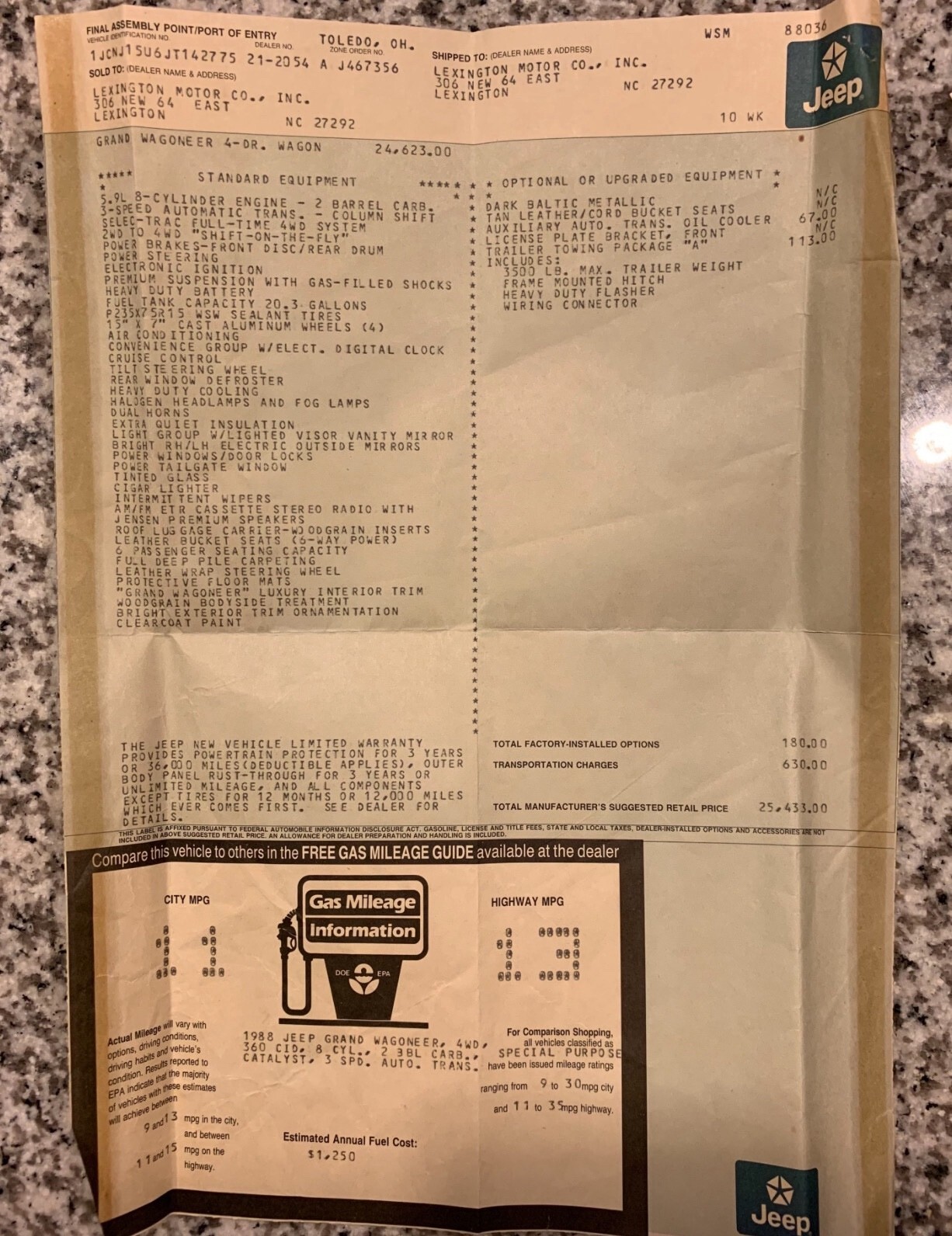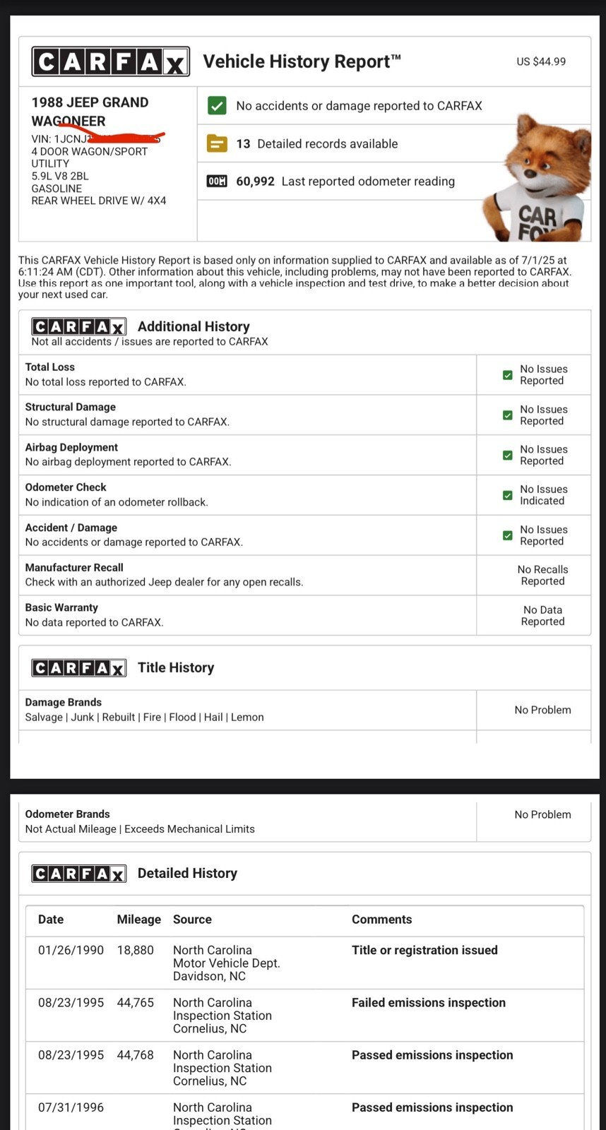 1 owner Jeep Grand Wagoneer. No rust, see frame photos. Original Skid plate is good too. Paint is burned as 88’ did (no clearcoat) it’s NOT rust. It’s burned up and faded paint. Body has one dent. See close up on quarter joint where they ALL rust and you’ll see there none here. Excellent chrome. Everything is there, nothing ever taken from this jeep. 60k carfax certified original miles and no accident history. You can see a shop added a one in front of the 05’ entry in auto check- carfax corrected this after documentation was provided (I have carfax if you want it, or you can buy it). Autocheck doesn’t have this feature that I’m aware of. Will not find a better restoration candidate or drive as patina. Restoring this one will actually yield results unlike restoring a higher mileage example due to the history. Runs and drives. Has had thousands in mechanical work done over the years. Tons of service records since new. Bought new in NC.
