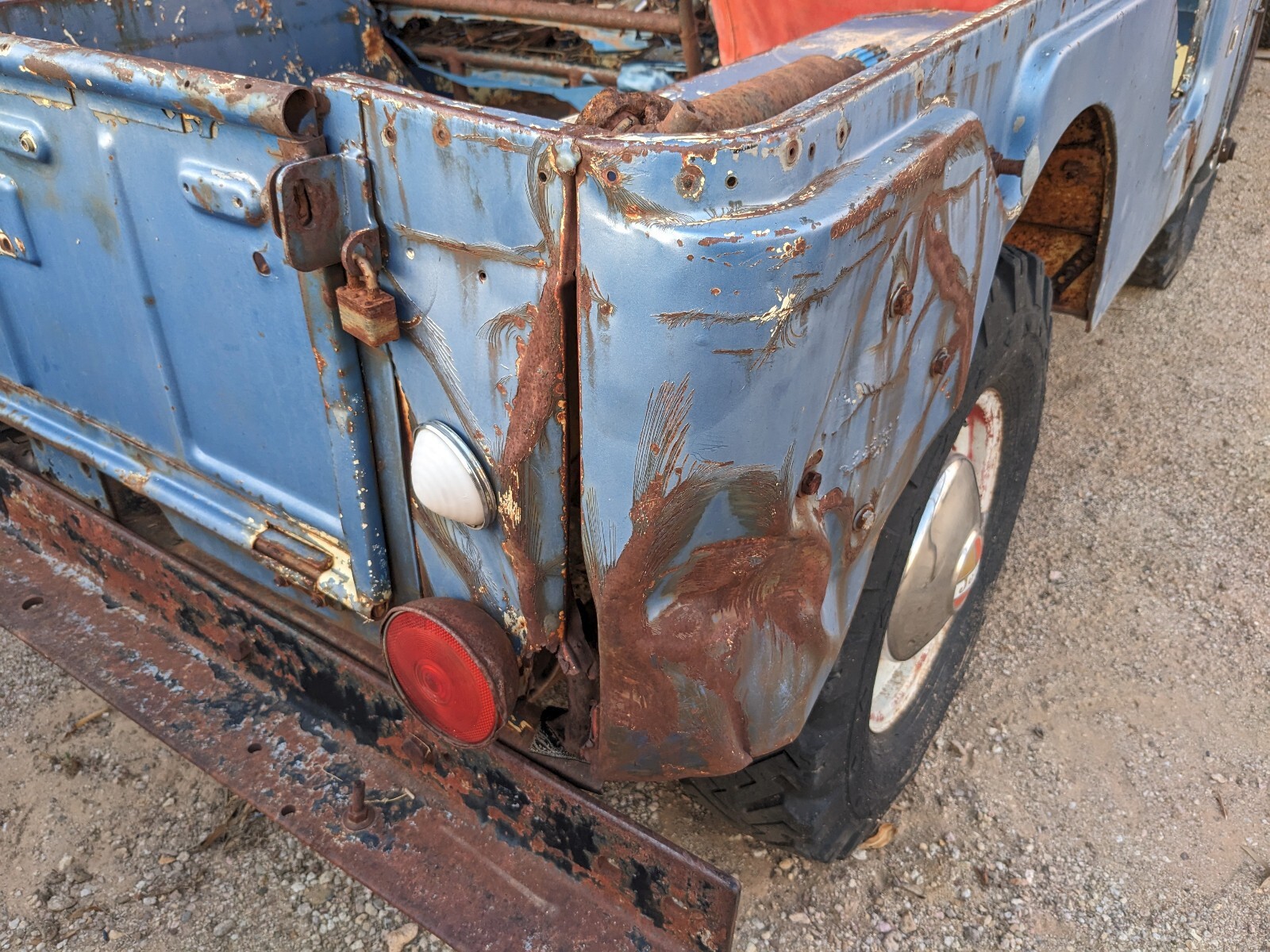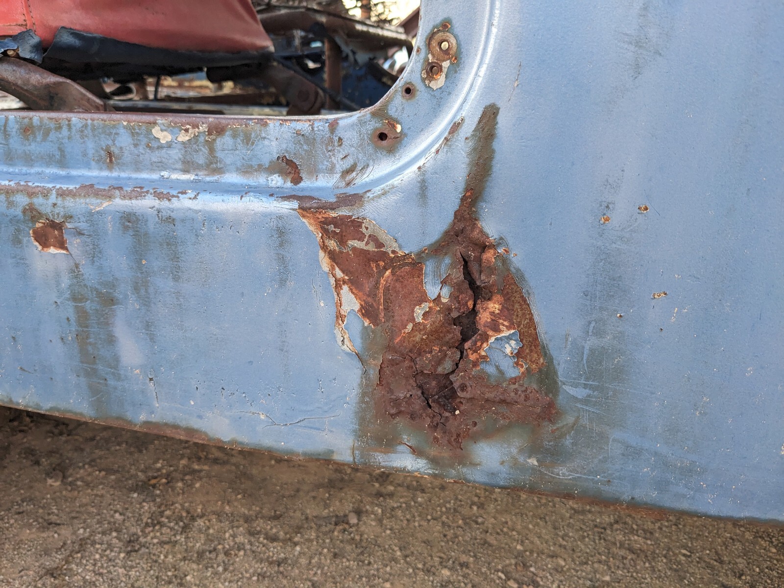 Has rust on passenger side rail near fender as noted in picture. Flat spot and isolated so should be an easy fix.Has damage on the passenger rear corner that appears to be from a tree collision. This one will need more attention as it has a few different types of damage present.In addition to these two areas of damage there is a handful of smaller dents, scratches/scraps present throughout.