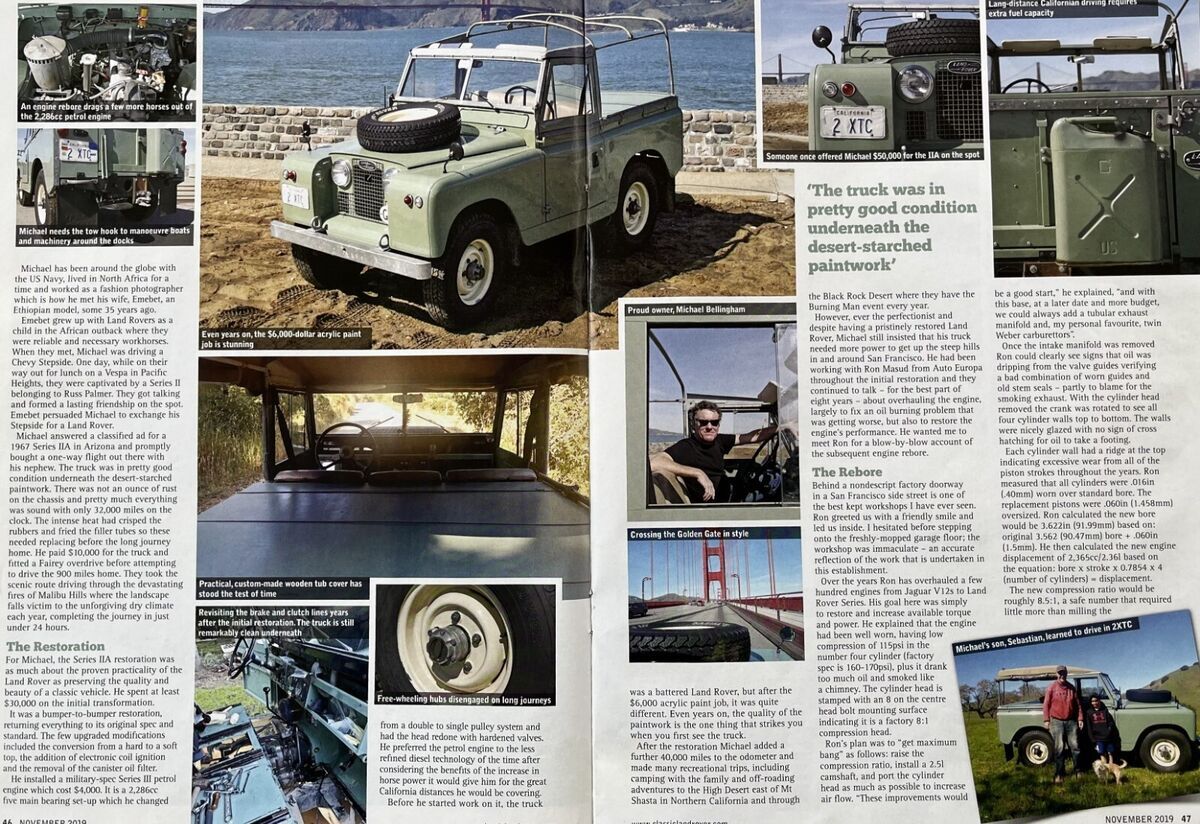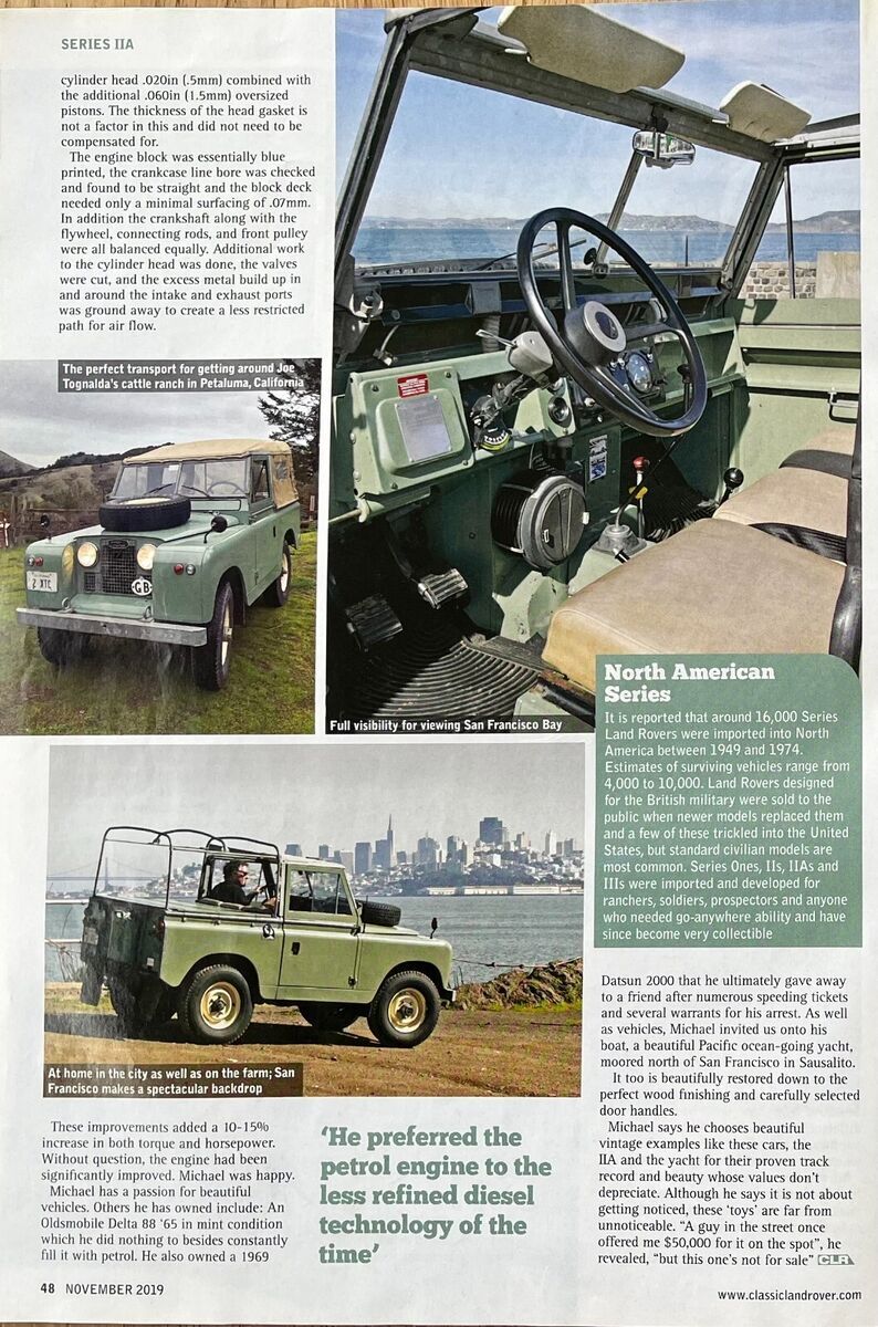 This beauty was the subject of a centerfold article for Classic Land Rover Magazine. It is being presented by Michael Bellingham. You can see three photographs of the article in the photo section. This was one of three articles produced about the vehicle in Classic Land Rover Magazine, over the years. It also won second place at the San Francisco/Presidio Concours D'Elegance.