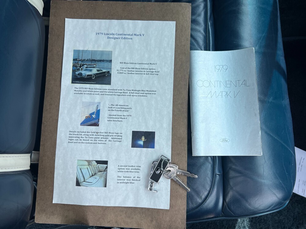 Up for sale is this beautiful 1979 Lincoln Continental Mark V Coupe with the Bill Blass package. This Continental is in clean condition and has a White/Blue exterior with the Blue/White leather interior. This vehicle has just 89k original miles (which is extremely low for this year and engine) and it runs and drives beautifully. This is a really nice, clean, totally original vehicle that was always been cared for by its original owner. I have taken many high quality photos of this vehicle and 2 short videos so you can see what exactly it is that you are bidding on. You will not find another one in better condition, with more options, and more original than this example.We purchased the vehicle 2 years ago from its original owner. The vehicle was always a southern vehicle, so no rust or rot anywhere! This vehicle was always garage kept and still is. The paint on this vehicle appears to be 100% original and there were never any accidents to my knowledge. This vehicle is original right down to the working 8-track player in the dashboard! All of the cars features are working properly, including the ICE COLD AC and the vacuum operated pop-up headlights! The vehicle starts right up and will take you anywhere you want it to go. It steers straight, stops immediately, shifts perfectly, and purs like a cat. This is a turn key car that was maintained and loved since new.This vehicle was very well taken cared of and it shows. This vehicle was always garaged and was never smoked in. You wont find another one as clean or nearly as well maintained. This example is the one to have with lower mileage and loaded with every available option!This Continental is loaded up with all the factory options that you could want. It has the 6.6 Liter V8 engine that is super smooth! It also comes with Bill Blass leather seats, Bill Blass Designer package, AM/FM stereo with working 8-track player, Cartier clock, optional exterior thermometer, optional turbine alloy wheels, white vinyl carriage roof, power trunk release, power seats, remote operated mirrors, power windows, power locks, power steering, tilt steering, AC, automatic transmission and so much more!This vehicle comes with its original keys, original factory floor mats, the original owners manuals and the unused spare tire and jack/tool set. Its all here like it was when it was new.This vehicle was cared for and it shows. No expense was spared on any maintenance that this vehicle might have needed in the past. This vehicle has a nice set of matching white-walled tires all the way at are like new. We just changed the brakes and did a complete overhaul on all the brakes lines and fluids.The exterior of the vehicle is very clean. The body panels are clean and the paint is in great shape and looks to be all original. The exterior is in great condition in my opinion and presents very nicely. Its just a great vehicle and its looks fantastic! You wont find anything but normal wear from age as this vehice is a well preserved original survivor.The interior of the vehicle is very clean and looks awesome. The seats are in great condition and present nicely with no tears in the leather.The dash and door panels are in great condition and clean. The interior is in fantastic condition in my opinion and looks great. There is nothing much to pick on with this vehicle. It looks 100% better than it does in the photos.This Lincoln Continental Mark V Coupe is a beautiful preserved and original classic vehicle and will make someone really happy. You will not find another one that has been treated better and has all of these factory options! Buy this awesome vehicle now before it sells! Summer is fast approaching and the local car shows are awaiting you!This vehicle is being sold as-is, where-is, and there are no warranties expressed or implied. The vehicle is located in my garage in Greer, South Carolina and will need to be picked up there. This vehicle description is my best interpretation on the vehicles current condition. Buyers are more than welcome to see the vehicle in person and bring a mechanic prior to purchasing. When the vehicle leaves ourpremises, the buyer accepts it in its current condition and no refunds will be given. If you would like to see the car and test drive it, you are more than welcome to do so. Also, feel free to ask me about thebuy-it-now price. If you are located outside my local area, I will assist in any way possible in having the car shipped to you at your cost. I know a transport company that can ship the vehicle anywhere domestically for great discounted rates! A $500 non-refundable deposit must be made within 24 hours on the auctions end. The remaining balance must be paid in full by 3 days after the closing of the auction unless other arrangements are discussed with me in advance. We accept paypal for deposits only! We do not take paypal for the full balance of any vehicle. The balance must be paid in cash, certified bank check, or wire transfer.With that being said, feel free to email, call, or text me at anytime if you have any questions or concerns. Thanks and good luck bidding!