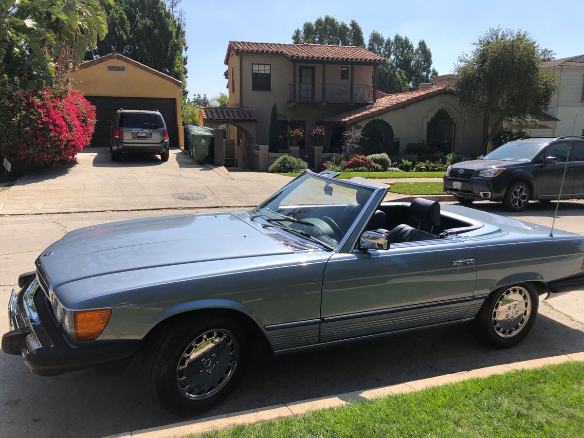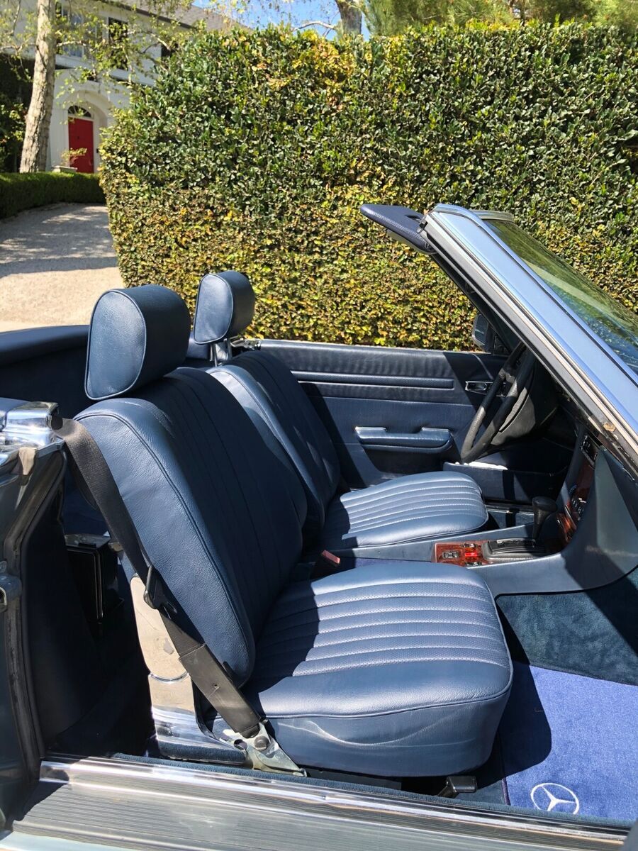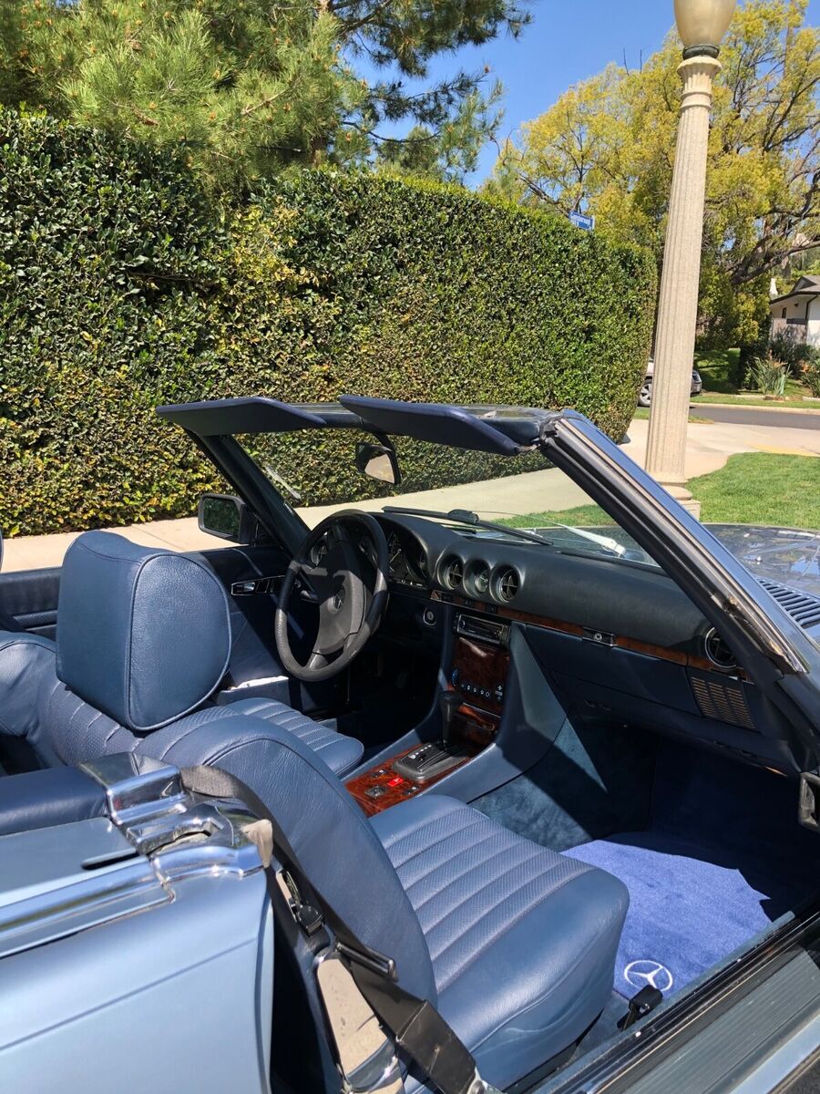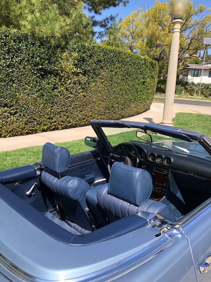 Over $40K in receipts. This car runs, drives and presents beautifully turning heads wherever she goes. A gorgeous Diamond Blue Metallic exterior over navy interior with navy soft top and original hardtop, 560 upgrade chrome wheels with newer Michelin tires, along with the original 'Bundt' alloy rims to go along with in case the new owner chooses a more original look. This car sat undriven and covered for a long time prior to my owning it, hence low 89K original miles. Being idle for so long necessitated a completely remanufactured Mercedes-Benz 380 engine to factory specs by Metric Motors, Inc. and Swiss Motors in West Los Angeles. At the same time, the transmission was rebuilt. Items replaced are too numerous to mention: new MBZ radiator, new muffler, along with a litany of belts, hoses, plugs, wires, pumps, gaskets, brakes, reservoirs, switches, modules. All receipts to back up the work are neatly organized in a binder with newest work at top. Mileage in at rebuild was 84,476. The car has traveled only 5K on the rebuild, so you are essentially bidding on a 'like new' car. There are no fluid leaks. This is a very trustworthy drive for weekends or as a driver. AC works, blowing cold from the two perimeter and center windshield vents. Heat works perfectly. A Blaupunkt detachable face stereo CD and MP3 player is adequate and offers a USB port for newer mobile phones. The front speakers must have been replaced at some point behind orig MBZ grills. Power antenna mast works well. Seats have been beautifully reupholstered in factory correct fashion. Soft top was replaced and has crystal clear windows. An ignition immobilizer and alarm with remote were added for increased worry free security. Dash burl pieces have been replaced in recent years and present beautifully. There is a newer dash cap to neaten up the dash. At some point the car was repainted. The paint on the car is presentable and glossy.I believe the original ABS may be inoperable. I have never explored fixing it because it's not necessary to drive or stop the car.Besides getting the cold air through the center vents, which I have also never explored since it's not my main daily driver, looking ahead (in about a year or so) it would be good to add new shocks. The car drives perfectly fine now, but I feel it's good to mention everything I know.Along those lines, this is a 40 year old great German classic car. I love it and hate to be parting with it now, but remember that while it looks good and drives great, it's not perfect. Buying a car like this is a commitment. I believe I have done all the heaviest lifting for this car to have a new lease on life for another generation. Surely there will be things a new owner will want to take on in the future, but whoever gets this car is seriously fortunate to step into all the work done in the time I've owned it. I believed I would have her forever.Besides the 4x original rims, original Becker stereo, master key, 2 alarm remotes, books and records, winning bid gets a garage cart for the hardtop complete with cover for it when the hardtop is not on the car, which for me has been always.