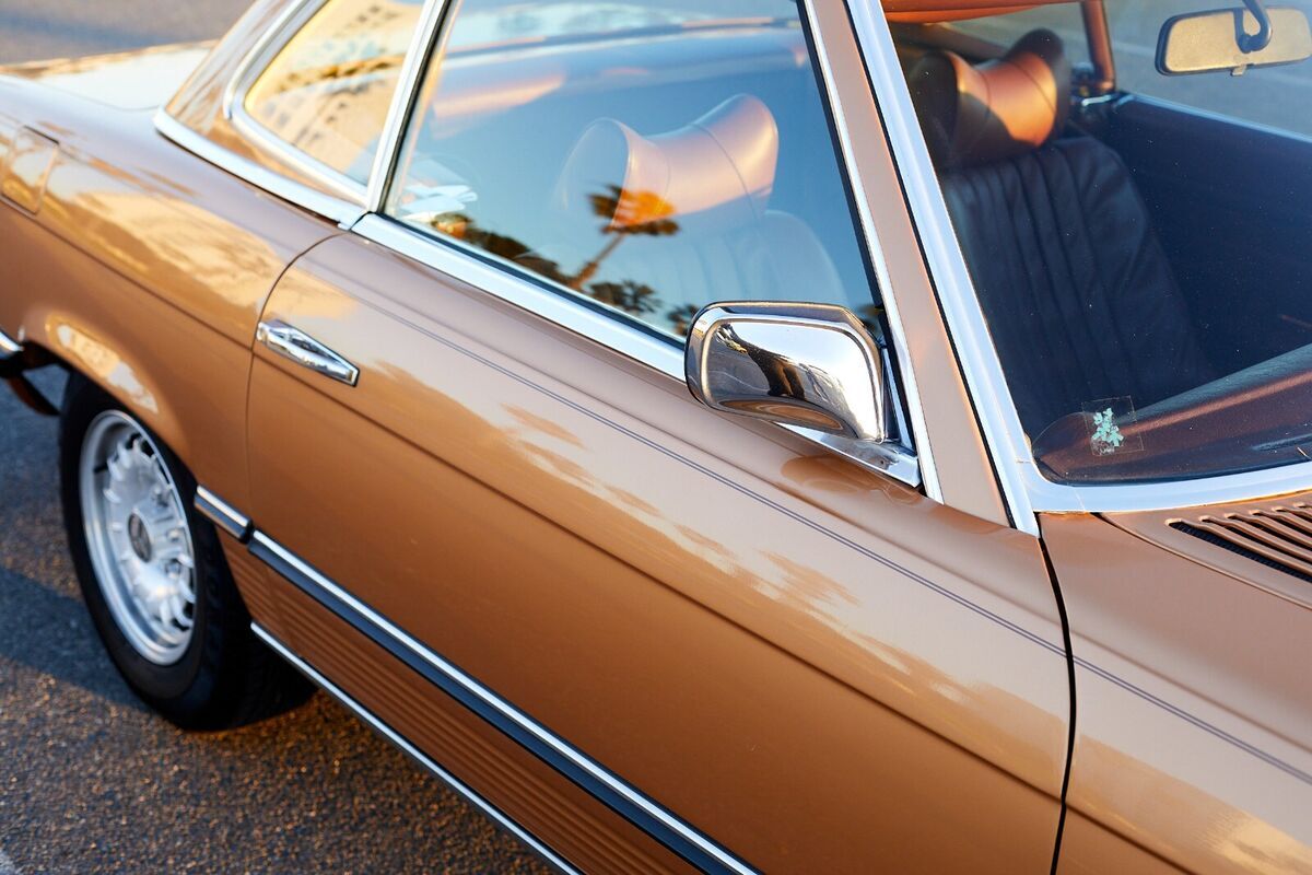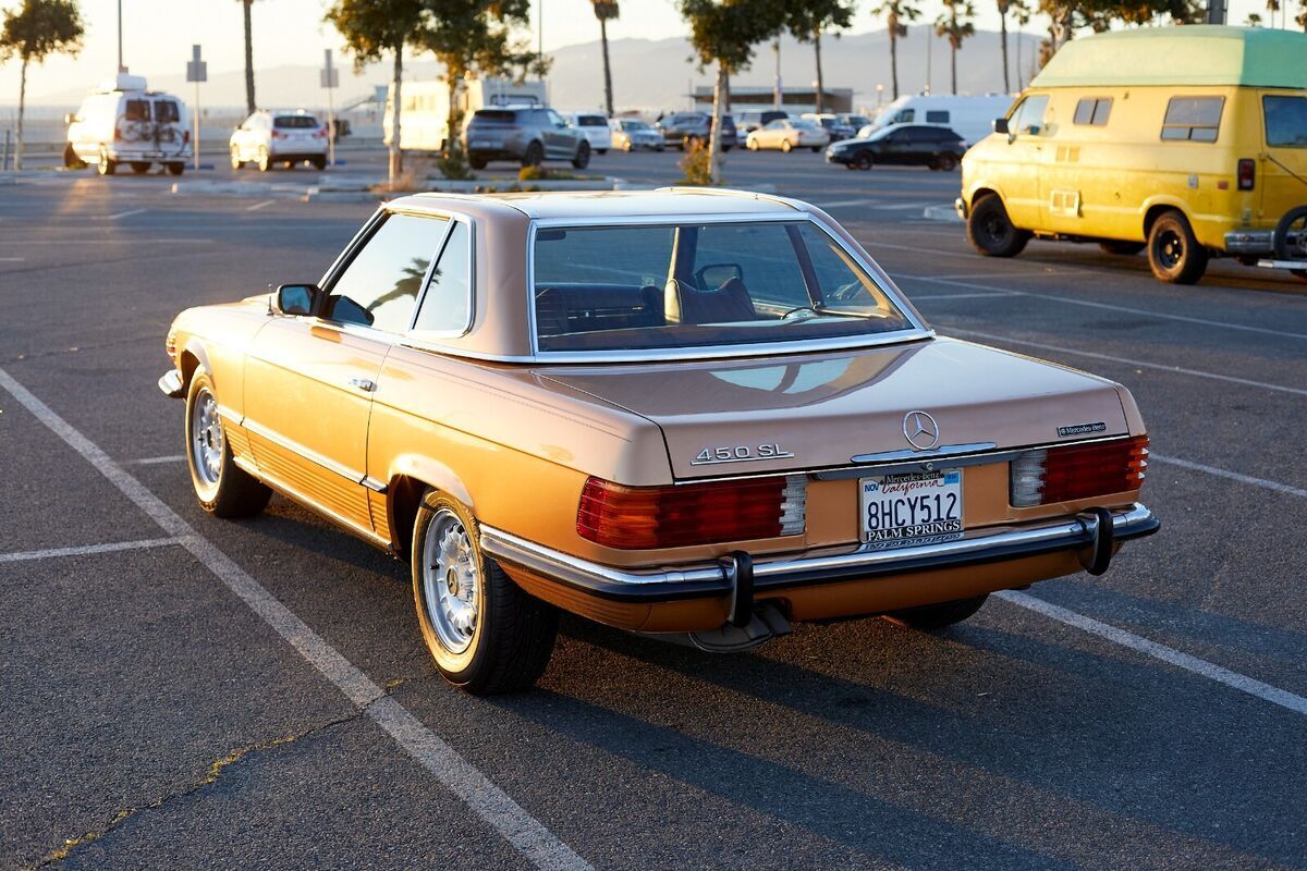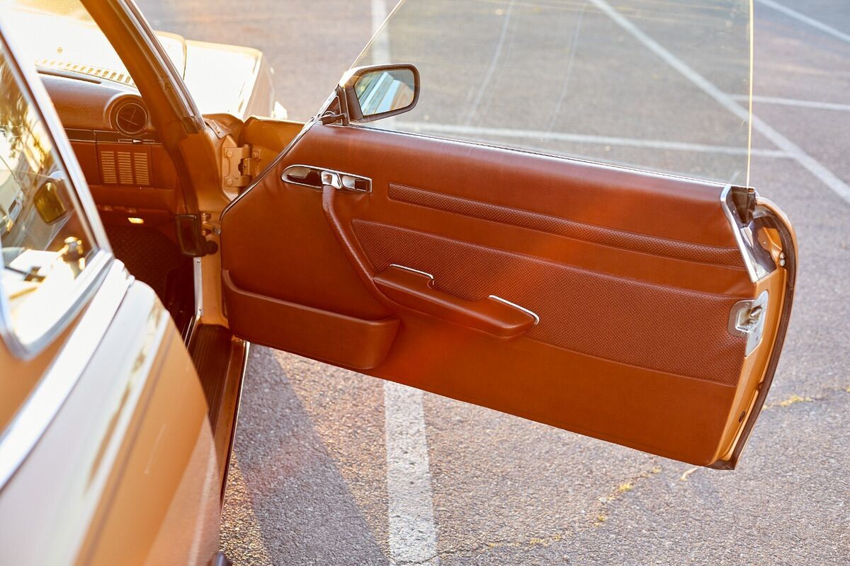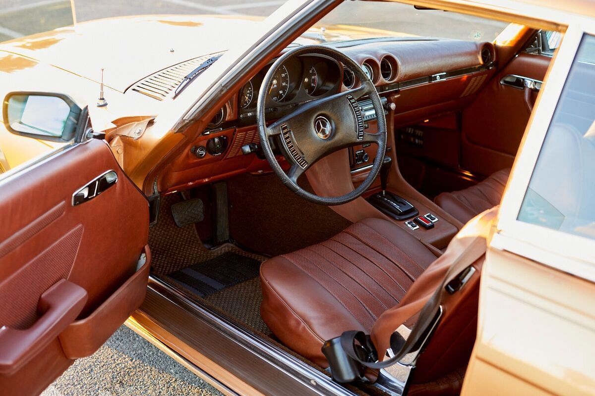 1973 Mercedes-Benz 450SL Convertible that is featured with 2 tops (comes with BOTH 1 hard top, 1 brown soft top) and finished in its factory color Byzantine Gold Metallic (422) complemented with a brown interior.