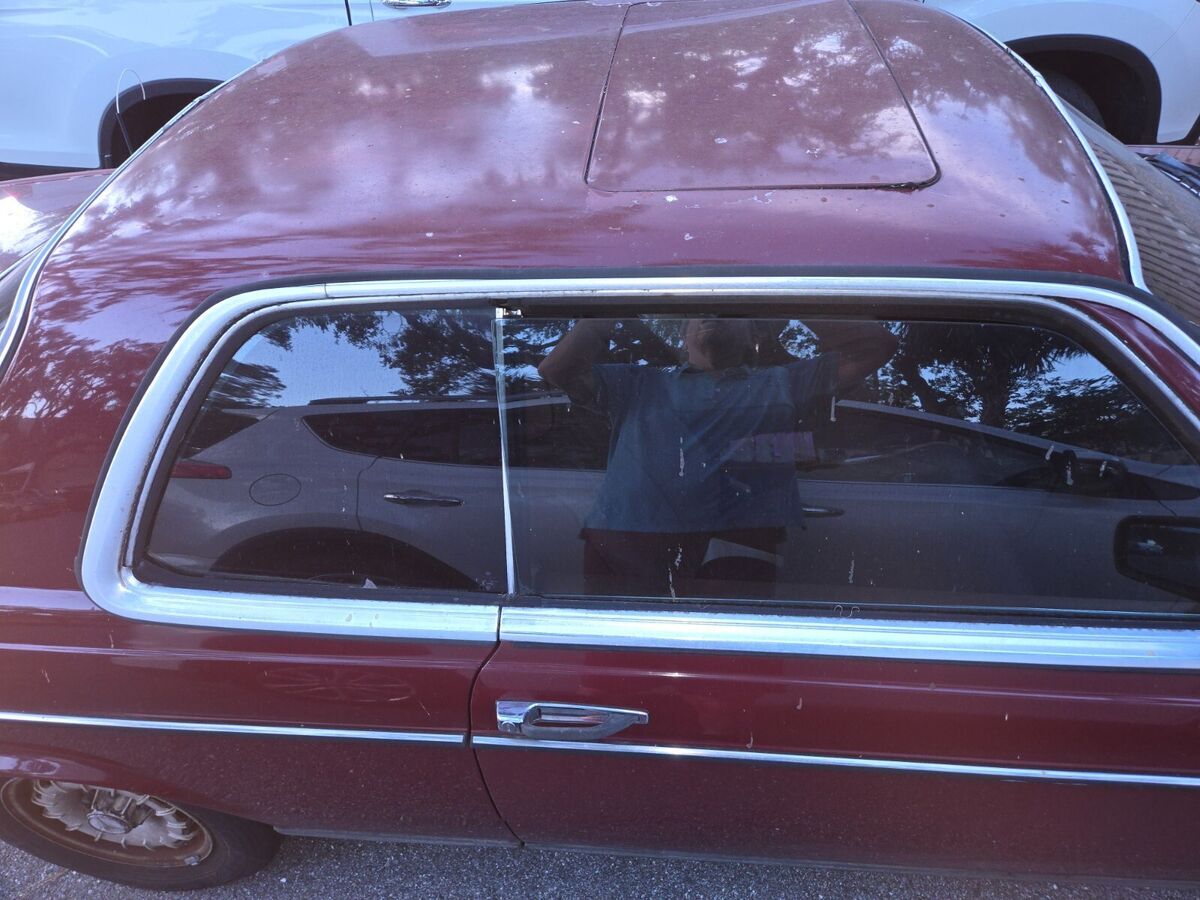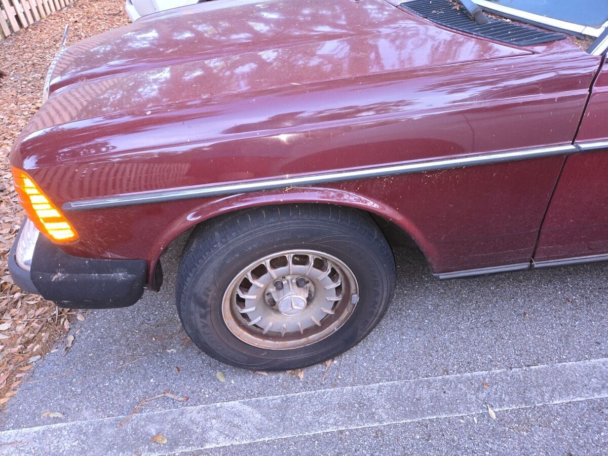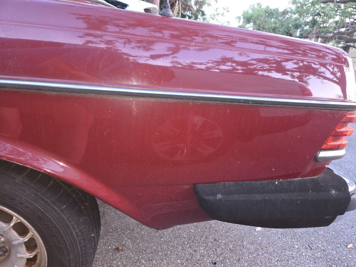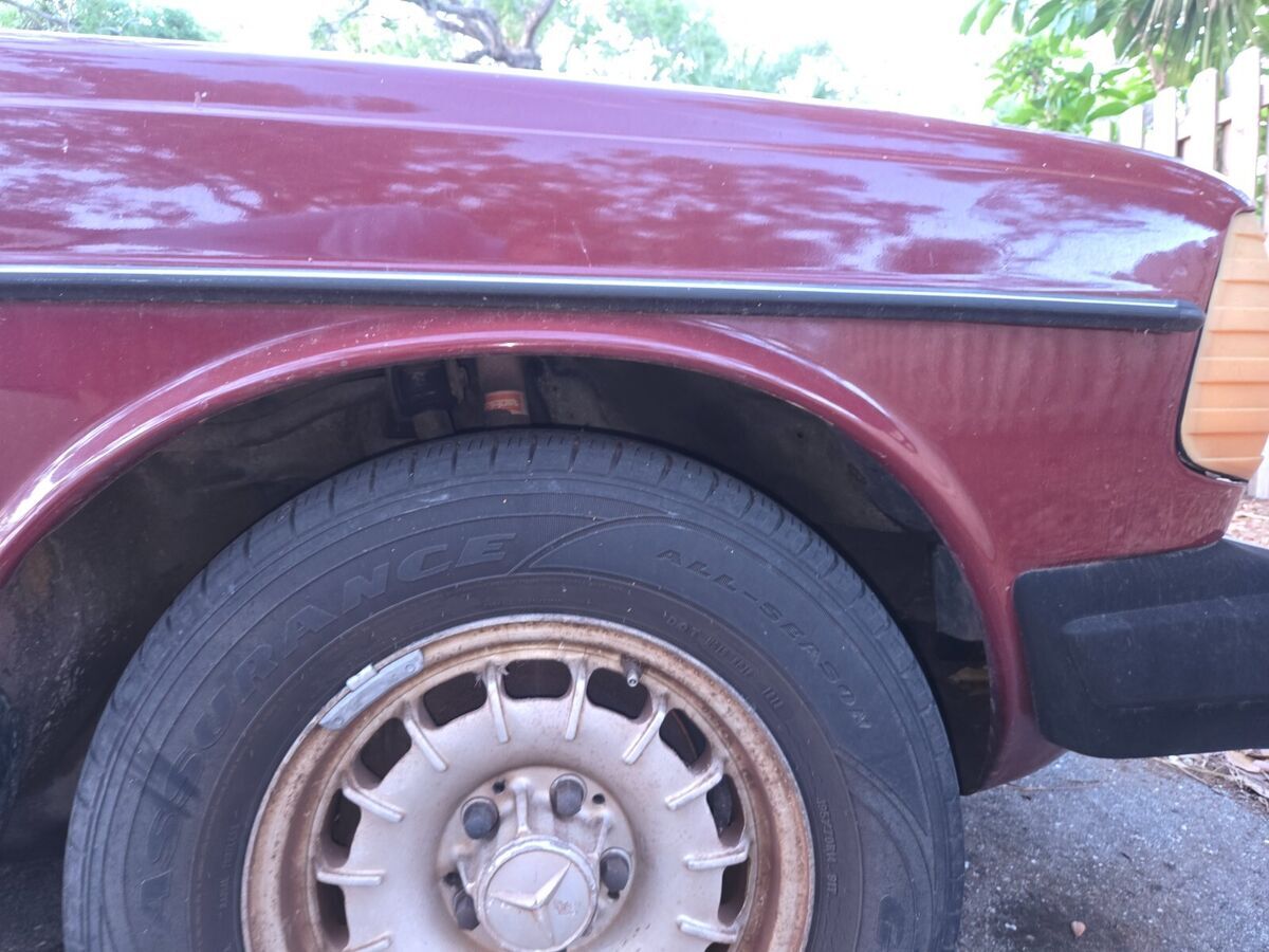 My daily driver until November, when the transmission went out; it hasn't been driven since. Well-maintained before that, suspension and brakes are good, no body damage, it's a joy to drive. Transmission must be rebuilt or replaced. Engine starts and is strong; starter is balky, it can take a few jolts from the ignition before the engine turns. "Chinese Red" is MB's term for the color, which looks like maroon to me