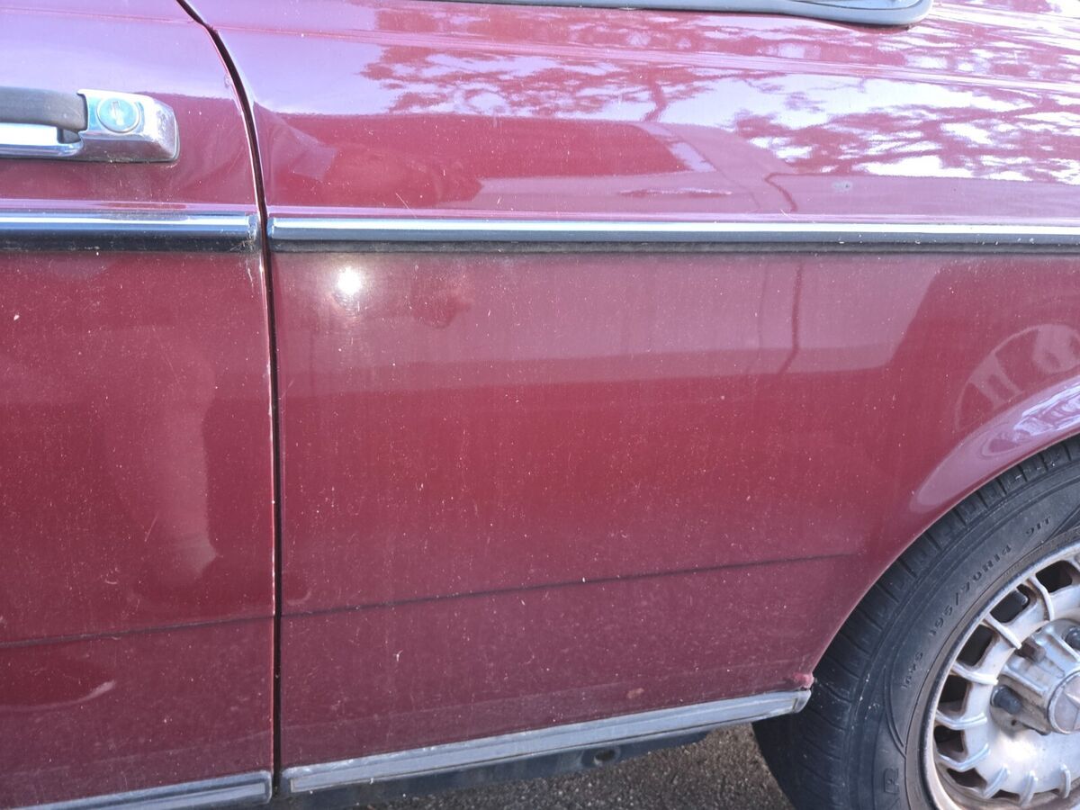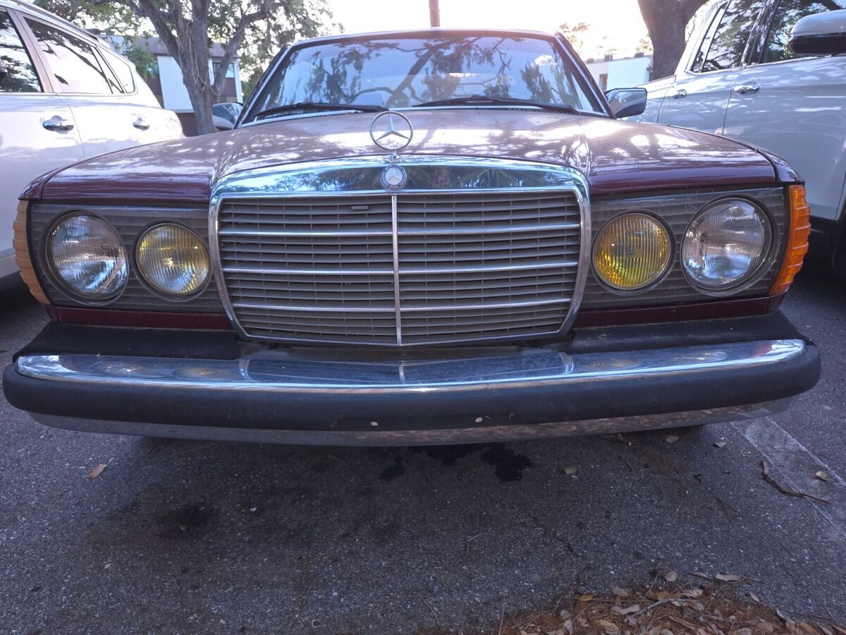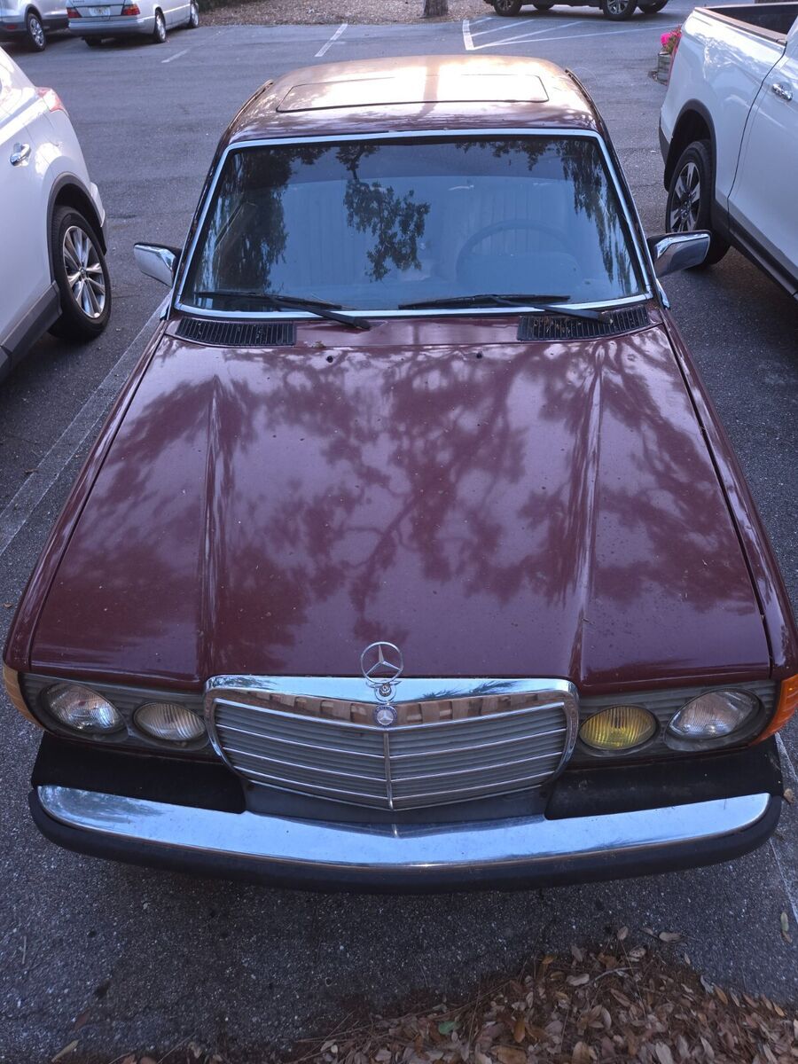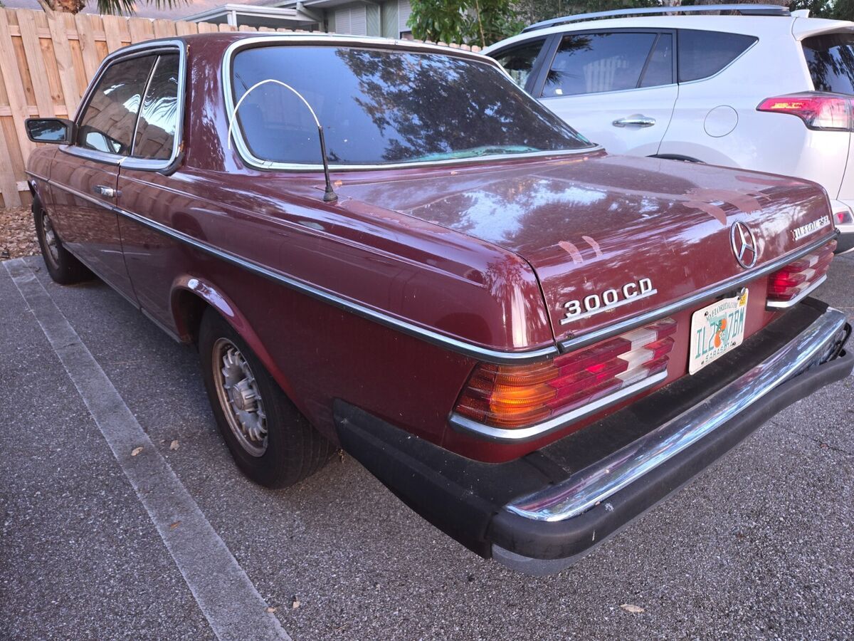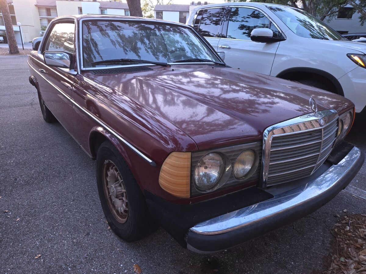 My daily driver until November, when the transmission went out; it hasn't been driven since. Well-maintained before that, suspension and brakes are good, no body damage, it's a joy to drive. Transmission must be rebuilt or replaced. Engine starts and is strong; starter is balky, it can take a few jolts from the ignition before the engine turns. "Chinese Red" is MB's term for the color, which looks like maroon to me