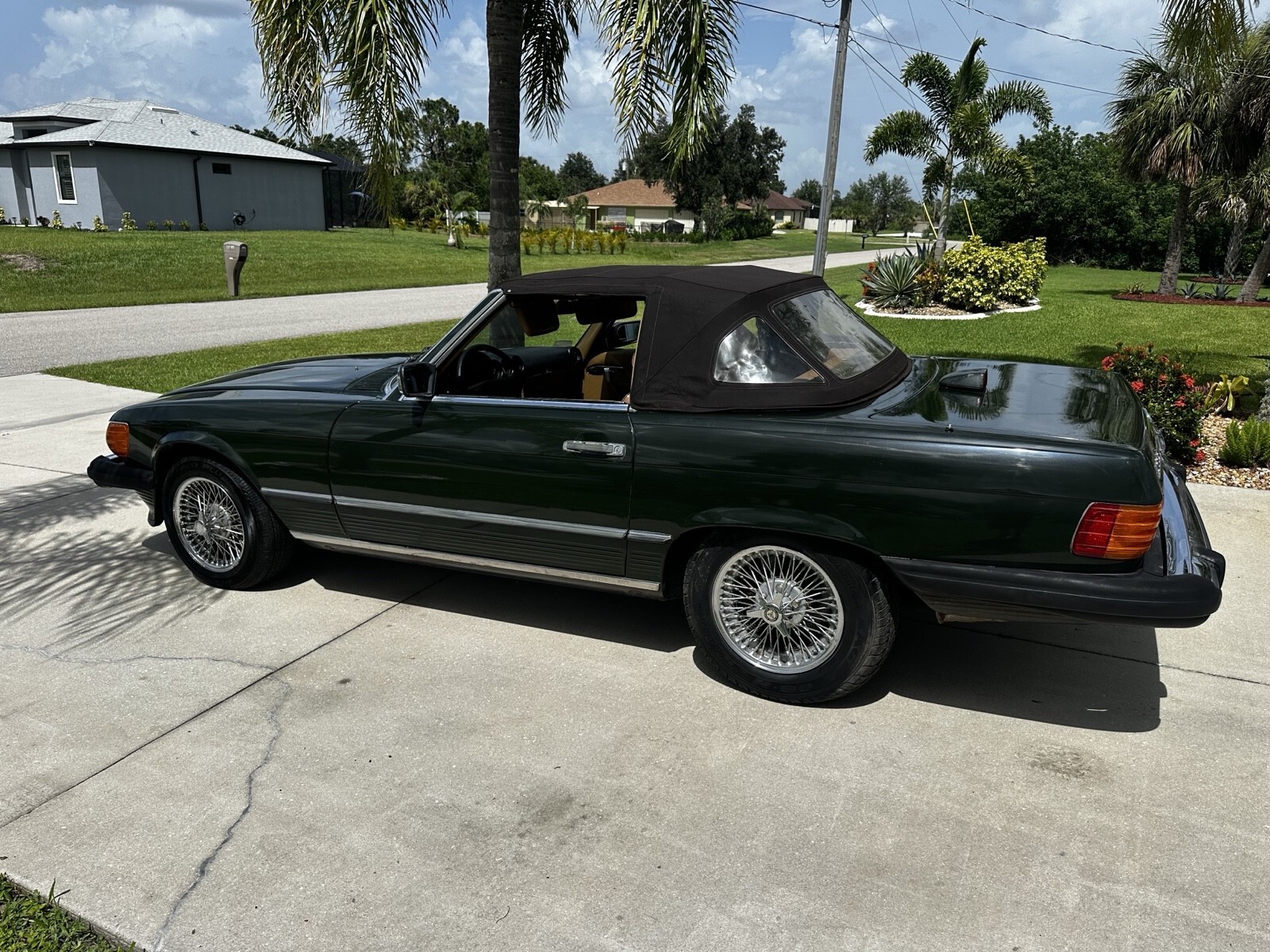 1986 mercedes 560sl . Rate Forest Green color. Got this car from my uncle few years ago and it was sitting in my house for years . Driving occasionally around the neighborhood sometimes. Then the tires go bad and I have no time drive it anymore. Decide to make it running again and my mechanic change the fuel distributor and idlovanlve control and some other stuff like fuel pump and filter and car run again. Definitely project car . Seats will need to be reupholstered . The good think is the car have no rust on body or floor . Only rust I can see is the exhaust cover shield. Paint will need to be buffed . Car stop and driv, but tires are shot . Definitely need some service and fluid change and new tires to make it road worthy. Ac not workin, but blower work fine. This is a car for someone who know how to work on older mercedes and looking for rust free car to restore or just fix and drive . Clean Florida title on my name . Car is sold a is . Local inspection welcome and recommended. Original window sticker and paperwork and metal data plate from dealer when car was bought brand new.