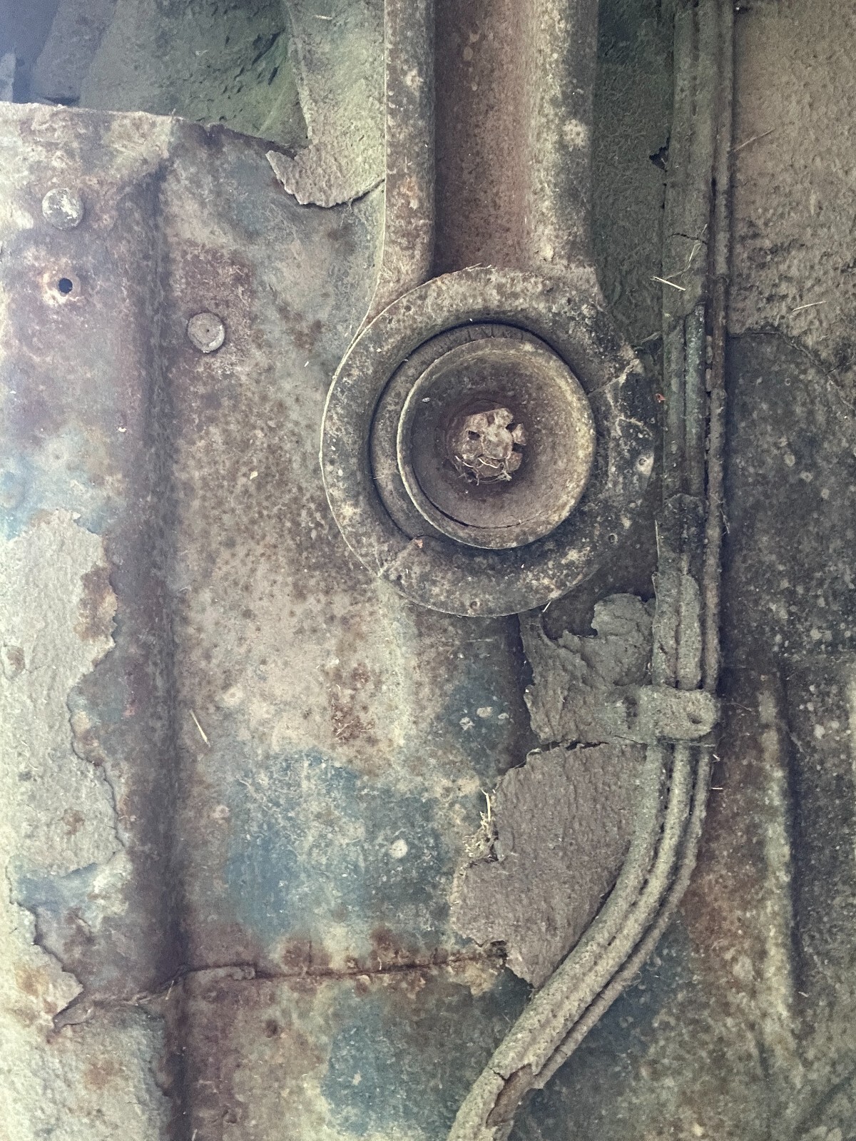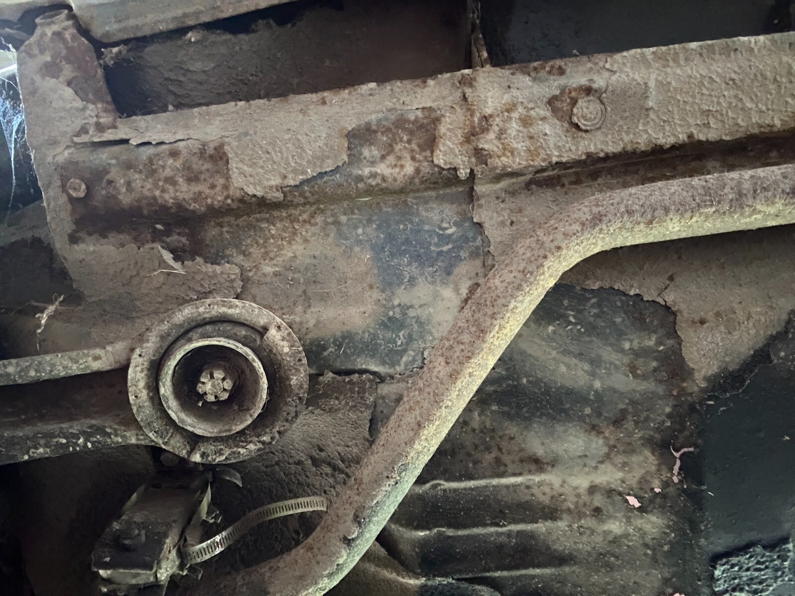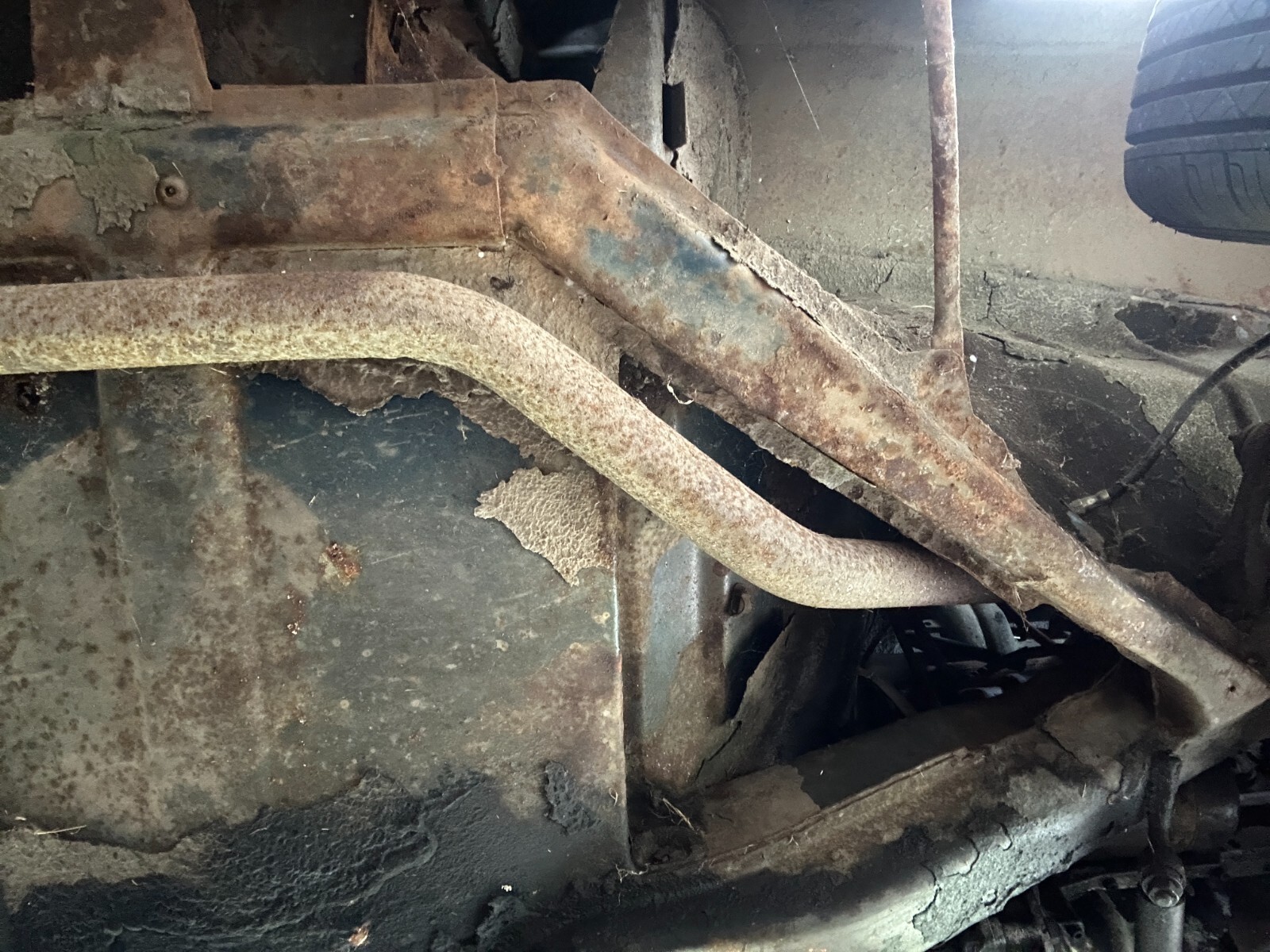Very straight with typical rusted out floor panel under driver’s feet. Trunk is solid even in spare tire wells. Needs master brake cylinder work so no brakes, must be towed.