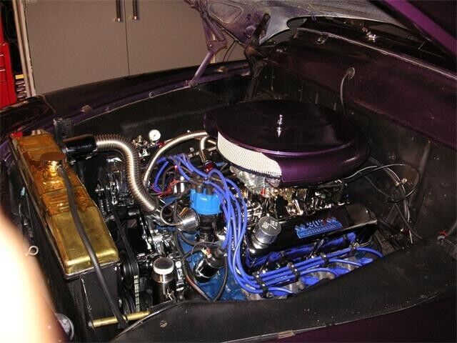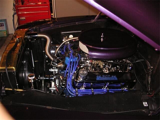 MECHANICALS: 1951 Mercury Custom 2 Door Leadsled, powered by a completely detailed and chromed Ford 302 Hi-Performance V8 and a smooth shifting Ford C5 3 speed automatic transmission, fueled by a Holley 650 4 barrel carburetor, Cadillac air filter and electric fuel pump. Rear end is a 2:60 ratio, great for cruising, front end is Mercury. Coil springs in the front and leaf springs with steel blocks in the rear. Monroe heavy duty shocks in front and rear. It has power steering and manual brakes with an old school dual exhaust with quad sparked gasoline flame throwersignited by (4) exhaust mounted spark plugs and Model T coils. An electric fan with 2700 CFM power cools the 4 core copper radiator with polished brass top tank. Electrical system is a modern Ron Francis WireWorks 12 Volt harness and fuse boxwith mini-fuses. Car also has a "Priority Start System"installed on the battery so you will always have enough power to start the car, even if you've left the headlights or the neons on at a show. Electrical power is supplied by a 100 amp alternator with low speed 650 RPM cut-inand (for full electric power at idling speeds),a trunk mounted high CCA 12 volt battery. INTERIOR FEATURES: Cadillac power front leather bench seat with center divider and safety belts with rollups. Interior is in Ford parchment (white/beige) with purple piping and has a full headliner. Rear area has a custom tonneau cover which allows for storage and a clean 2 seater look. I have acomplete '66 T-Bird wrap around opera style back seat with all trim and rear deck upholstered and painted to match, separate and ready to install, included with car. The car is fully carpeted in black loop pile carpet with"show and go" front floor mats. The dashboard and door trim surfacesare air brushed in purple and black. Dash has purple/white laminated tear drop knobs on all features. Also, all gauges are included and functional (temperature/oil pressure/voltage/fuel/vacuum and combination speedometer/tachometer), in antique beige Autometer products. It also has a remote controlled 4 speaker stereo CD player mounted thru glove box, with CB unit right below it. The CB unit usesthe drive in movie speaker and has a coiled cord microphone and a detachable rear antenna (at the license plate)for use when traveling distances. The smooth shifting Ford C5 3 speed automatic transmission is controlled by an old schooltall floor shifter with matching laminated tear drop handle. The car also comes complete with an interior mounted Kidde fire extinguisher and first aid kit. When backing the car up, there is a manually activated switch which turns on a recorded message which plays thru an external speaker. It warnsanyone behind the car "Attention: This Vehicle is Backing Up" and repeats automatically until turned off. This is a nice safety feature for chopped Lead-sleds. The tilt steering wheel is from a '67 Impala and matches the interior, complete with Marilyn Monroe suicide knob.