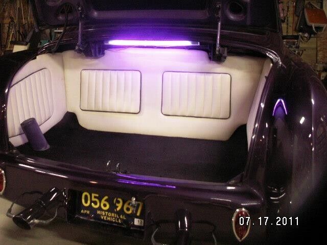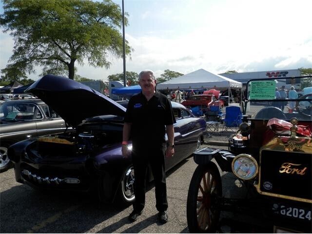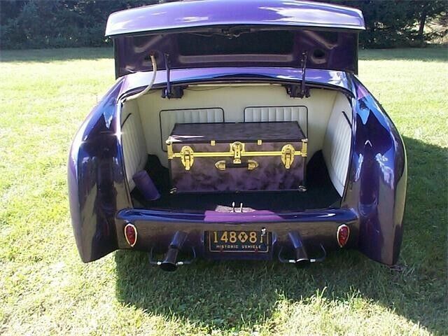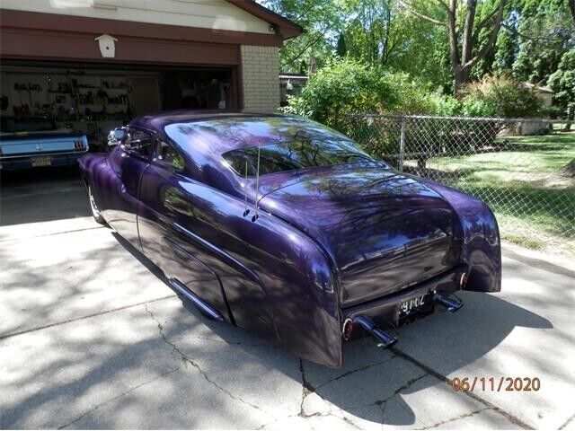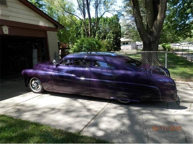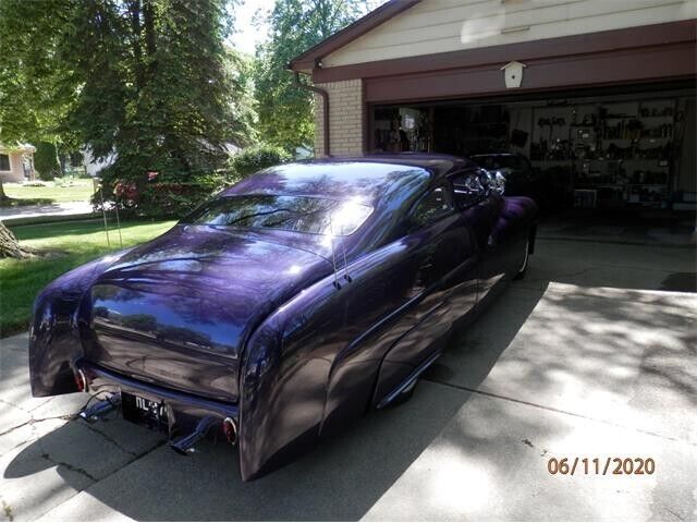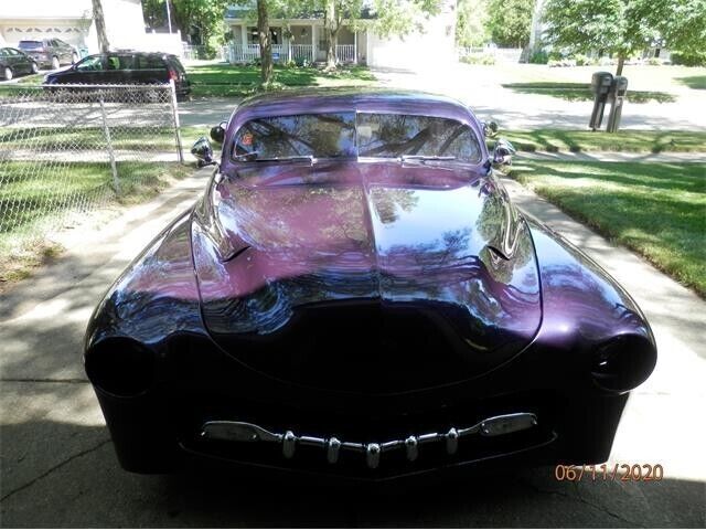 EXTERIOR FEATURES: Dark Grape Metallic base/clear paint is like glass and gorgeous on a very straight no rust steel body. The roof has been chopped 51/2" and offers great headroom inside. Body is dropped and channeledfor a sleek looking ride which is a definite head turner. Headlights are frenched in 5 1/2". They shine like two spotlights down the road at night. Thequad rear mounted antennas are also frenched with one antenna power operated from dash board. The door handles and trunk handle are shaved and operated by key fob with poppers for the doors and trunk has foot controlled popper. Tailight lensesare devil face "El Diablo" with blue dot eyes. Body is steel withrounding, decking and nosing in key areas. Frontgrilland turn signals arefrom a '53 Desoto. Hubcaps are Dodge Lancers. The rear wheels arecovered by removable original NOS '51 Mercury steel skirts painted to match withnew rubber seals, The car has true purpleNEON light tubes in the grill area, wheel wells, trunk and interior, controlled from dash.Also installed are old school Mercury insignia halogen workingspotlights with ivory handles by Unity (REAL,NOT DUMMIES). In thetrunk is a matching air brushed removable storage trunk which I use to hold my cleaning materials. High mounted brake lights are installed in the interior rear, visible thru tintedrearwindow. Full glass front windshield with variable speed wipers. Old school eyebrow air vent/scoops cutout in hood each side. All vehicle manuals and wiring schematics are included and several additional items go with the car which can be discussed when purchased. Also included with the car is a 12" x 17" photo album with historical data and over 100 photographs of the car since the first owner in it's custom form. The photographs also show the car when it was body-worked, chopped, primed and painted, throwing flames and more. Ihave attached a video so you can hear theSmithy mufflers rumble as well as the turbine like front cooling fan. Runs and looks great. Car was in the Auburn-Cord-Duesenberg Museum in 96-97 (Documented) before it received it's current update.