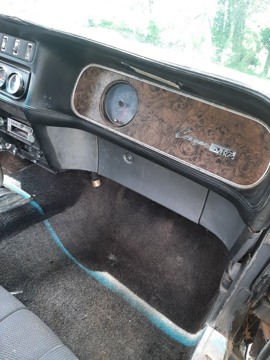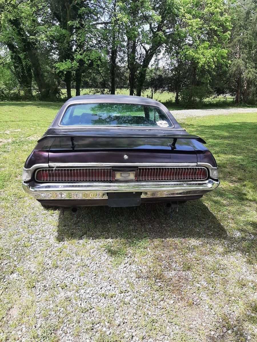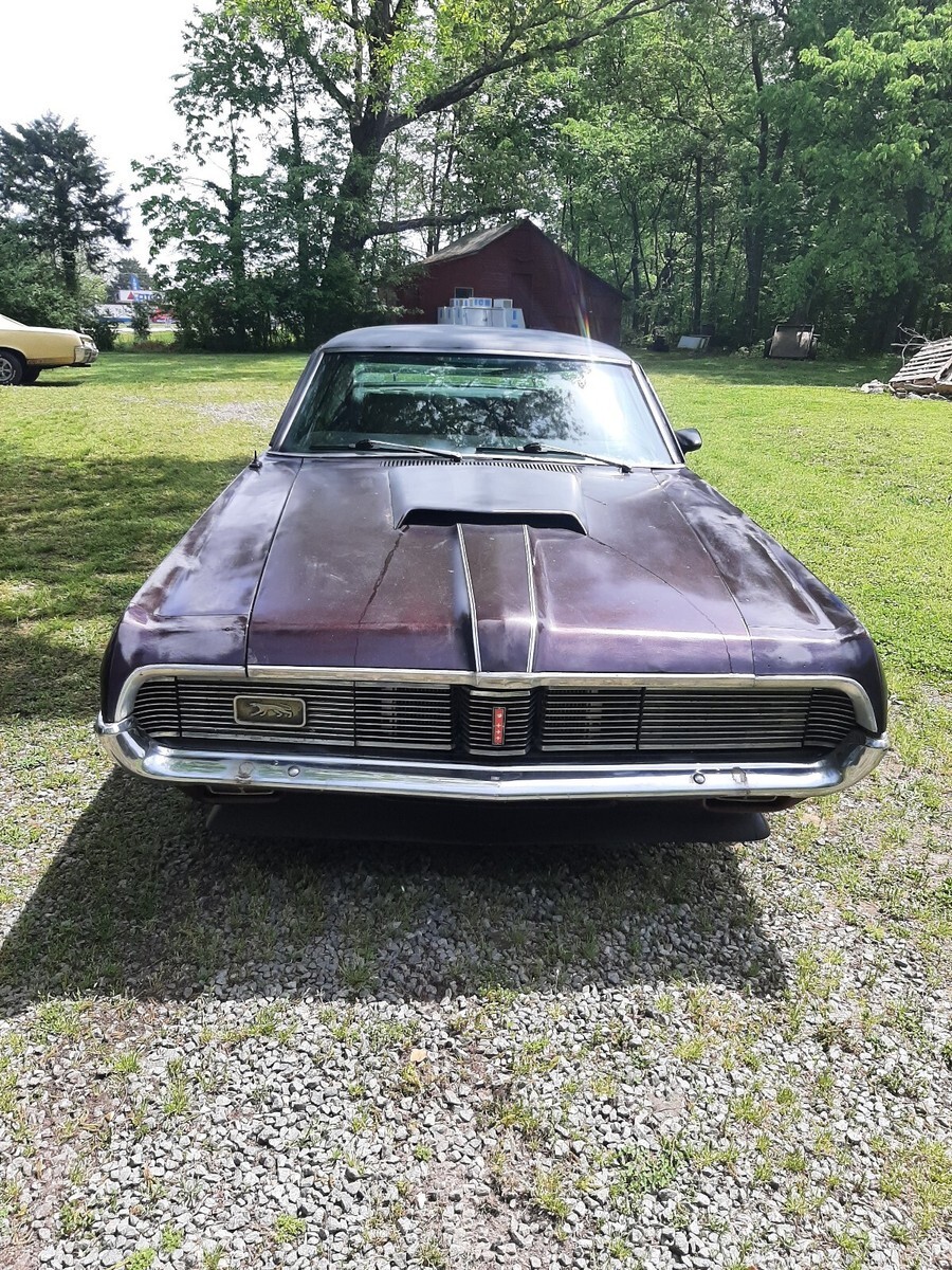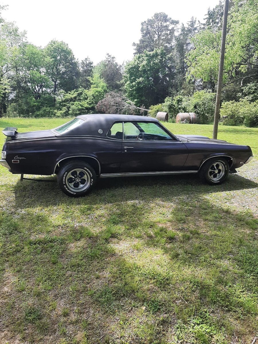 1969 Mercury Cougar XR7, 351w engine and automatic transmission, PS PB, car has only 61500 original miles, runs excellent, does brake, but Needs a brake booster, leaking vacuum. Solid frame, solid floor and trunk pans, only rust I found is a couple of holes on lower quarters by the back tire and under the trunk. Dont know if it's original paint, plus the front end squeaking noise. Clean South Carolina title. Glass is all good, the windows work. But front ones need adjustments or something, don't close all the way. Looks like the car was a vinyl top car. Has an HEI distributor, new gas pump, starter is new, but might need a shim. What it needs, brake booster, turn signals don't work at all, clock and tachometer don't work. All lights work, including interior lights. Doors need adjusting, car runs smoothly and shifts gears easily.