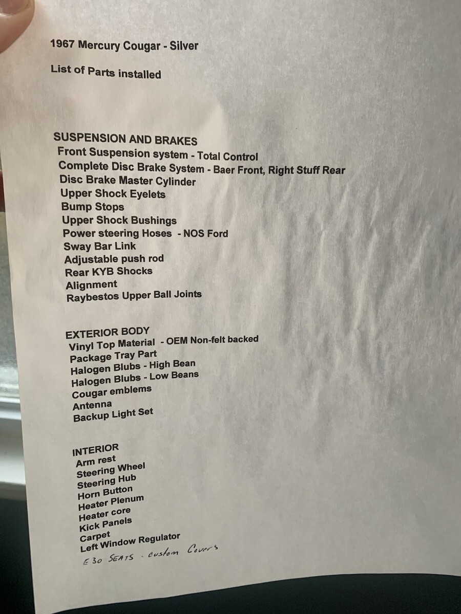 1967 Mercury Cougar 351W/T56 RestoMod!351W, mild build @350-400hp,T56 5sp trans swap. Hydraulic clutch.4 wheel disk brake setup (Baer up front)Power steering.TCI front tubular suspension with coiloversCustom redone Recaro front buckets to match the stock pattern.New black vinyl roof, new carpet.(Please see pics of build details listed!!)Car was professionally built by Cascade Classics near Seattle Washington, I had it shipped to NJ sight unseen due to their reputation!Car has been sitting for about 2-3 years so it will need a new battery and new fluids, as well as a good detail in and out. Car will clean up beautifully as paint is still really nice.Has two small rust spots starting on both sides of rear quarter panels by the bottom from sitting.Car will come with Brand New electric door conversion kit and new front modern style headlights, and a new cover. Car is being sold AS IS with no warranties implied or given. I’m re-listing the car again as the last buyer (end of last year) gave me a small deposit but couldn’t get the rest of the funds to complete the sale. His loss lolVehicle will not leave my possession until paid in full or certified check clears my bank.