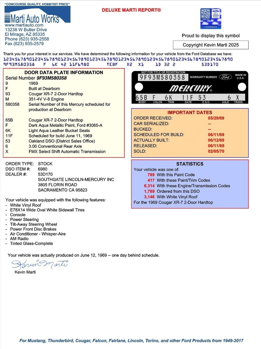 Up for auction is this 1969 Mercury Cougar XR7. This car used to be my late Uncle's car. He used to travel around to car shows and win awards and just have a great time with it. I took many photos for you to look at and have more that wouldn't fit into the listing. If you send me your email I can send you all the photos and the file to all the receipts along with a short video of the vehicle running. It runs and drives exactly how it should for a best of show car. I have 107 pages of digitized receipts valued at over $26000 my Uncle has spent on this car over the years including THREE ENGINE REBUILDS. You will be amazed at how much time and money went into the vehicle over the past two decades. The stock motor is a 351w 4 barrel and is fresh with only about 7k miles on the latest rebuild. Taking the time to view the receipts will give you a much better understanding on what parts have been updated to make this a best of show car. NO CRACKS OR DISCOLORATION ON THE DASH BOARD!One of the photos in the listing is the MARTI report for this classic. Shows you all the specific information about the build and where it was sold and on what day. Be sure and check it out and you will see that this car is one of only 417 ever made with this RARE Dark Aqua/light aqua interior trim combo. Pretty cool...The car is located in Northern California in the city of Elk Grove. Just 36 short miles away from where this car was originally sold (Stockton). If you are looking for a turn key classic DO NOT allow this to pass you by without at least checking it out. If you want to see it in person in Elk Grove that can be arranged.Everything on the car works as it should except for the clock I'm told. The headlight covers work, the AC blows cold, the motor is solid. If you want a good running classic that won't leave you stranded then consider this Cougar. These just don't surface in this condition at this price point.Please email any questions and I'll answer then as best as I can. I'm not a car guy like my Uncle was but I'll do my best to answer your questions as they come in.A $500 non refundable deposit is due within 24 hours after the sale is made. The remainder in person at a local bank in Elk Grove.Link to 107 pages of digitized receipts (copy/paste)gofile-3658365356.us1.quickconnect.to/sharing/UDussFcPs