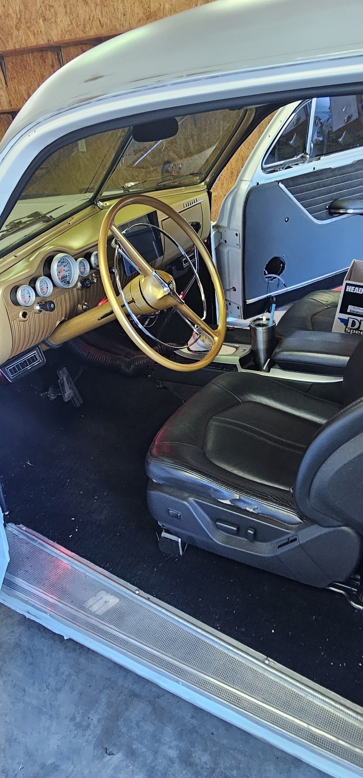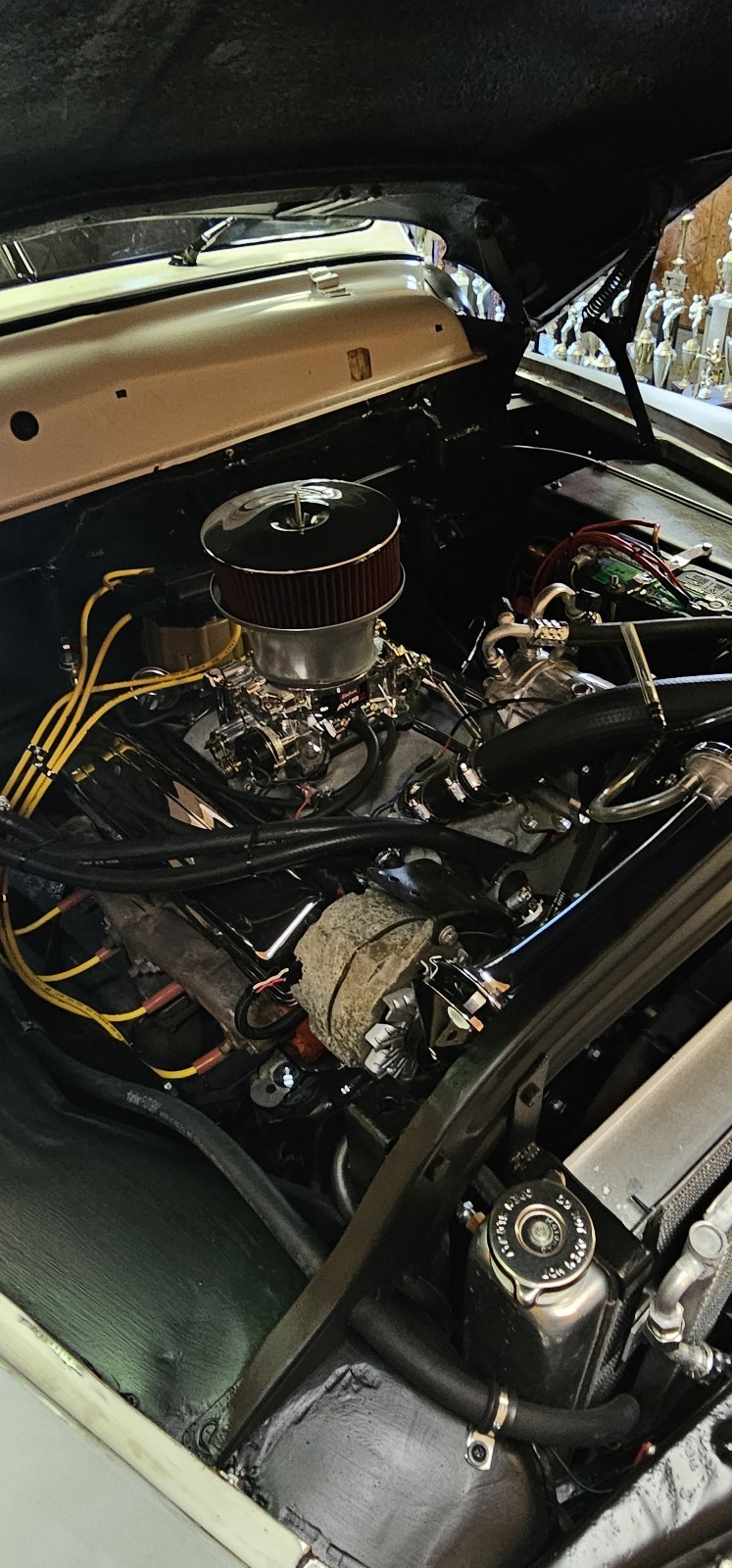 350 automatic, just rebuilt transmission, new power steering, new disc brakes all the way around, new tires, new thermostat switch, rewired, new starter, currently installing new suspensio, a/c heat, all black trim.