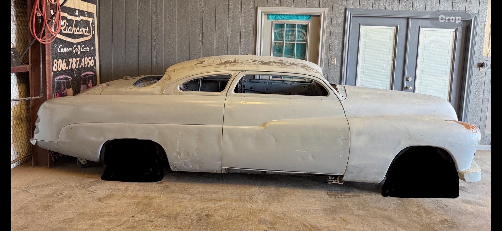1951 Mercury chop top with 50 back glass, sloped b pillars, 4” chop. Have 71 Pontiac Grand Prix frame and floor same wheelbase (popular conversion). Have clear Texas title in my name. Located in Lubbock, Texas. Call for more pics 806-787-0257