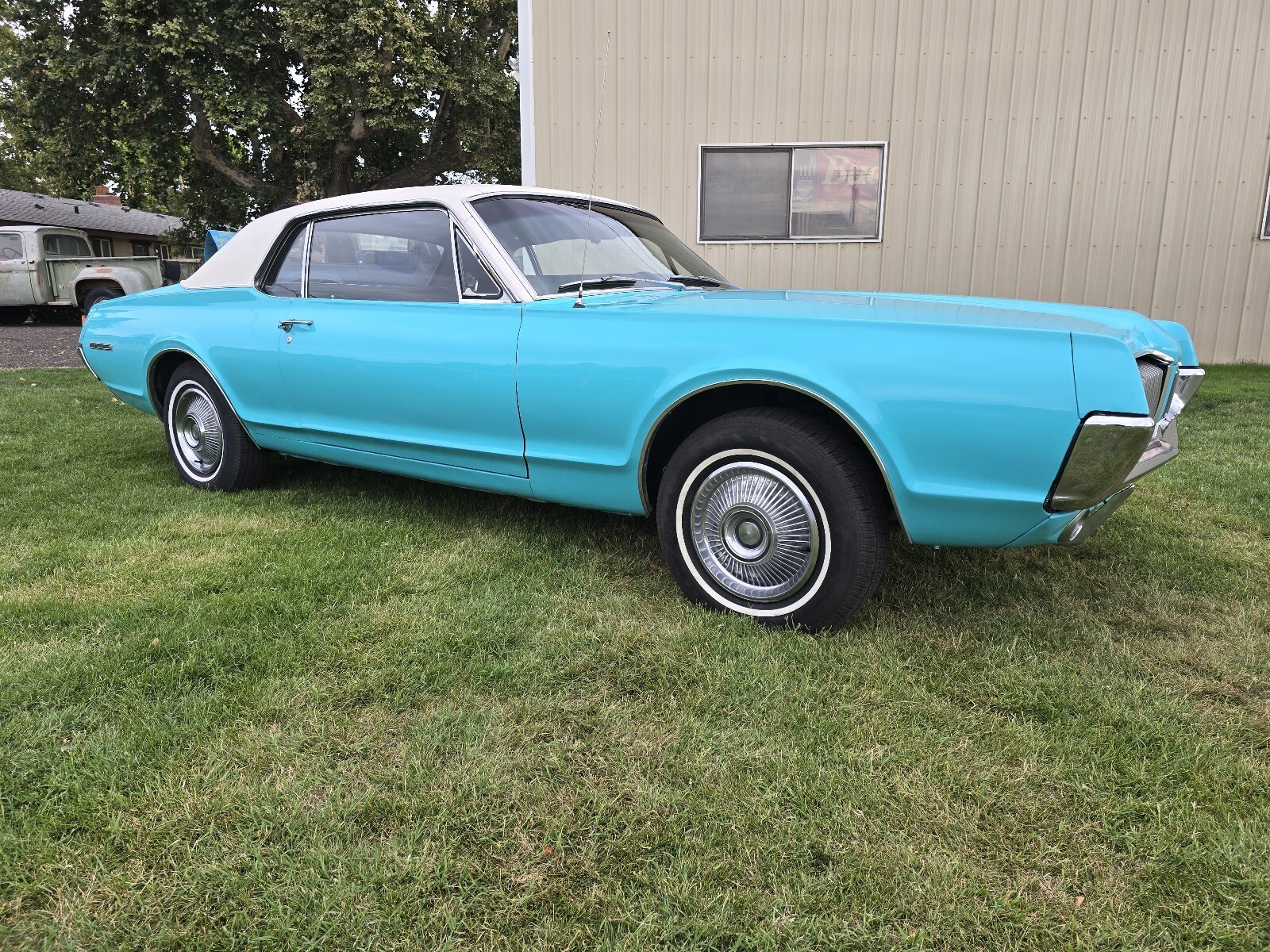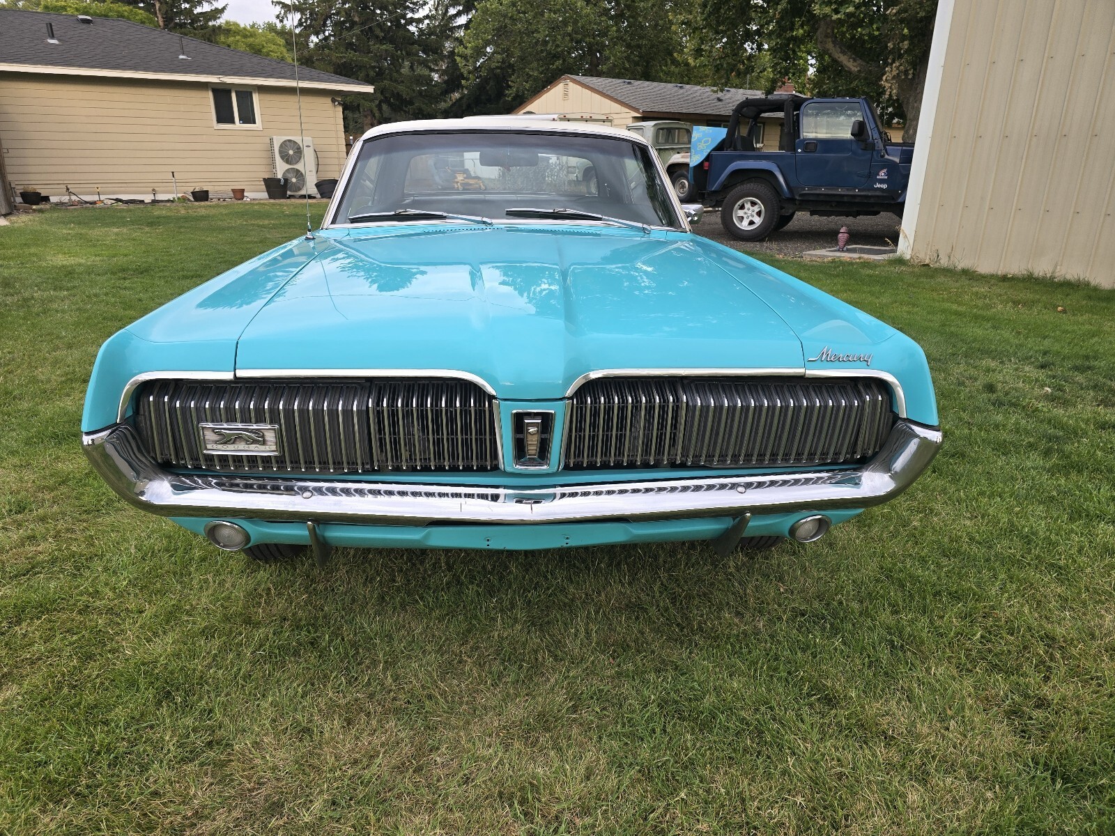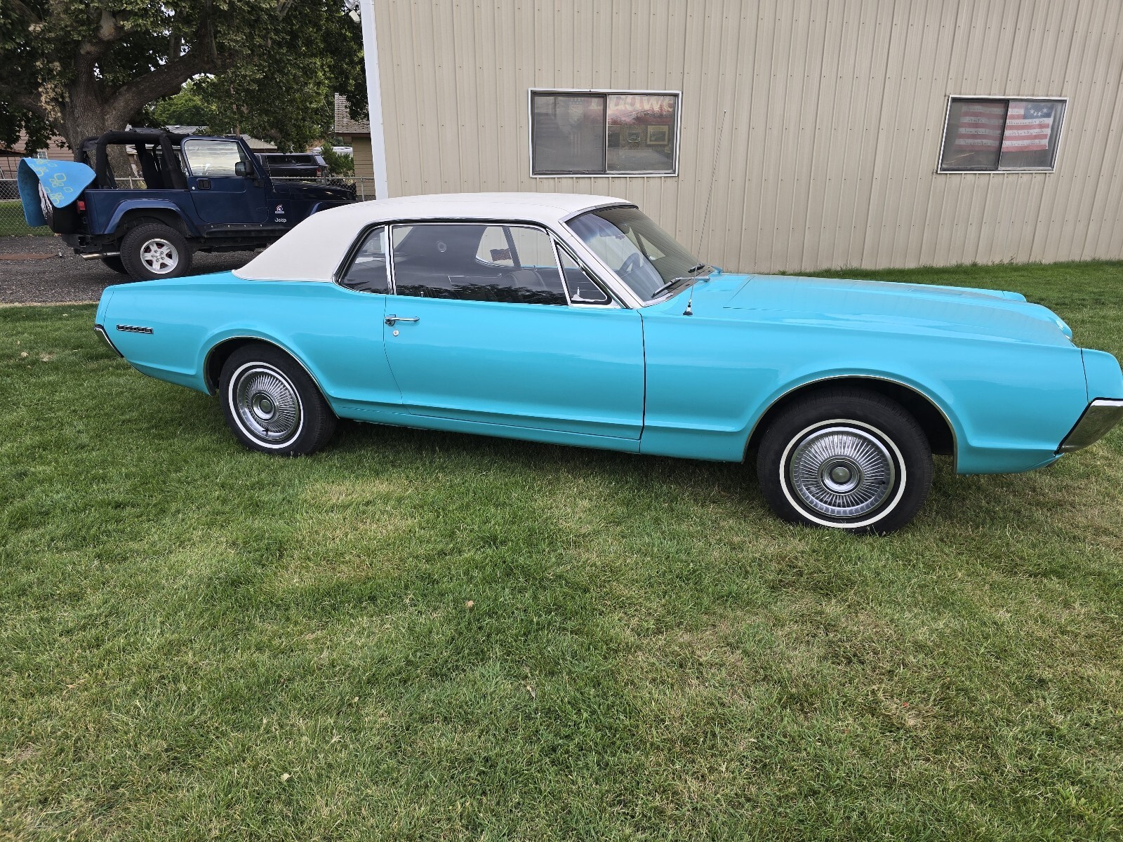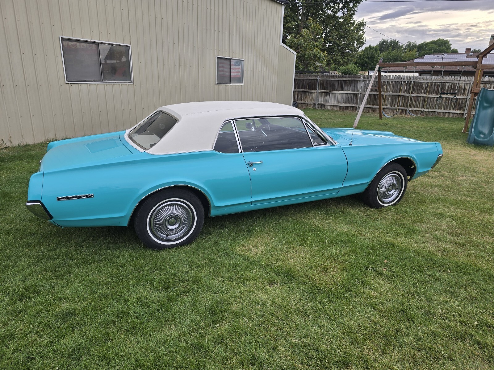Nice all around 1967 cougar in a stunning turquoise green with white vinhl top and black leather interior, kept in stock form and just very well cared for over the yrs