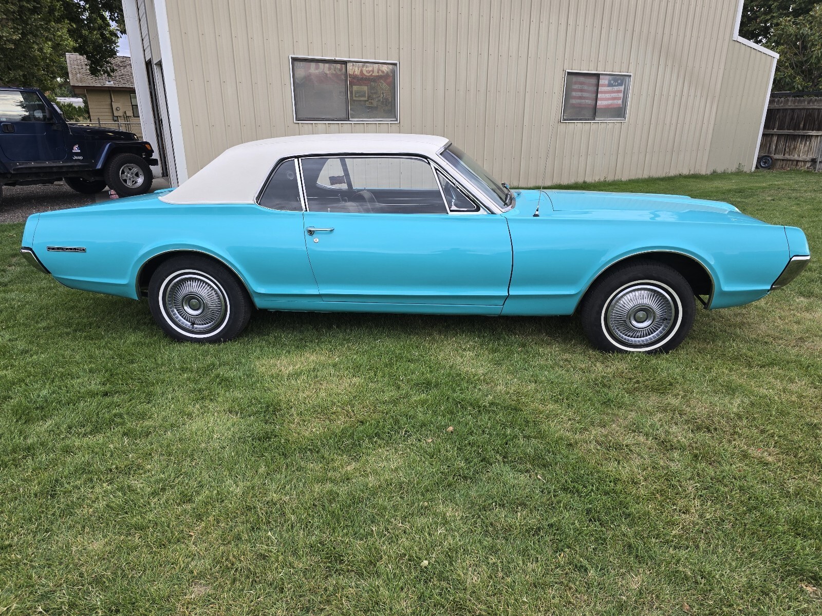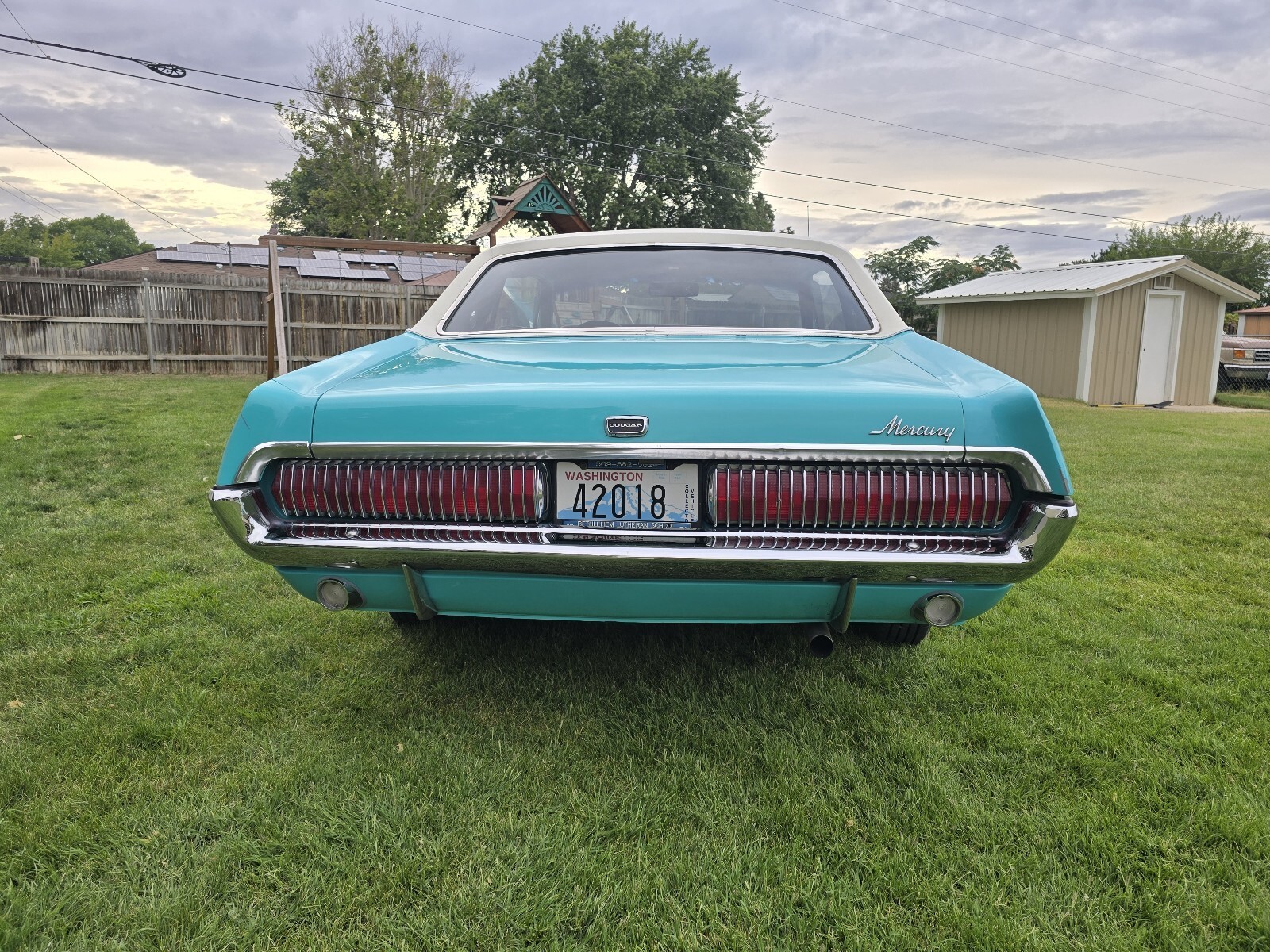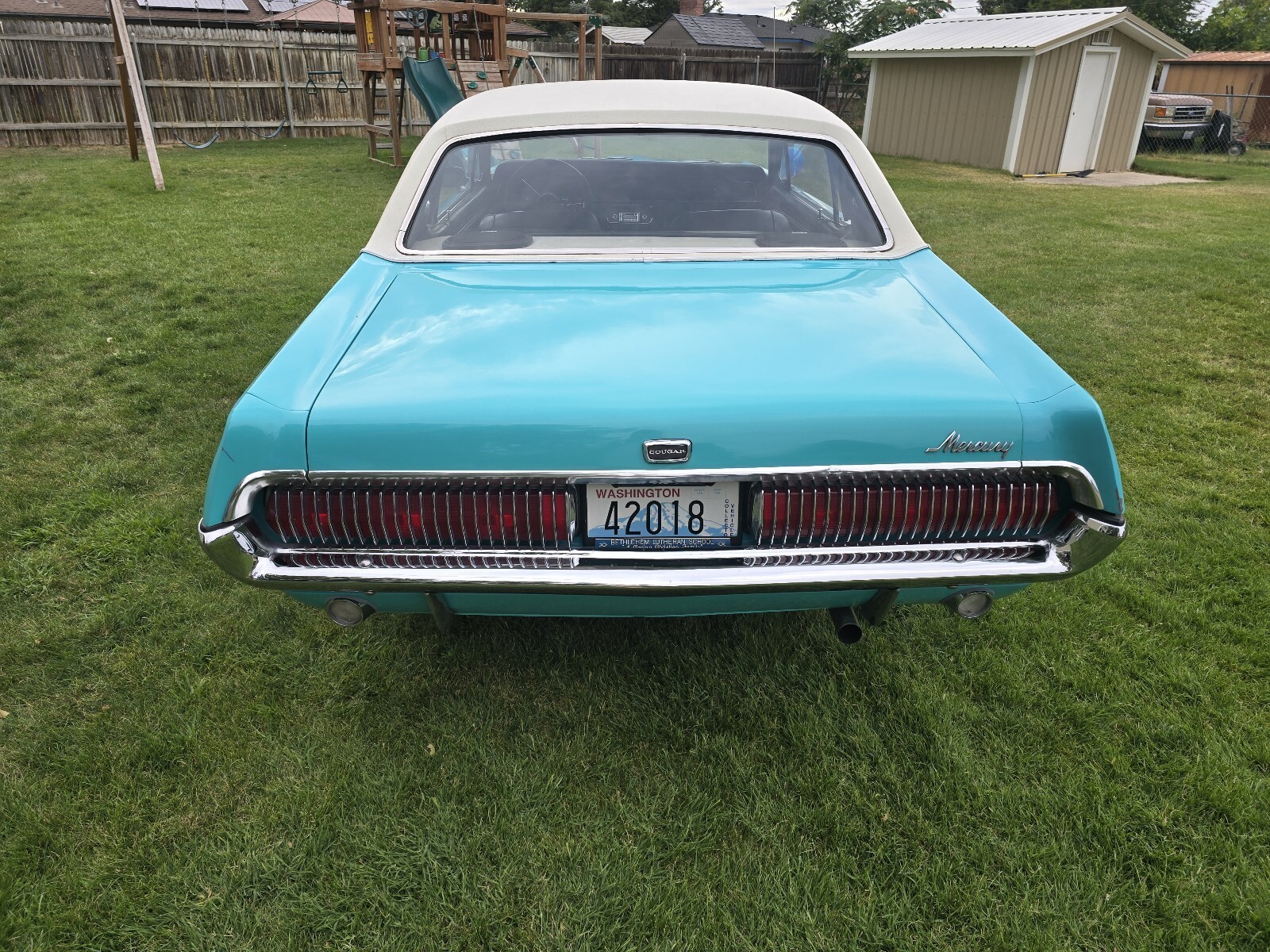Nice all around 1967 cougar in a stunning turquoise green with white vinhl top and black leather interior, kept in stock form and just very well cared for over the yrs
