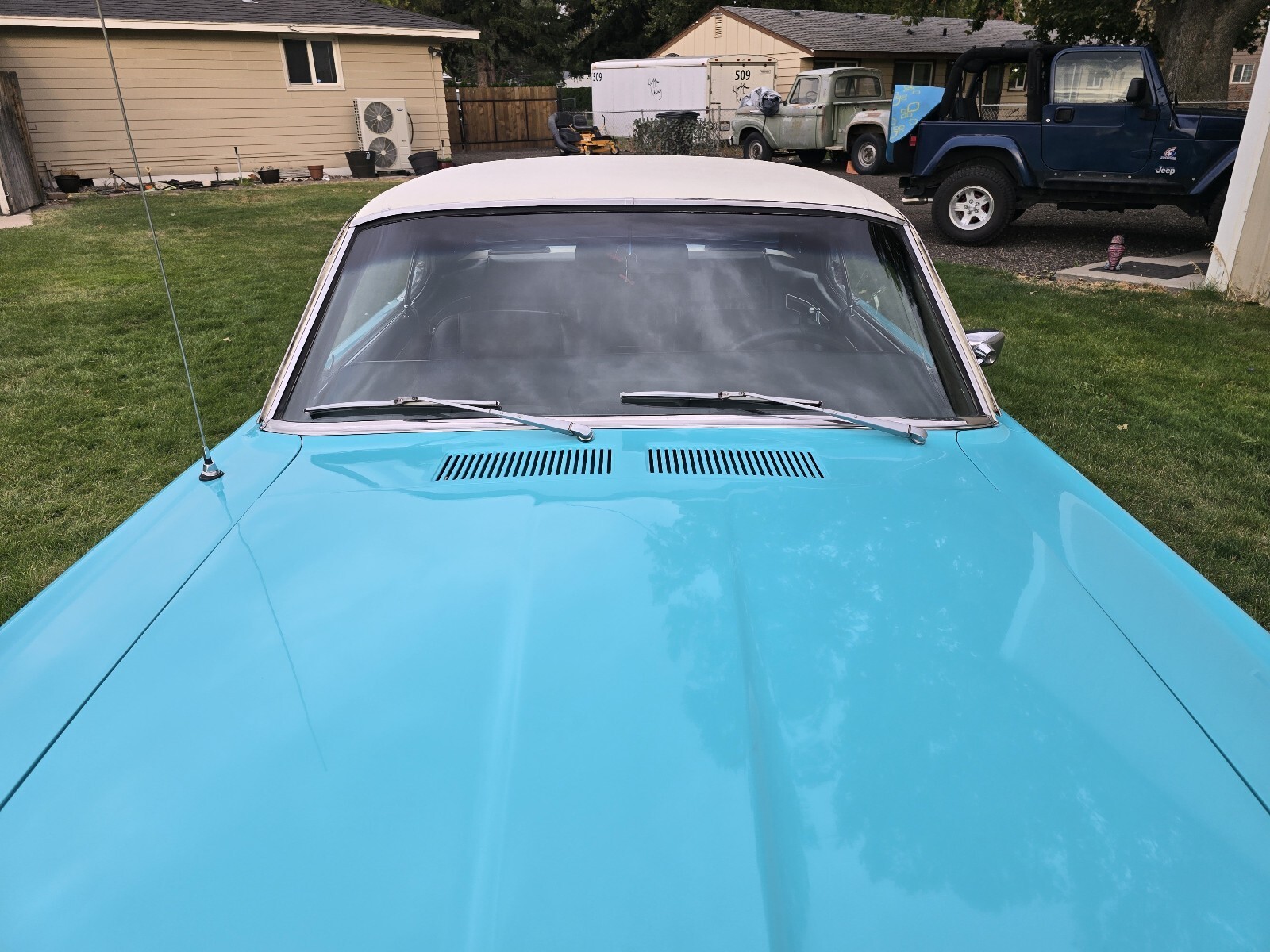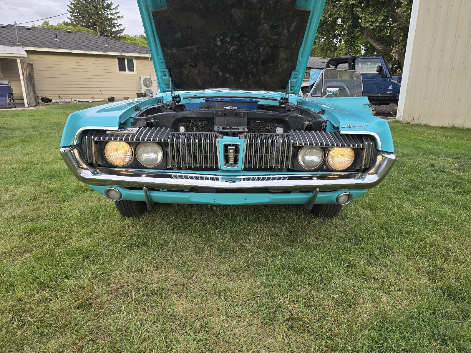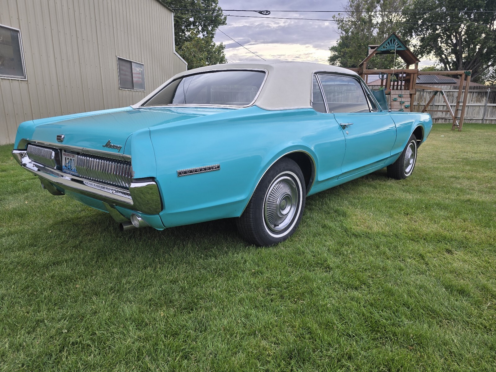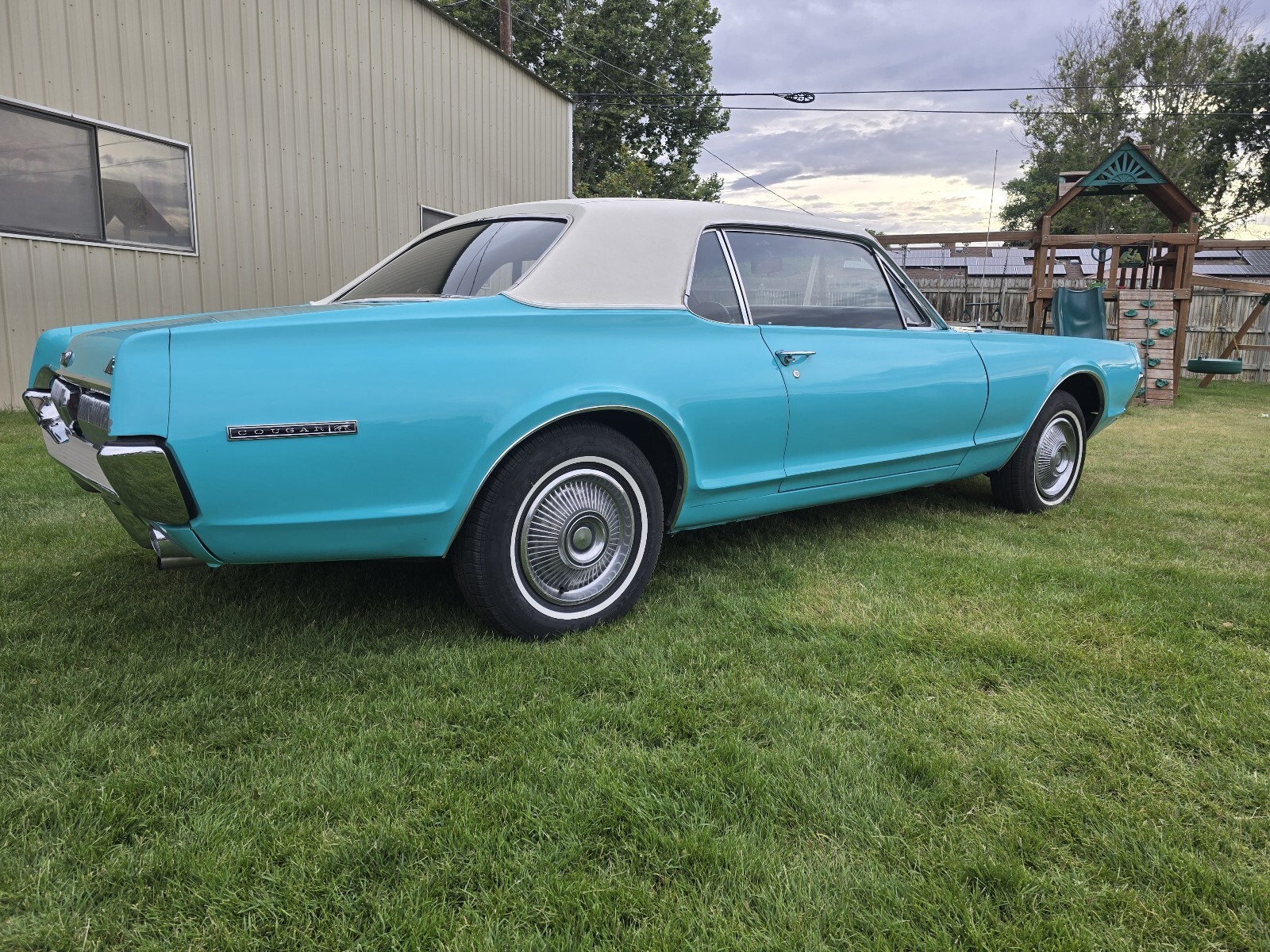 Nice all around 1967 cougar in a stunning turquoise green with white vinhl top and black leather interior, kept in stock form and just very well cared for over the yrs