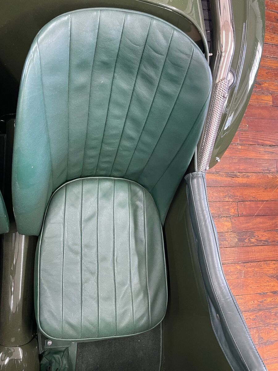 Inside, the cockpit is appointed with bucket seats upholstered in green leather, complemented by color-matched door caps and carpets. The black dashboard features a glovebox and a rearview mirror. Jaeger instrumentation includes a reverse-sweep 8k rpm tachometer and six auxiliary gauges, though the car is not equipped with a speedometer or odometer.