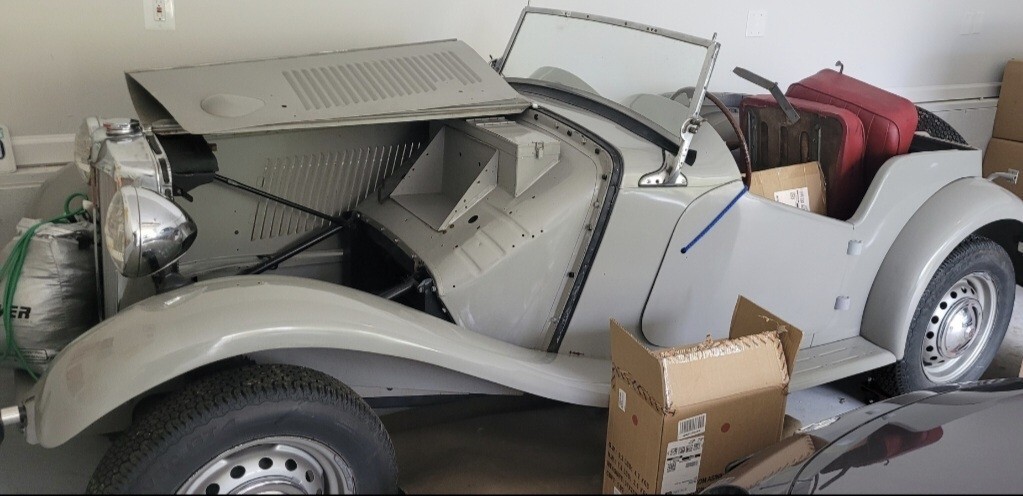 1952 MG TD, Rolling chassis with title and spares, painted body in down Grey, few years back, rebuilt chassis and chrom, new bumpers, new tan interior, new wiring harness, there's an engine block disassembled and a gear bo, I have a title I never bothered titling in my name but you ca, lovely project I have no time. Please bring trailer and a truck for all spares thank, probably 80% to 90% of it there.