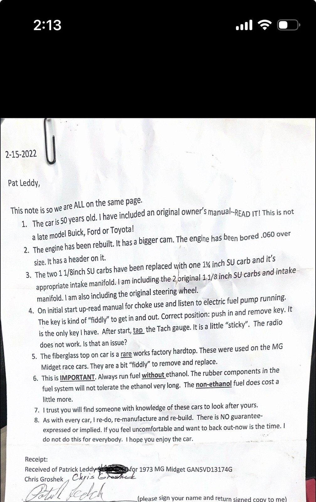 ‘73 MG Midget. Needs new battery and brakes. I have not driven it. My father bought it and then was diagnosed with Dimentia and never drove it.