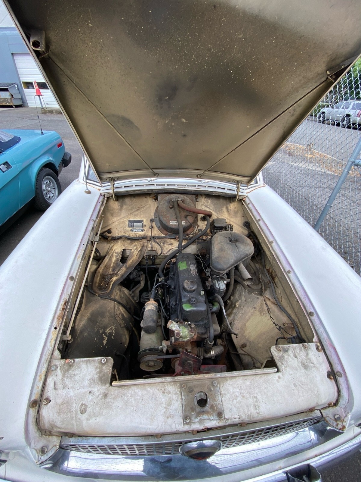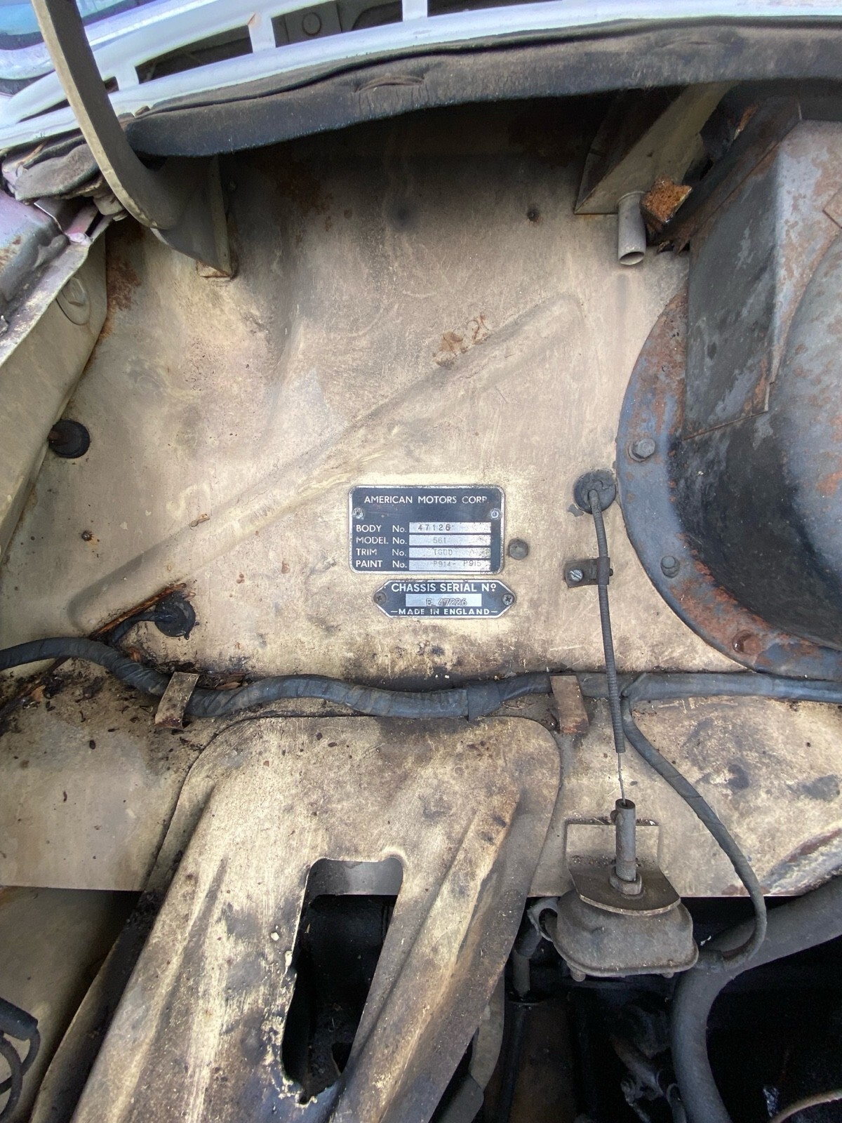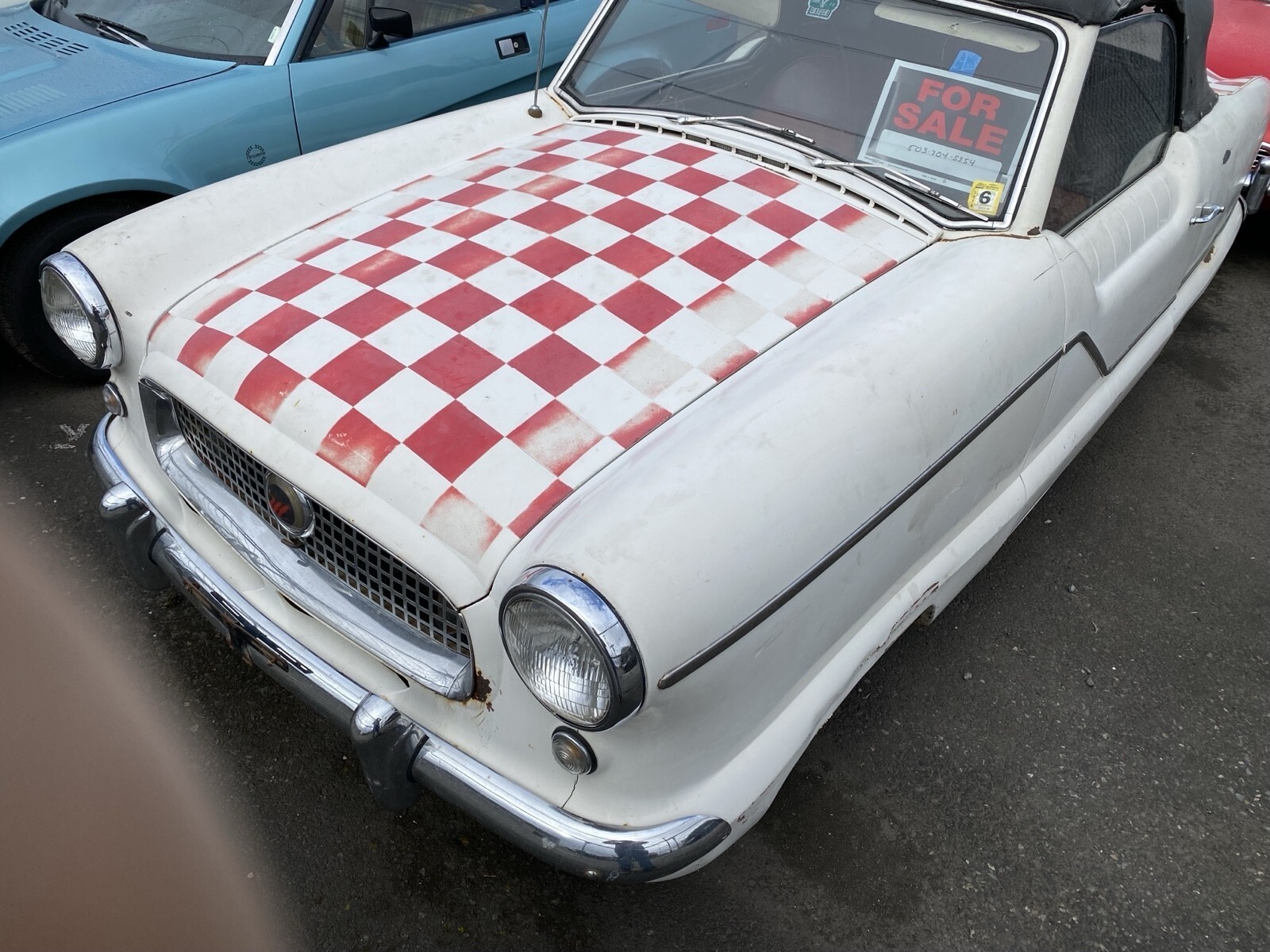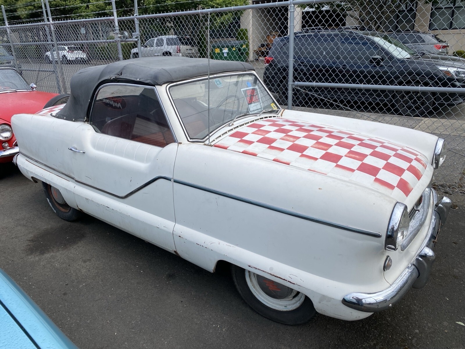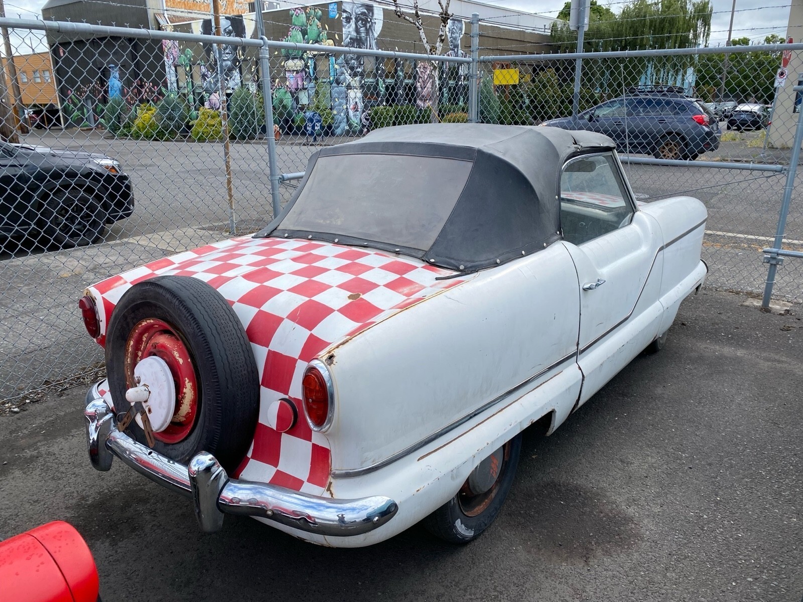 This 1958 Nash Metropolitan is a project vehicle that has been owned by the owner for about 10 years. The vehicle is in white color with red checkered painting and has a mileage of 26779. It is not running and needs work. Despite its current state, the owner has a clear title for the vehicle, making it ideal for those looking to restore or repair a classic car.