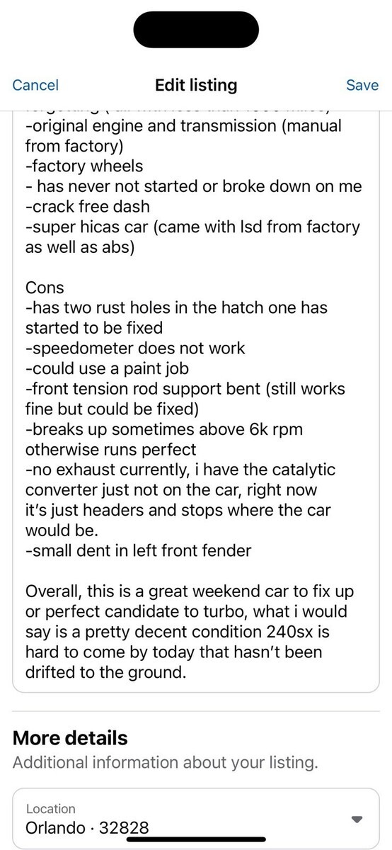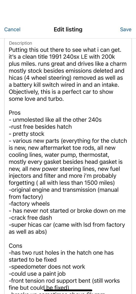 it’s a clean title 1991 240sx LE with 200k plus miles. runs great and drives like a charm mostly stock besides emissions deleted and hicas (4 wheel steering) removed as well as a battery kill switch wired in and an intake.