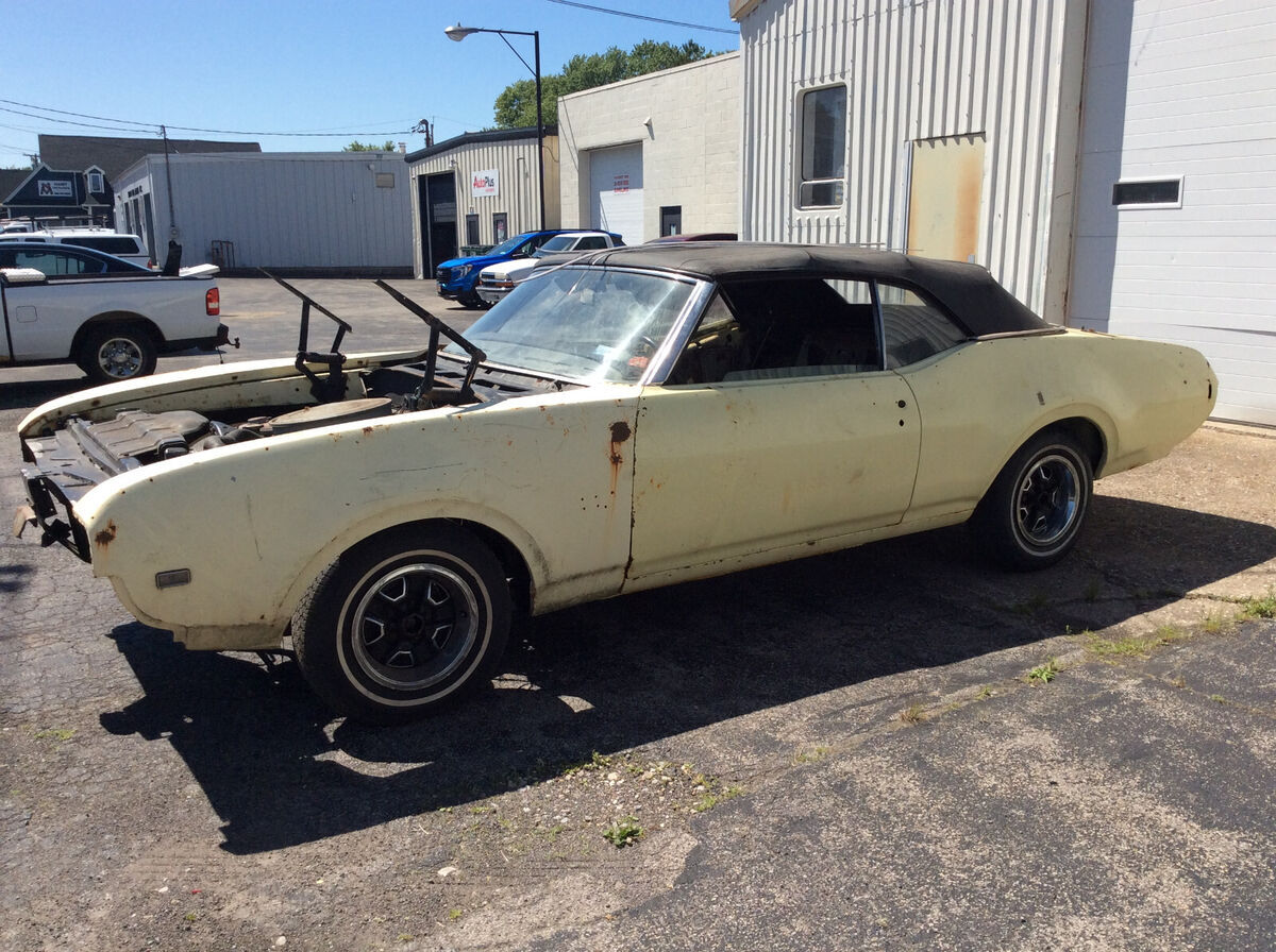 MORE PHOTOS BELOW THE DESCRIPTION!!!For sale is a 1969 Oldsmobile 442 Convertible Bench Seat 4 Speed Car. This is a REAL Yellow/Black car that has been off the road since 1976. This was found under a tarp in a driveway. This needs a COMPLETE Restoration. The trunk floor & floors need work. There is rot in the usual places but for being under a tarp for almost 40 years it is not horrible. The front end is not installed. The fenders have a few bolts just to hold them up. The hood has rot. The engine is a 350 but a 400 is included. This may be the original, but the VIN stamp is too light to read. This car has a power top, power drum brakes & power steering. The trunk area has a big dent as does the lower body panel.Most of the interior is there EXCEPT for the front lower seat. It was missing. The upper seat and head rests are there.All parts pictured are included, there will be parts missing. There are no bumpers, no grilles, no rear marker lamps. The side trim is there. This does NOT have the original transmission. The transmission in the car is a 1970 Oldsmobile M-20 Transmission. THIS NEEDS A LOT OF WORK!VIN: 344679M409952Mileage showing: 86351NY was not a title state until 1972. This comes with a transferable registration. PLEASE MAKE SURE YOUR STATE WILL ACCEPT A NY TRANSFERABLE REGISTRATION.$500 deposit is due within 24 hours of auction close, balance due by certified funds/wire transfer/cash prior to pickup.Buyer is responsible for all transportation costs, we can help arrange shipping if you are not planning on picking it up yourself. More Photos available below. You can click on any photo to go to the gallery then you will be able to see the full size images.