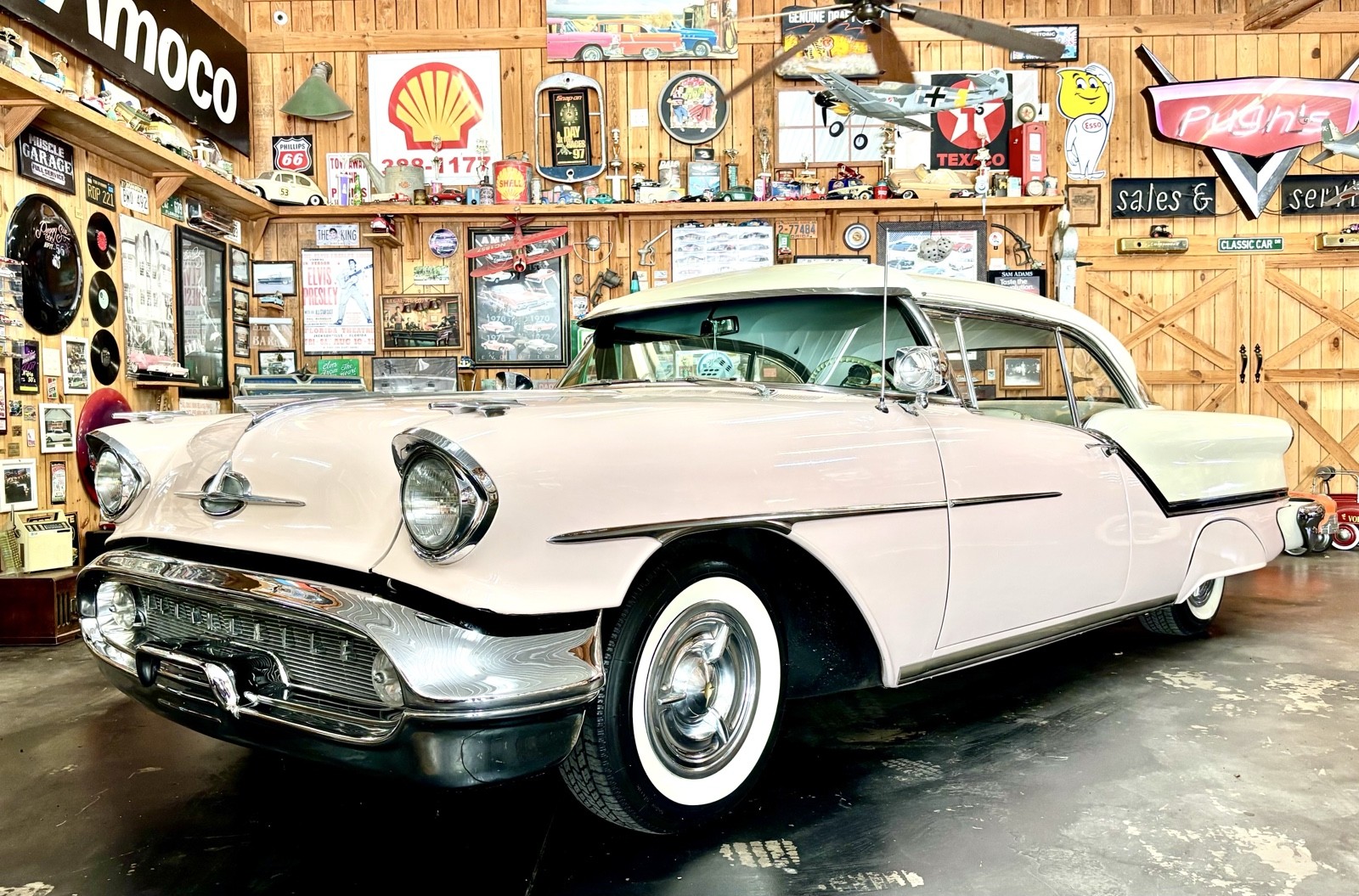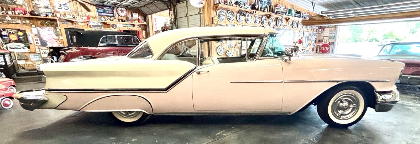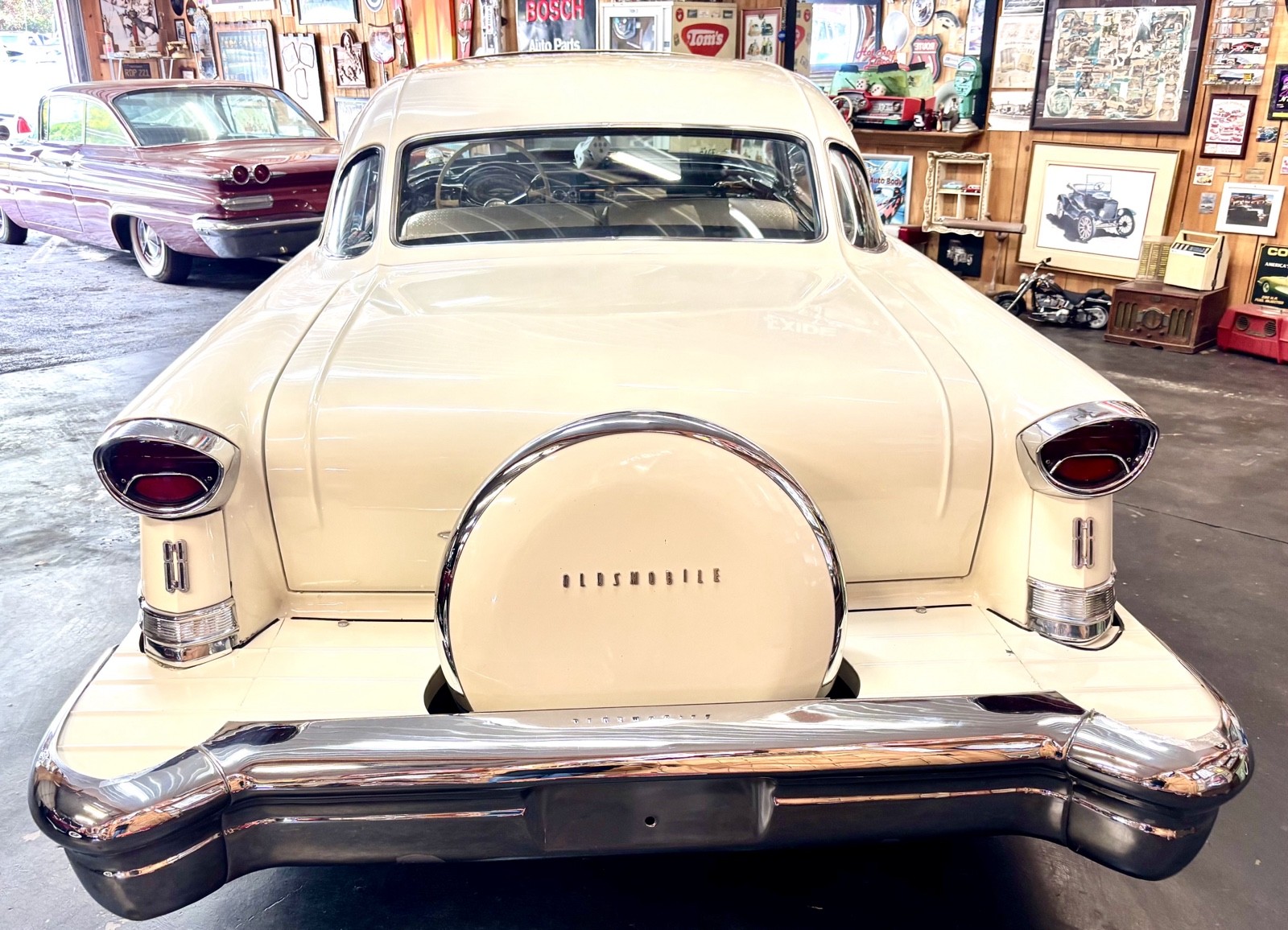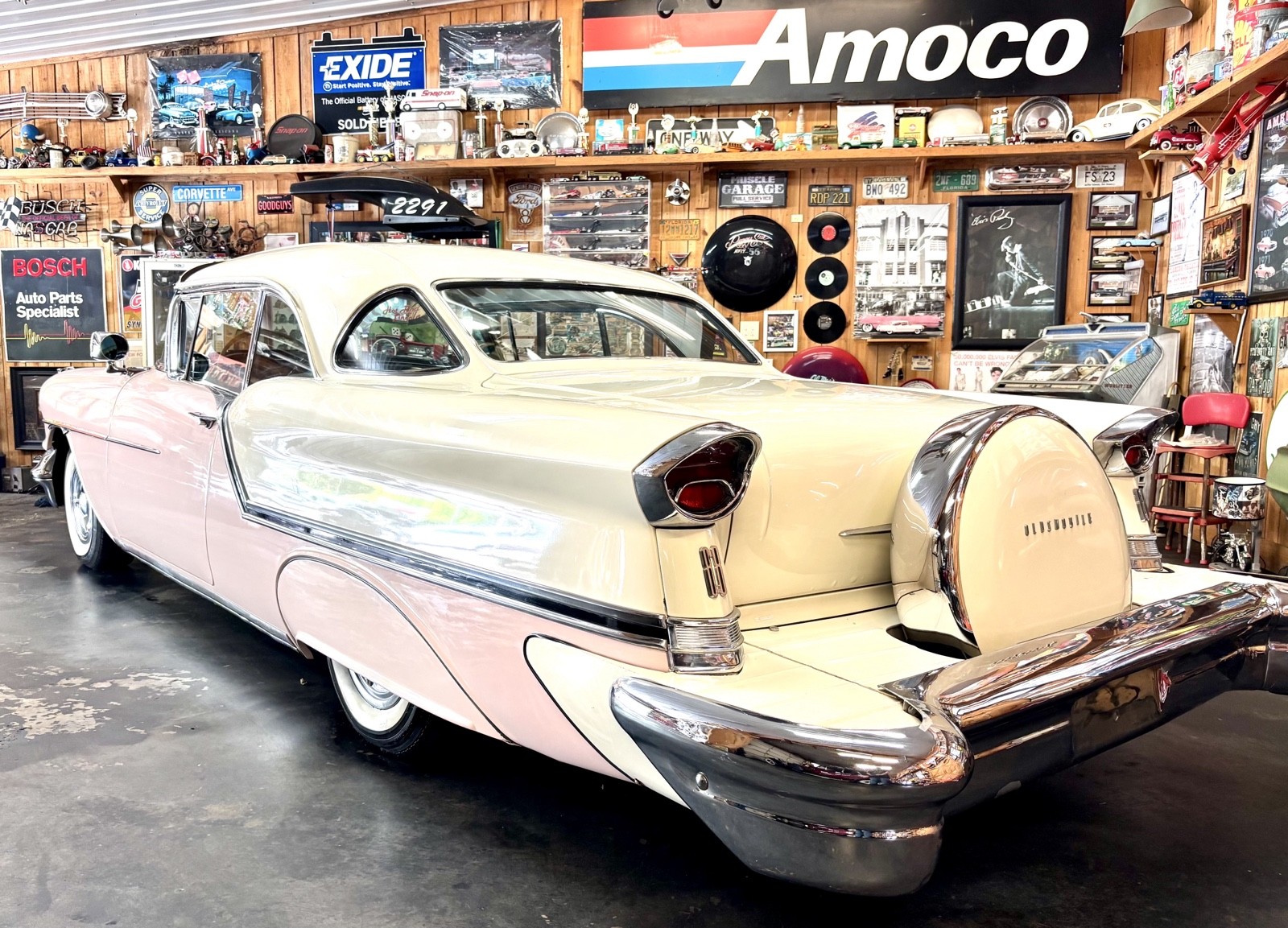 1957 Oldsmobile Golden Rocket 88 Holiday Hardtop Coupe in 2 tone Sunset Glow and Alcan White with Onyx Black accent trim. The interior is Onyx Black and Alcan White.