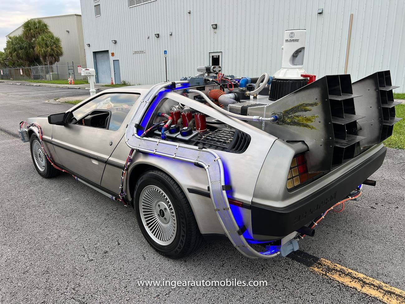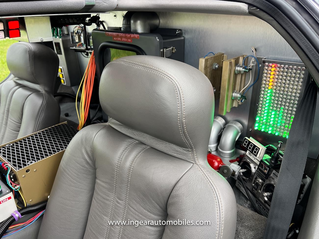 Great lengths were spent achieving a correct representation of the movie down to the correct purple clamps that hold the external wires. Most builders would use black clamps, these are aviation purple clamps use just like in the Movie car. It has all-metal aluminum construction for the rear vents, external mesh rails and other parts. The “Mr. Fusion” opens like in the film. Exact replicas of various detailed parts permanently mounted to the car were made using the actual movie A-car as a reference. Inside the cockpit, fully functional “Time Circuits” can be programmed with any dates/times you like. Real working “Plutonium Gauges” needles move and make sounds, exactly as in the film. The “Upper Console” is mounted to the ceiling, along with many other details in the car that are exact replicas of the parts seen in the film. The iconic “Flux Capacitor” buzzes over your shoulder and when activated into “time travel” mode will light up bright.