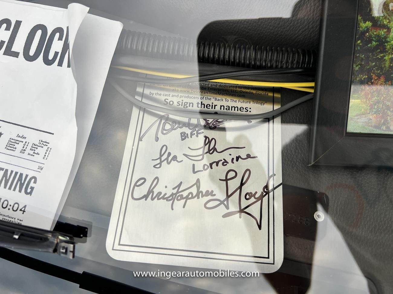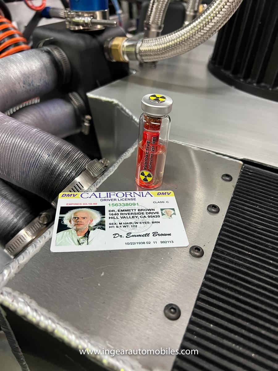 it’s mid-mounted 2.85-liter twin-turbo V6 fuel-injected engine paired to a 5-speed manual transaxle, This Time Machine is believed to be the only one built with Twin Turbos setup. Making it a whole lot thrilling to drive! It has rear adjustable coilover suspension, upgraded radiator with dual electric fans, upgraded front shocks, and many more upgrades. Additionally, the sun visor has been signed by Mr. DeLorean’s daughter Kat DeLorean founder of DeLorean Next Generation Motors and Christopher Lloyd.