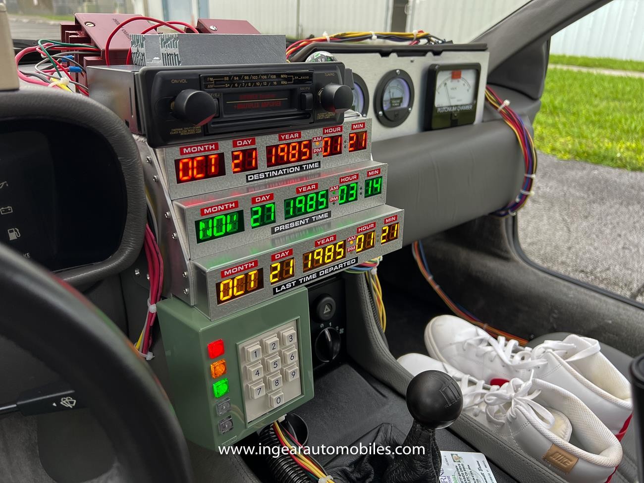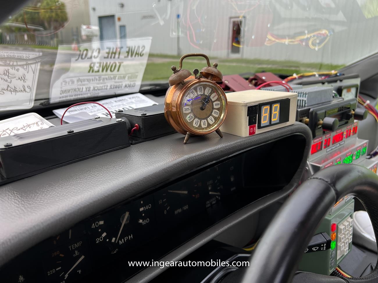 A rear backup camera was also installed during the build. The electronics of the DeLorean car remain completely stock, All the special effects have their own source of energy located in the front trunk, with 2000W inverter/charger system allowing the car to be plugged into the wall for permanent display if desired. This battery system will operate all the props, radio, sound effects, and lights for many hours without using the car’s battery. Professional high quality engineering went into this Time Machine.