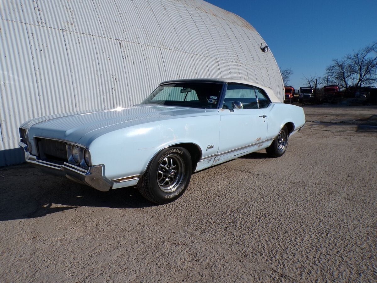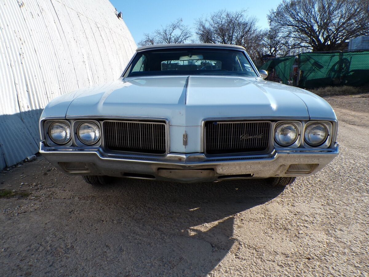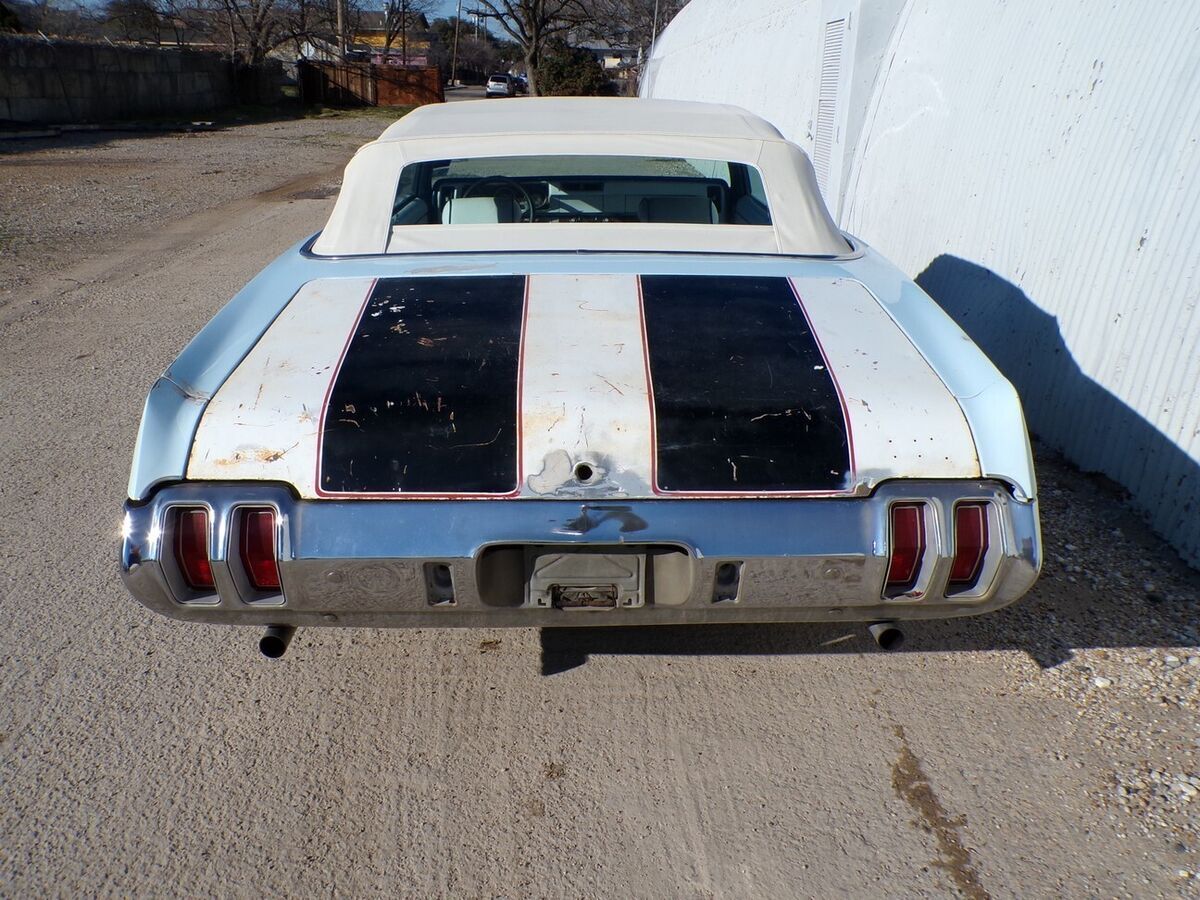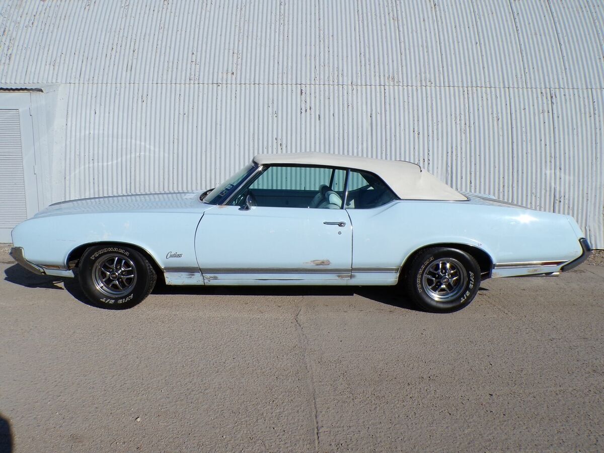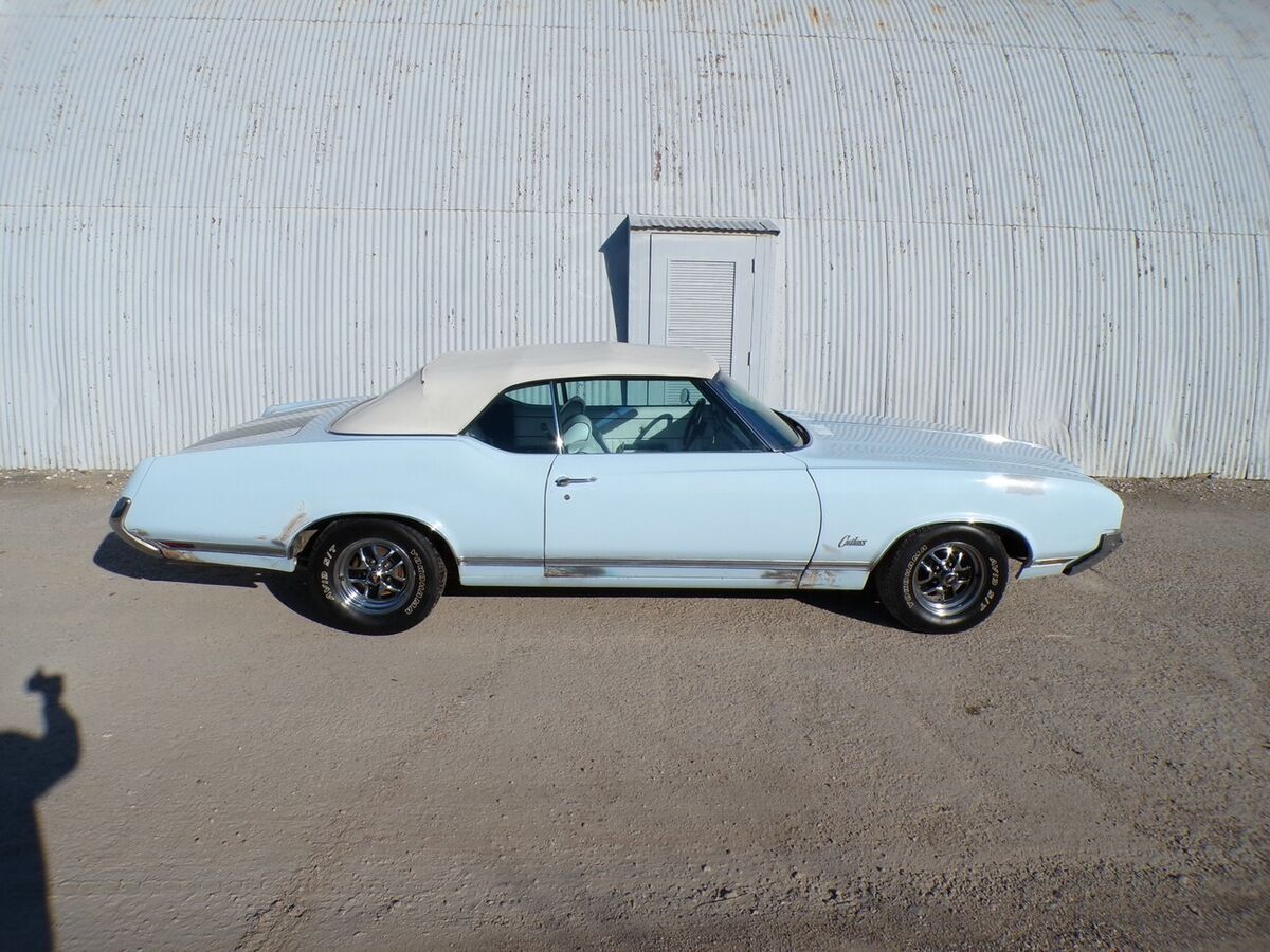 NO CARAMEL PAYMENTS, NO TRADES, NO FINANCING OR FINANCE COMPANY CHECKS. THANKS SEE 80 PHOTOS AND MY PHONE NUMBER ON MY WEBSITE WWW.PETESCLASSICCARS.COM THIS 1970 OLDSMOBILE CUTLASS SUPREME CONVERTIBLE HAS BEEN A NORTH TEXAS CAR SINCE AT LEAST 1999. THAT OWNER SOLD IT TO THE LAST CURRENT OWNER IN 2008. IT HAS SAT FOR A WHILE BUT RUNS AND DRIVES. 350 V-8 2BB, 250HP. DUAL EXHAUST, FACTORY A/C,POWER FRONT DISC BRAKES, POWER STEERING, POWER TOP. SHOWS 29399 MILES. NO HISTORY ON THE MILEAGE. TURBO 350 TRANSMISSION. OLDS 14 INCH WHEELS. HEI IGNITION. JAC, AND SPARE. FACTORY AZURE BLUE. NEWER WHITE TOP AND WHITE BENCH SEAT INTERIOR . VERY SOLID ORIGINAL FLOORS AND TRUNK. A FEW PINHOLES IN TRUNK FLOOR. THE CAR HAS SOME POOR BONDO WORK ON THE LOWER BODY AS SHOWN, BUT NOT ALOT. THIS CAR COULD USE A PAINT JOB. THE WIPERS, A/, AND CONVERTIBLE TOP,AND RADIO DO NOT WORK. CLEAR TEXAS TITLE. ONE SMALL ROCK CHIP IN WINDSHIELD. .ALSO COMES WITH A 442 REAR WING. SOLD AS IS, NO WARRANTY, NO ADJUSTMENTS, VEHICLE AND TITLE RELEASED WHEN FUNDS CLEAR. EBAY BUY IT NOW PAYMENT NON REFUNDABLE. BALANCE IN 3 DAYS BY BANK WIRE TRANSFER OR CASH IN PERSON. NO CARAMEL PAYMENTS.. TEXAS TITLE IN HAND. BEST WAY TO DEAL WITH ME IS BY TELEPHONE CALL. FULL PAYMENT IN 3 DAYS UNLESS YOU CONTACT ME BEFORE TO MAKE OTHER ARRANGEMENTS. NO FINANCE COMPANY CHECKS, NO CARAMEL PAYMENTS. SEE 80 PHOTOS AND MY PHONE NUMBER ON MY WEBSITE WWW.PETESCLASSICCARS.COM NO TRADES