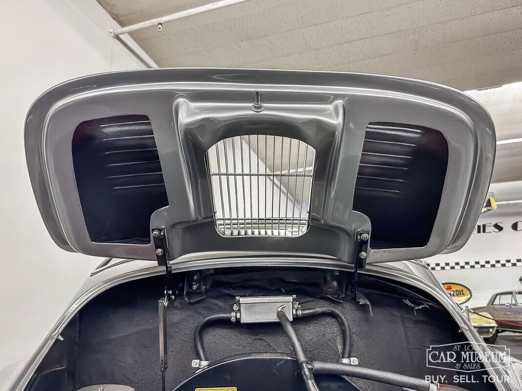 It delivers power through a 3.88 ring & pinion 4-speed Pro-Street transmission with Vintage Speed short-throw shifter! Other features include 15" 5-lug painted wheels absent of any wheel covers, 185/65 radial tires, front & rear disc brakes with dual master cylinder, lowered gas shocks, front & rear sway bars with polyurethane bushings, gold Porsche Carrera emblems & Reutter Coachworks badging, original style green faced instrumentation, heat/defrost, Carrera louvered deck lid with chrome engine grill, halogen headlamps with rock guards, Blaupunkt AM/FM/CD/Bluetooth stereo with two matching speakers, black dash knobs, carpeted trunk, power side windows, outside vent wings, Emory Motorsports rear vent windows, German square weave charcoal interior carpet, 3-point retractable seat belts, leather front hood straps, fog lamps, and much more! The front hood has been vinyl wrapped with outlaw-themed bandit artwork. It appears to be unpainted underneath. The hood also features a center-mount external gas filler.