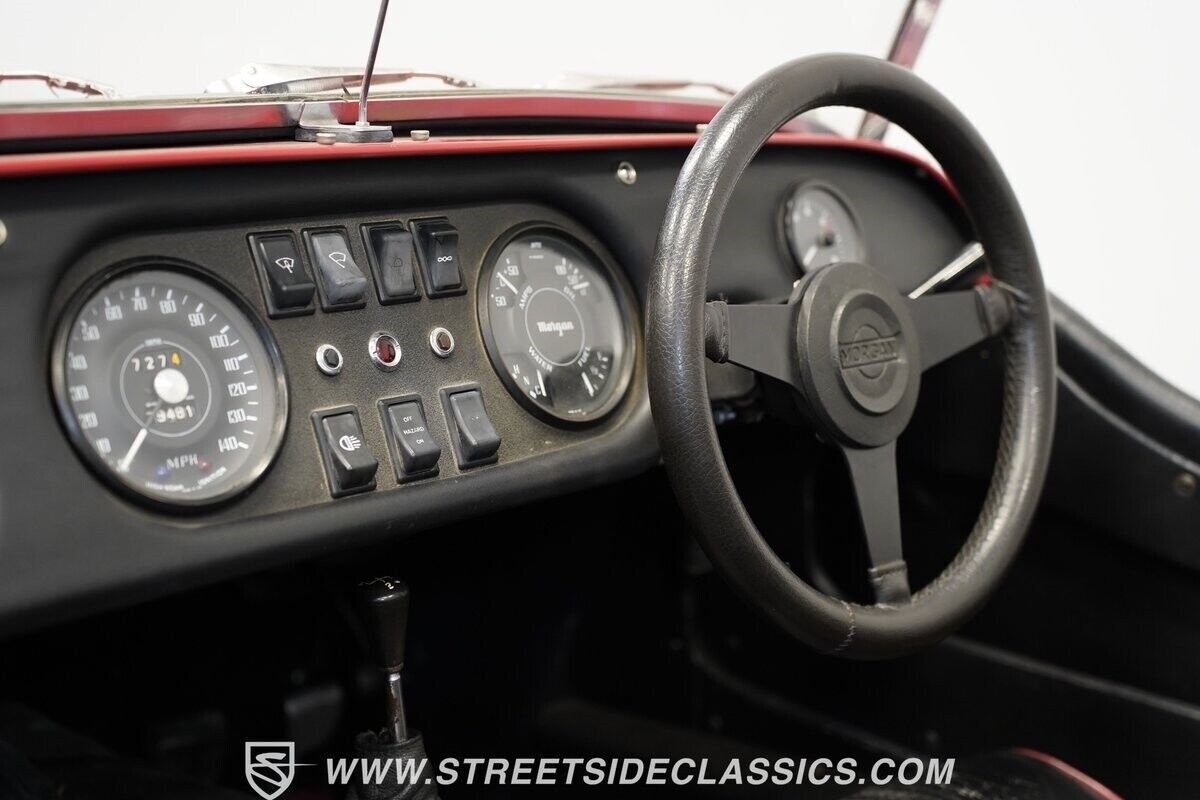 The black vinyl interior follows traditional British racing design. The bucket seats feature red piping and hold occupants firmly during spirited motoring. Morgan-branded gauges fill the dash with essential information in classic British style. The floor-mounted gearbox lever and vinyl-covered transmission tunnel layout bring pure sports car function to the cabin.