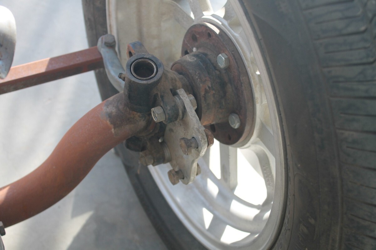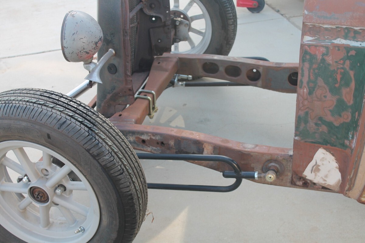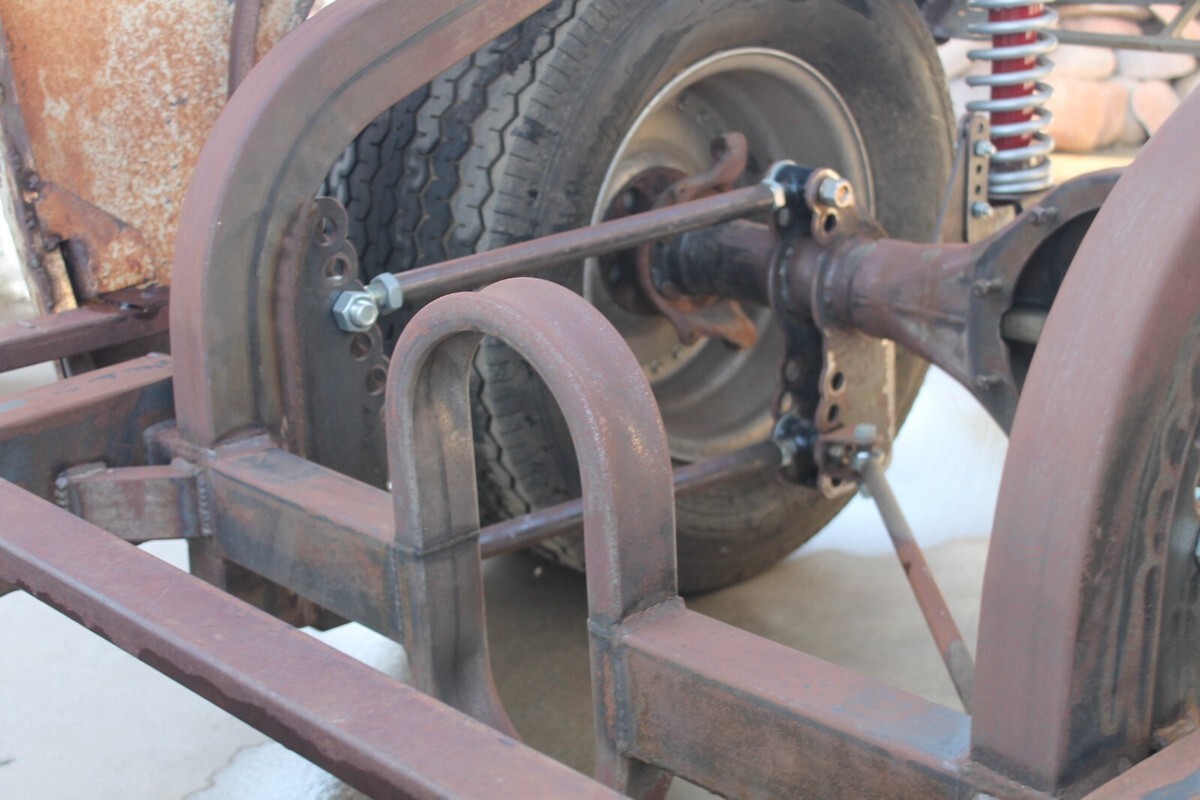 - 6" drop tube front axle with chevy spindles, lateral leaf springs. Radius rods, All by speedway motors.