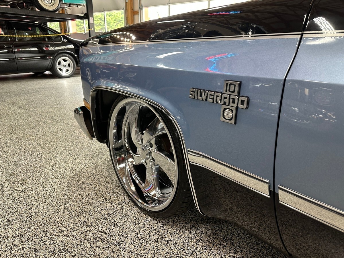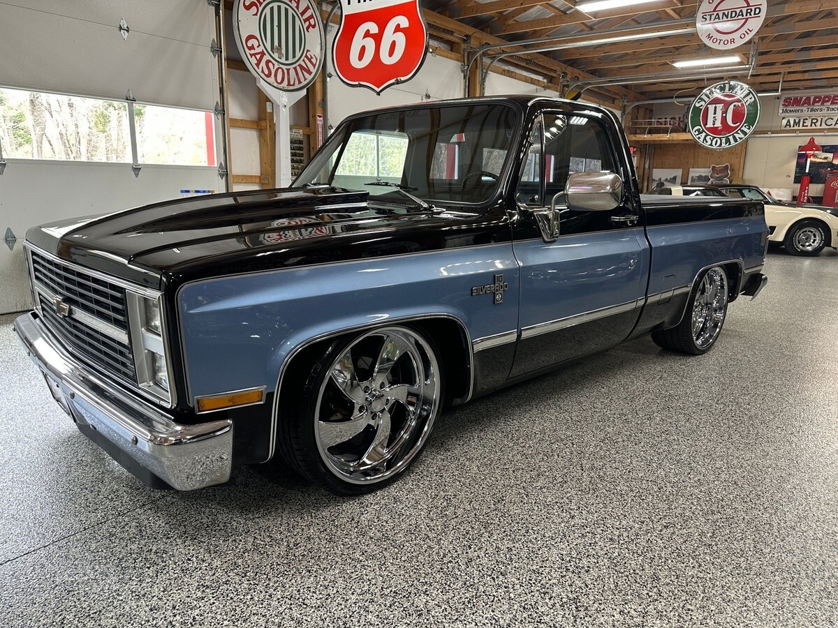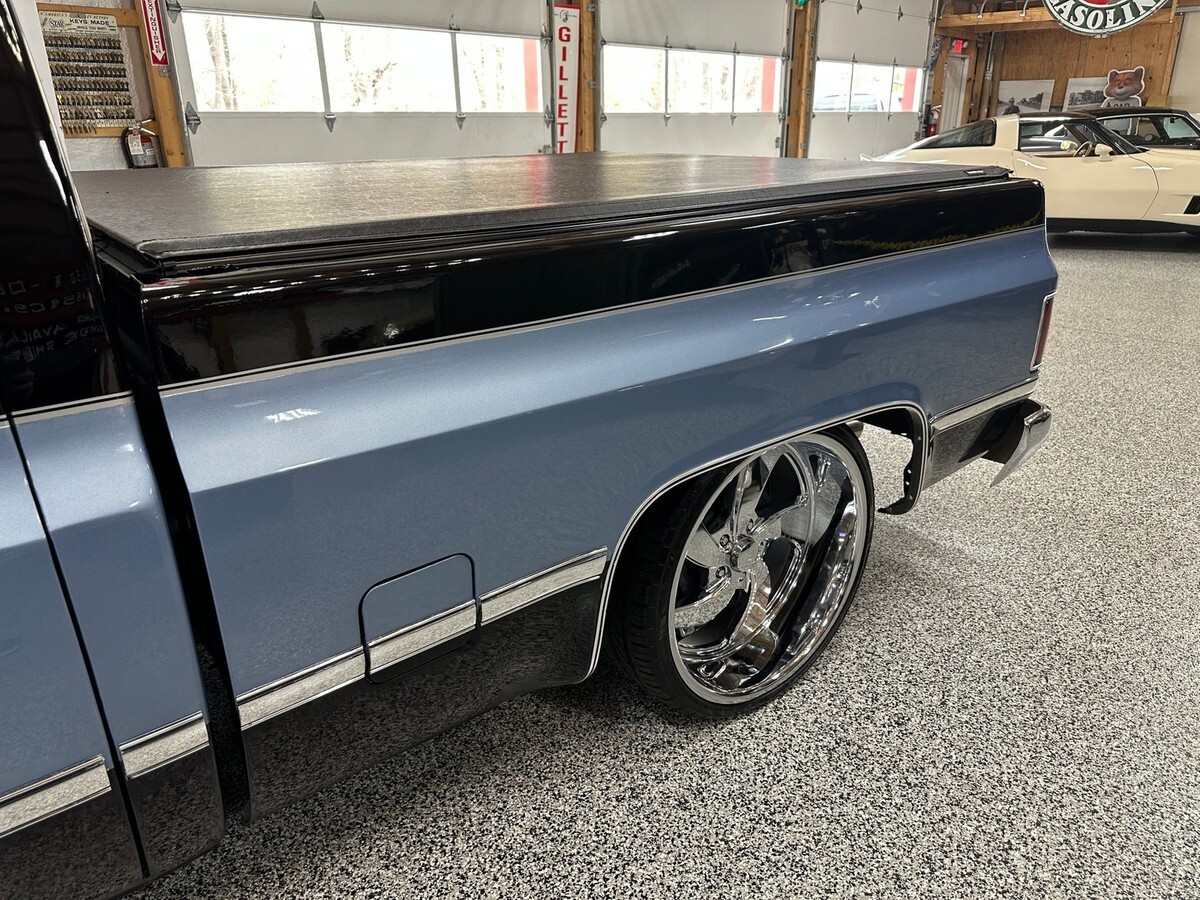 This 1983 Chevrolet C10 Regular Cab Short Bed pickup is a standout example of classic American truck styling infused with tasteful performance upgrades and a custom look that turns heads everywhere it goes. Finished in a bold black and blue two-tone exterior, this C10 offers a striking presence with just the right amount of attitude. Enhanced by a lowered suspension and sitting on a set of 22-inch polished wheels, this truck has the perfect stance to match its aggressive yet clean lines.
