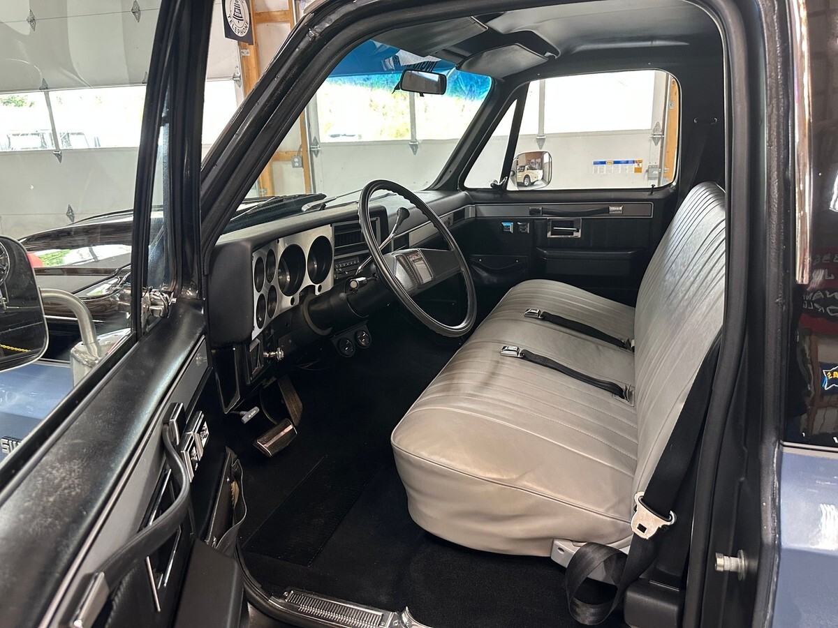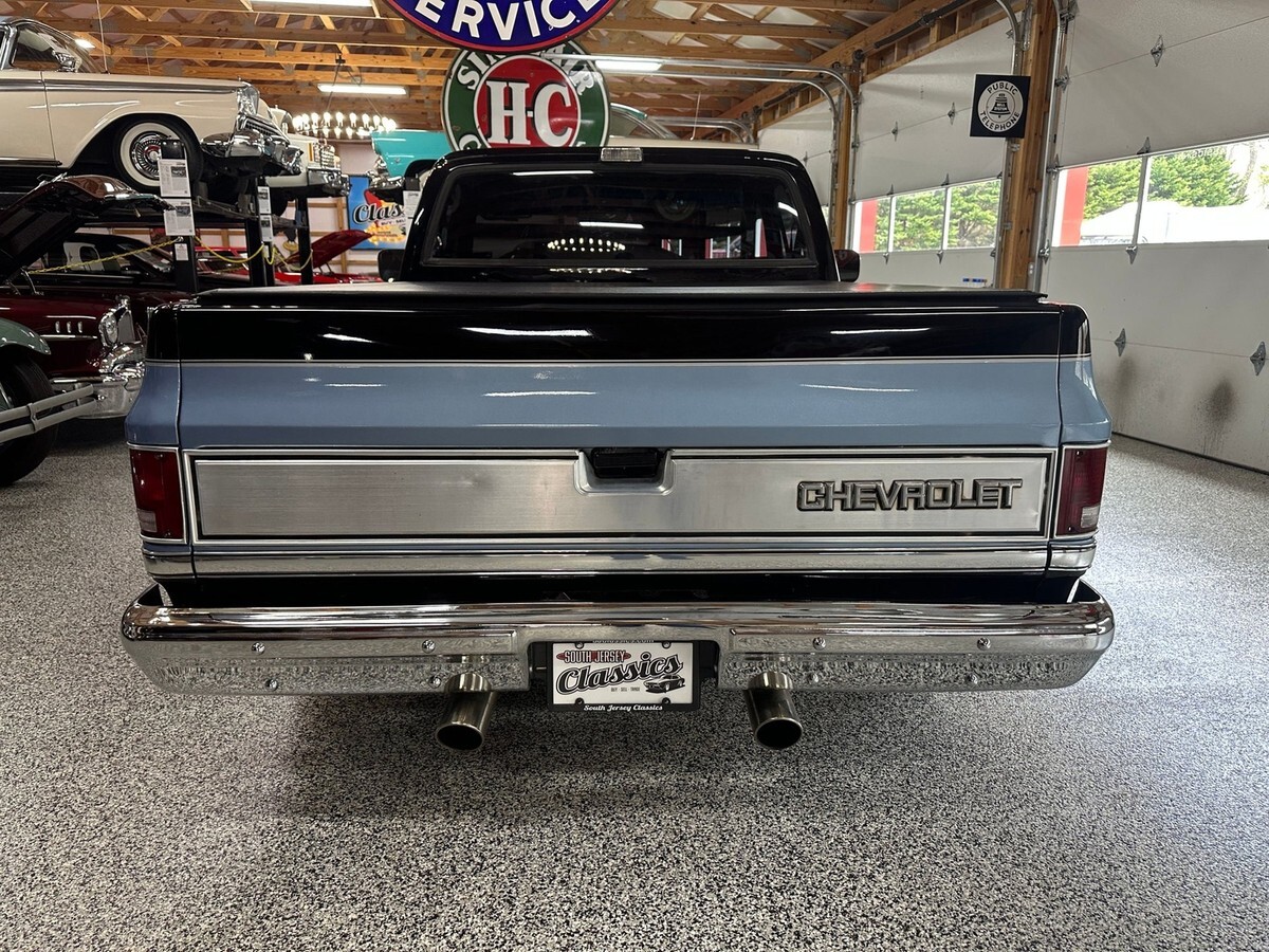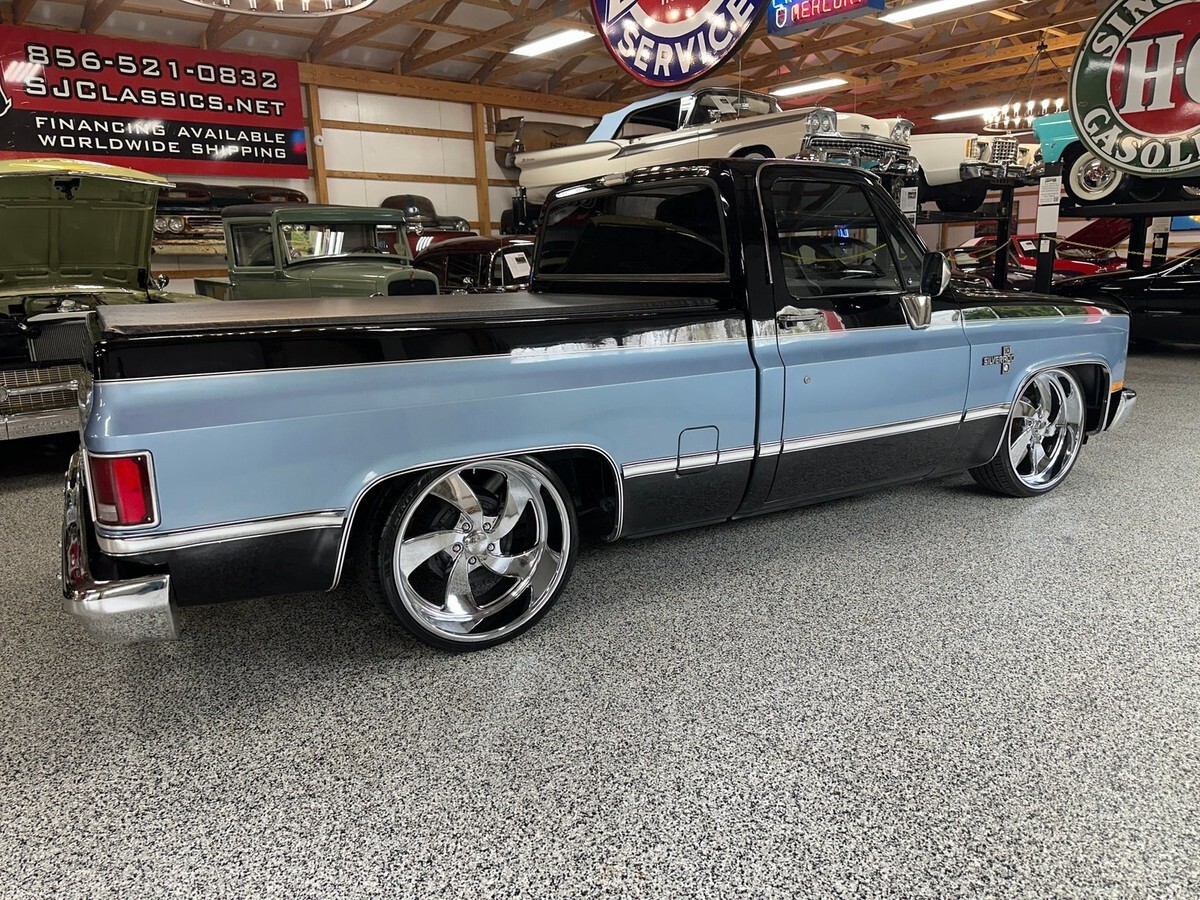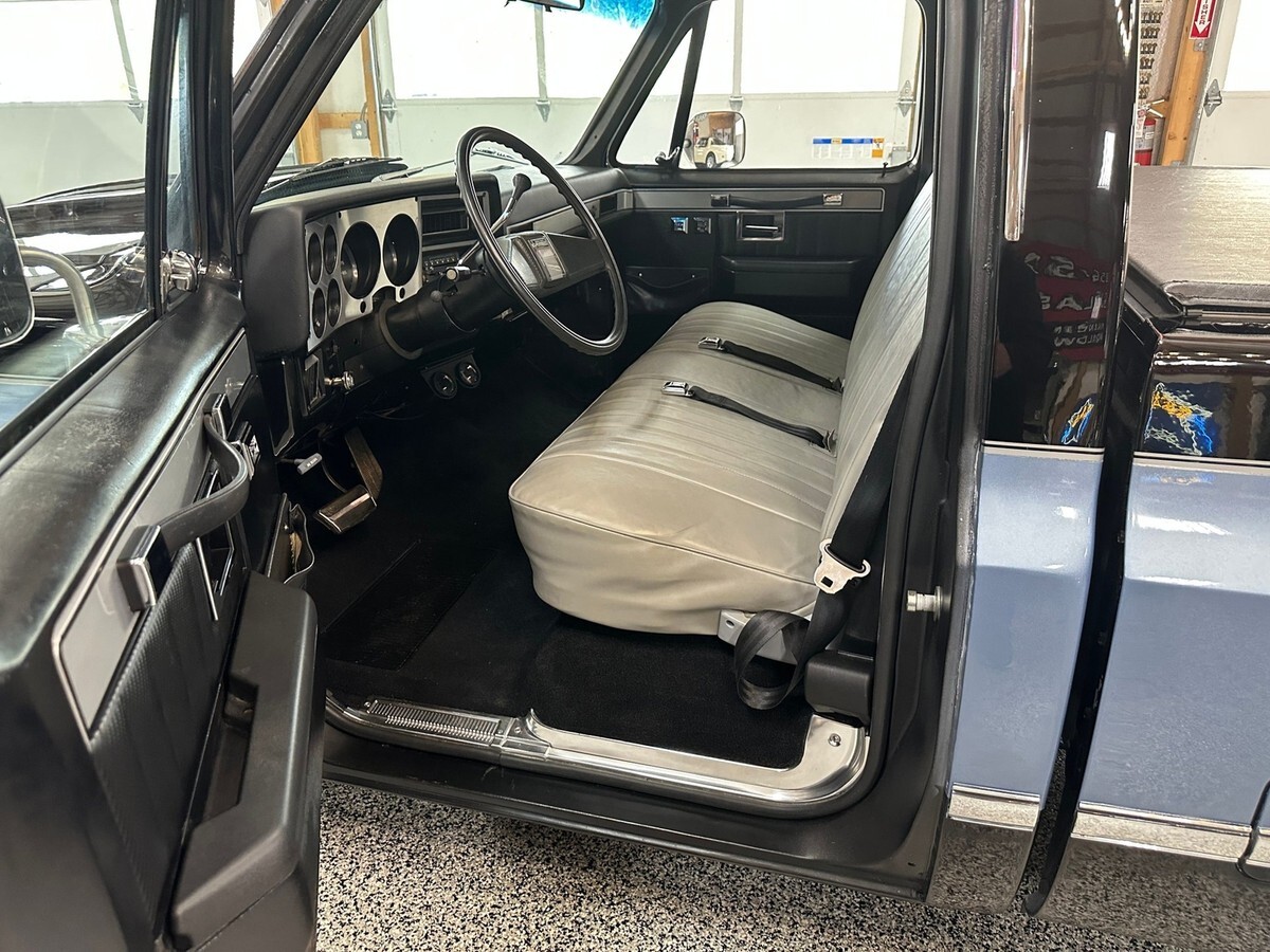 This 1983 Chevrolet C10 Regular Cab Short Bed pickup is a standout example of classic American truck styling infused with tasteful performance upgrades and a custom look that turns heads everywhere it goes. Finished in a bold black and blue two-tone exterior, this C10 offers a striking presence with just the right amount of attitude. Enhanced by a lowered suspension and sitting on a set of 22-inch polished wheels, this truck has the perfect stance to match its aggressive yet clean lines.