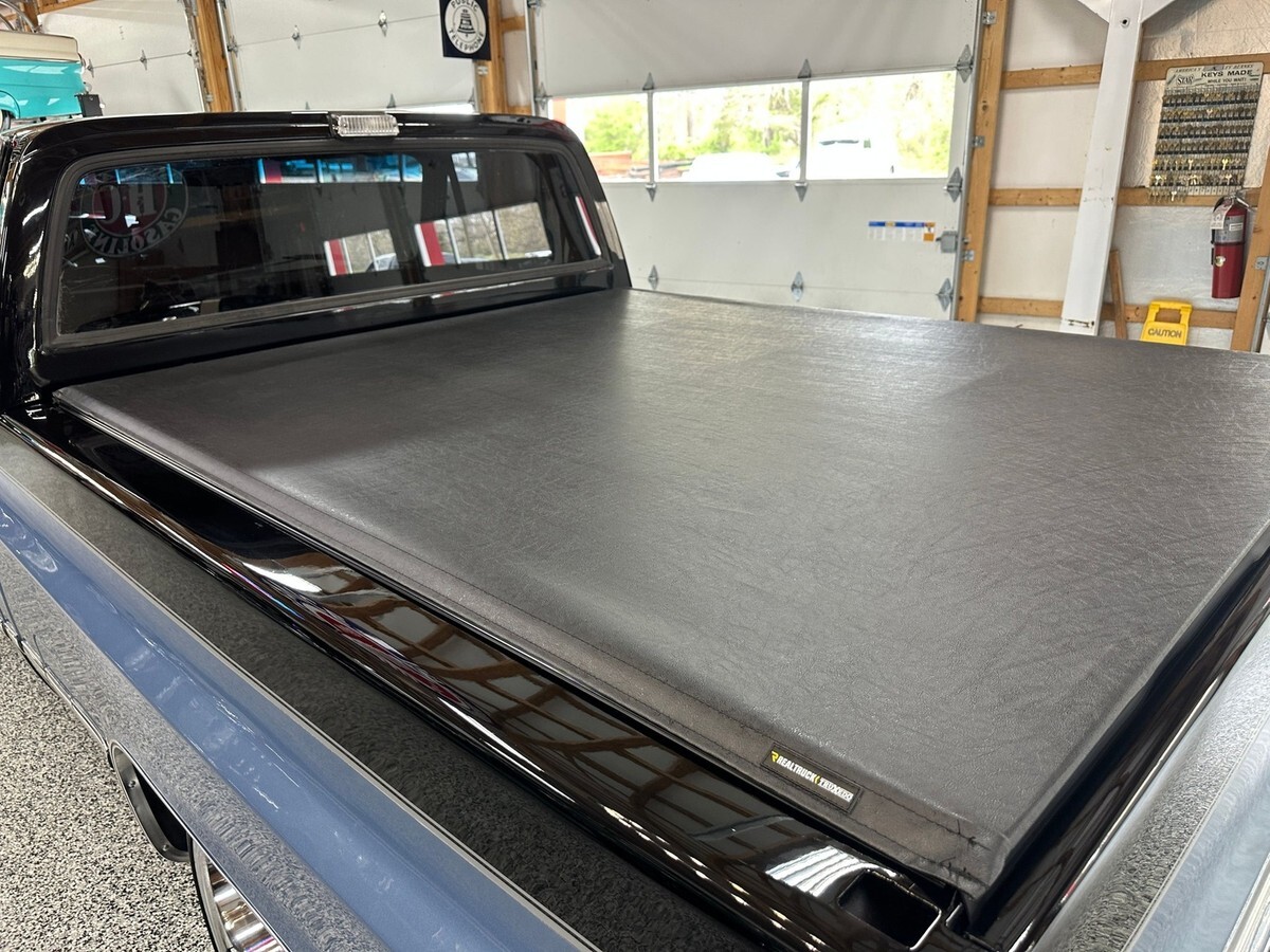 Inside, the custom theme continues with a gray vinyl interior, matched with a black dash and black door panels that provide a clean, classic look with modern flair. The cabin is simple yet comfortable, making it the perfect place to enjoy the ride and hear the rumble of the small block V8. A brand new bed cover has just been installed, giving the truck added practicality while preserving the clean lines of the short bed.