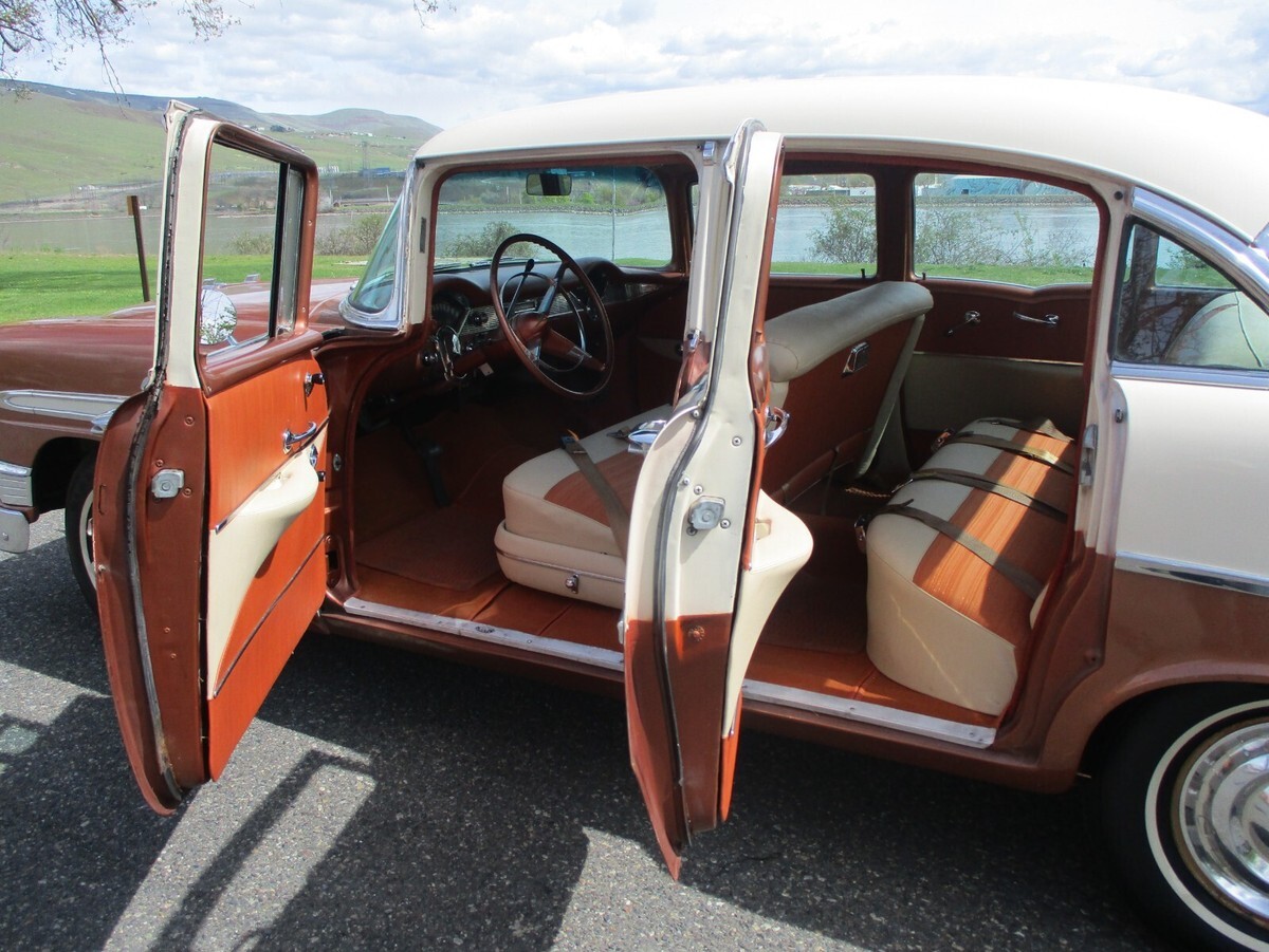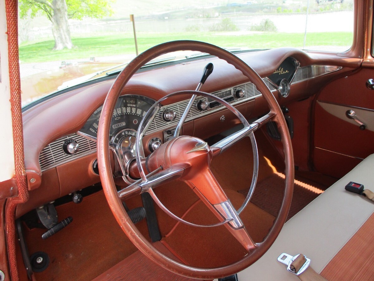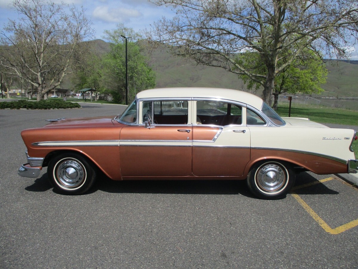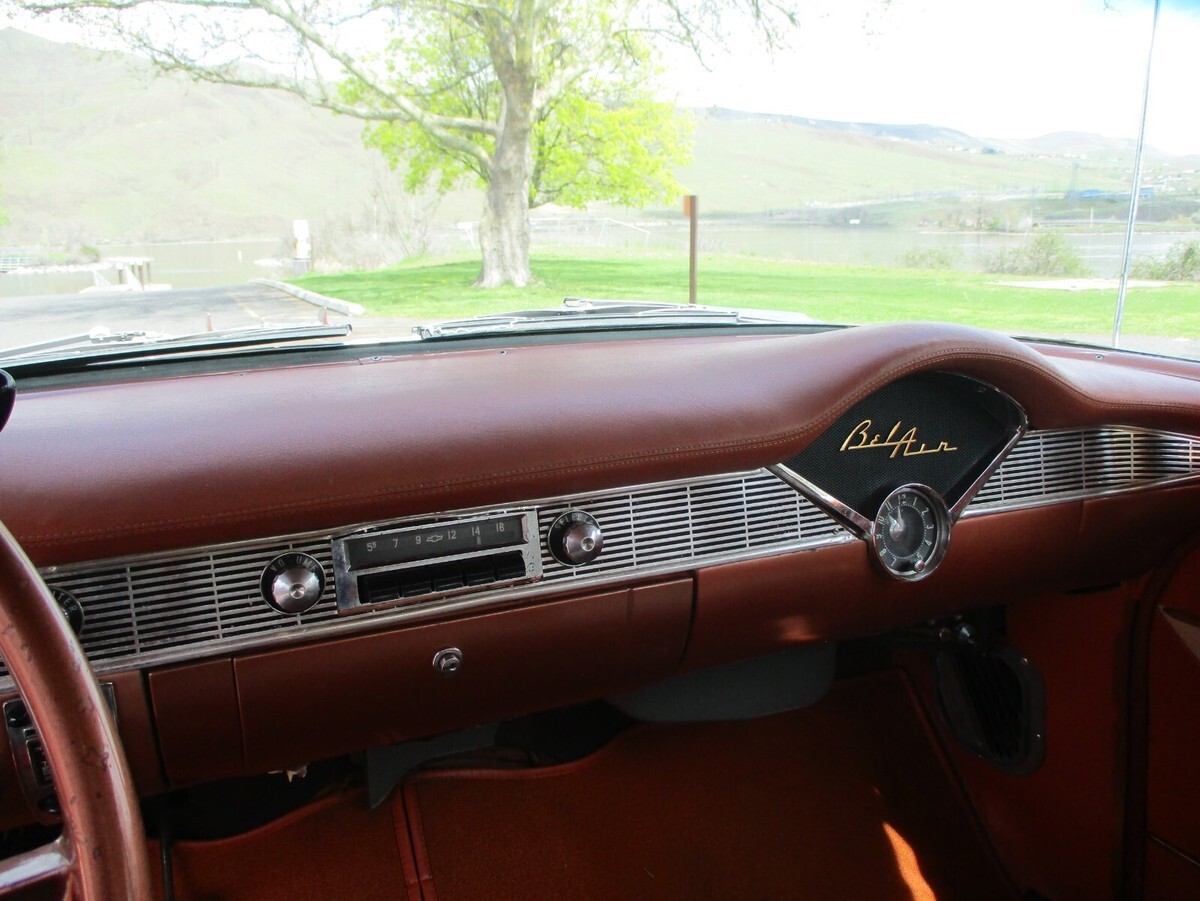 Up for sale is a nice little 1956 Chevy Bel Air that runs and drives very nice. The speedo is showing 102109 Original miles on it. The engine is its original 265 Powerpack 4bbl from the factory and it runs very nice. The original Powerglide transmission has had a rebuild and all brakes are new with new wheel cylinders, new brake hoses and some new brake lines. (it runs and drives well). We couldn't find any rust in the car, but it looks like it has had a minor repair on the front end and the front end has been repainted and doesn't quite match the rest of the car. It also has had a total repaint years ago. It also has a Coupal of very small dings; the worst is on the trunk lid next to the where the license plate goes. (please look at all pictures closely) This car also came from the factory with fender skirts that do come with the car and the original owners' manuals, jack with lug wrench. Also, a car cover dose come with the car. All glass is good except the passenger door window, and it has a crack, but windows roll up and down nicely. The interior has been replaced with new throughout, in its original look even the headliner is new, and it has a padded dash pad. Seatbelts are also in place front and rear. Everything seems to work even the original radio, but the clock and gearshift pointer are not working at this time. The gearshift pointer shows up when in reverse, but I couldn't see it in the other poisons. (very nice Interior and looks new) I'm listing this nice little 56 Chevy for my friend and I will take all questions to him. This is not a show car; it is a nice driver quality car. Buyer is responsible for shipping and all shipping costs. We will help with loading on our end and in anyway we can or just come drive it home. For your questions, please call Bill 208-750-0000.