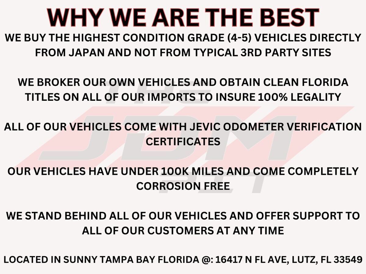 WE ONLY PURCHASE VEHICLES WITH A GRADE OF 4 TO 5 (EXCELLENT) CONDITION REPORTING AND WITH A JEVIC ODOMETER VERIFICATION CERTIFICATE! PLEASE FEEL FREE TO PURCHASE ANY OF OR VEHICLES WITH 100% CONFIDENCE! GIVE US A CALL IF YOU ARE INTERESTED IN THIS VEHICLE AND WE WILL BE HAPPY TO ANSWER ANY QUESTIONS THAT YOU MAY HAVE! SHIPPING AND FINANCING AVAILABLE! THANK YOU FOR LOOKING! JOIN US ON OUR YOUTUBE PLATFORM FOR WALKAROUND AND TESTDRIVE VIDEOS OF SOME EXCELLENT JDM RIDES!! @THE JDM PIT Prestige Imports Tampa . com