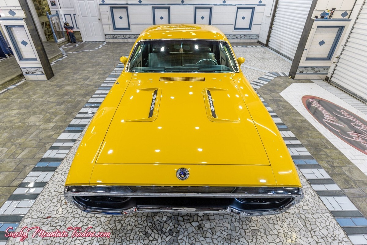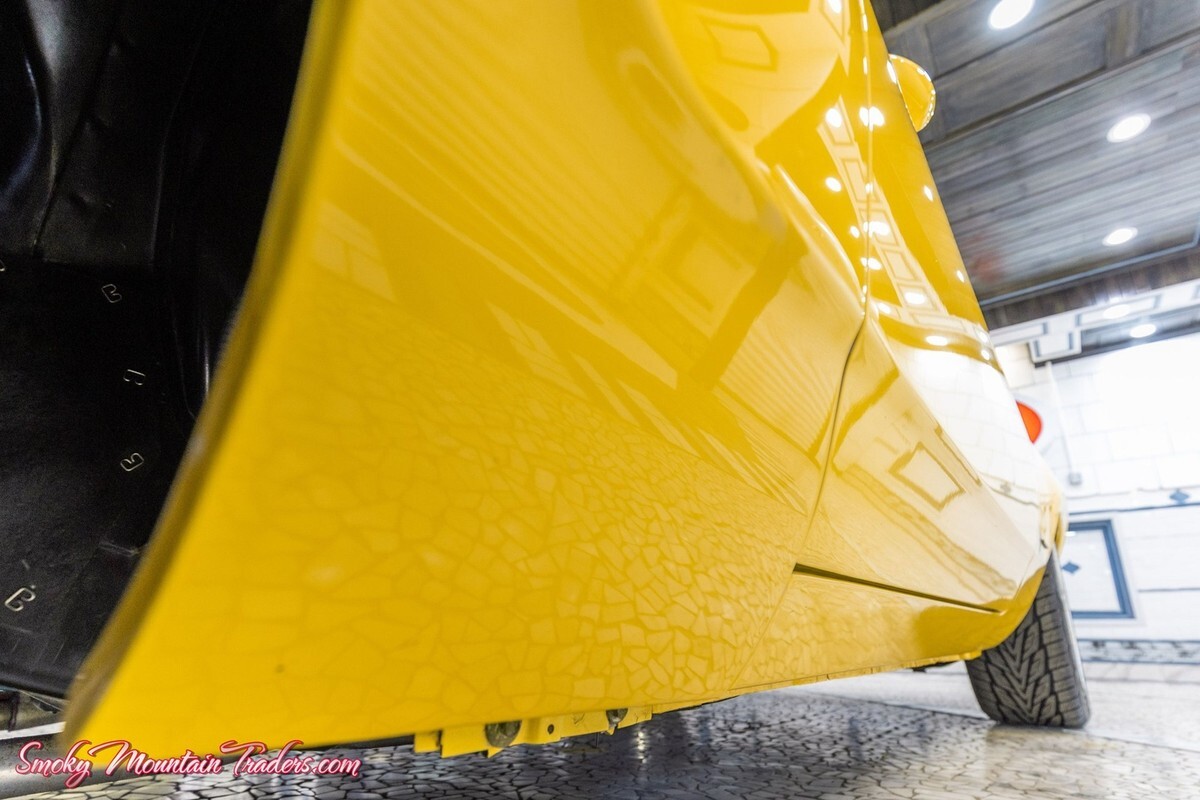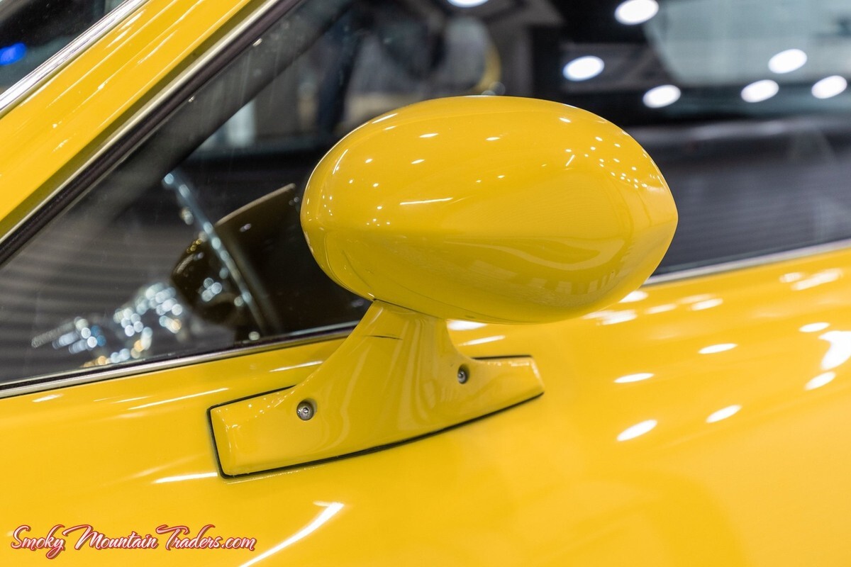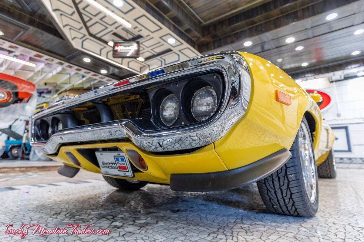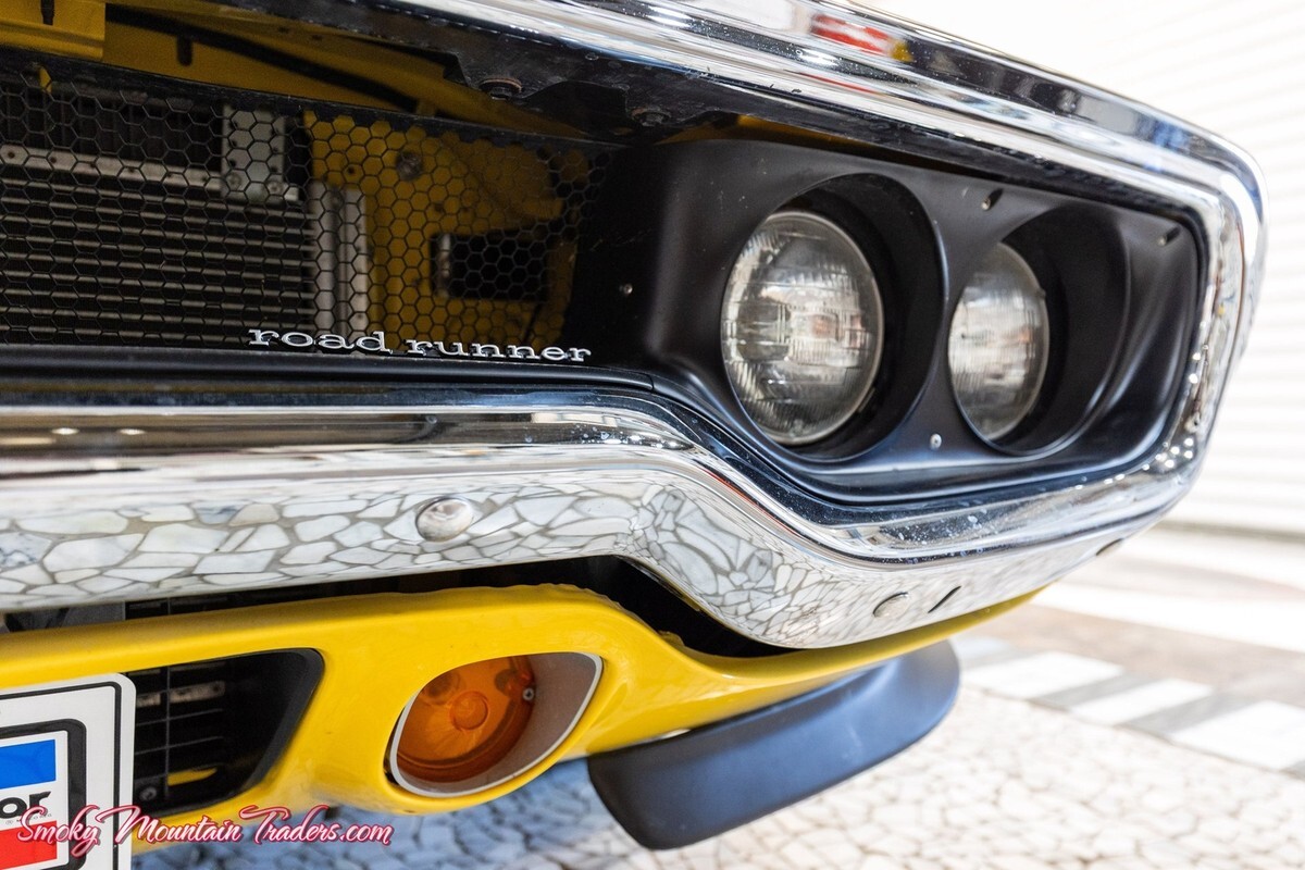 We will start off with the exterior of this Road Runner. The body on it was meticulously prepped and fitted during the restoration. It resulted in one of the straightest and best fitting Mopars we have ever had the pleasure of owning. It's showcased in the factory optioned Lemon Twist Paint Scheme that was redone in base coat clear coat. The paint is buffed and polished out to stunning finish that's slick as ribbon. The Lemon Twist yellow is accented by the Black Transverse stripes and Black Spolier that are both factory options for it. This is a factory 340 car that is equipped with the correct hood and comes with dual mirrors. Both front and rear bumpers have a brilliant finish and excellent fit. All the glass is phenomenal and new seals and weather stripping were installed at the time of the restoration. To finish off the stance it's sitting on a set of custom built Billet Specialty wheels with 18" on the front and 20" on the rear, and it has a new set of Toyo tires.
