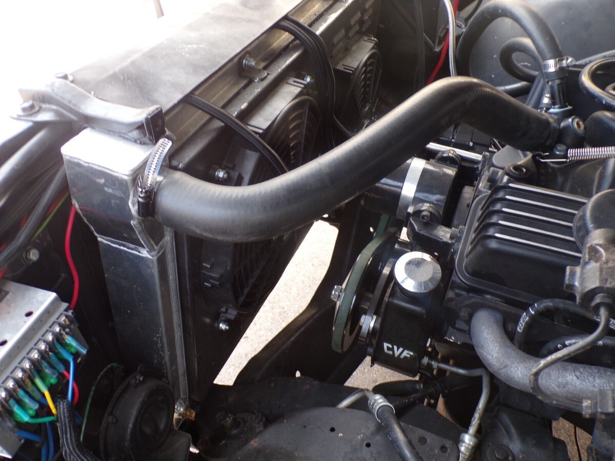 The carpet is all new and all the cables are run under the carpet. The next stop was the engine. After careful observation of about 20 seconds, I knew that the engine had to be replaced. I ordered a brand new, 350 4 bolt main from Jeggs, but it came from ATK. The engine has less than 200 miles and still has the break in oil. The engine was pretty much stock, no cam, or pistons. https://atkhp.com/product/atk-hp291p-chevy-350-base-engine-325hp/ I painted the engine black with high temperature engine primer and paint. It has finned valve covers and air cleaner. It has an MSD-85555-Distributor and MSD Blaster coil. https://www.amazon.com/MSD-85555-Distributor/dp/B01JP2KHOCan It has a MSD 31293 Black 8.5mm Super Conductor Spark Plug Wire Set that is in a straight wire management system. https://www.amazon.com/dp/B000PFF68Q?ref_=ppx_hzsearch_conn_dt_b_fed_asin_title_7 The headers were kept. I put a Holley 650 carburetor on it that started to flood the day before I was to take it to the body shop, so I put a cheap no name carb on it (Royal Air???) to get it to the shop and have been very unhappy with it as sometimes it doesn’t want to start (choke issue). You will get a brand new Edelbrock (still in the box) if I don’t replace it before sale. I also put a CVF Wraptor Serpentine belt system, I have since removed it, but it is included with the truck. It now has a CVF pully system with an electric water pump. More details below. https://www.cvfracing.com/small-block-chevy-all-inclusive-wraptor-serpentine-system-w-electric-water-pump-black-diamond/ I just installed a brand new, 4 core radiator with two electric fans as I felt it ran hotter than I like and still does, more on that further down.