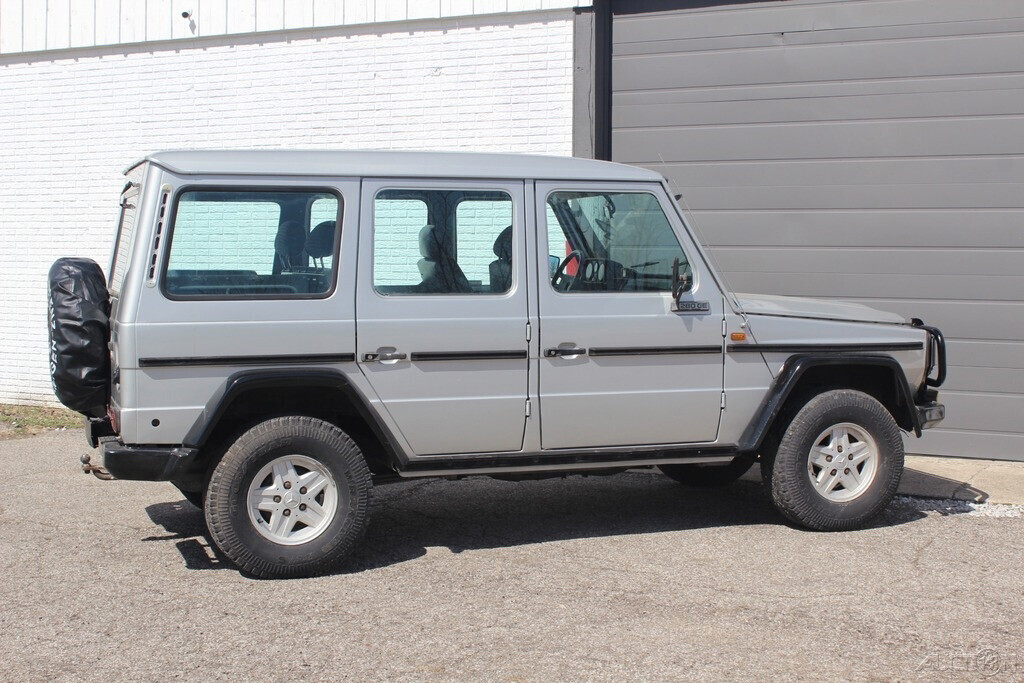 A 1985 Mercedes Benz 280GE W460 Chassis LWB. Astral silver metallic exterior with a black and white interior. 119,000 miles.