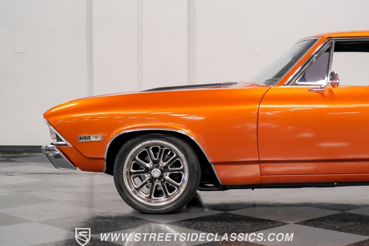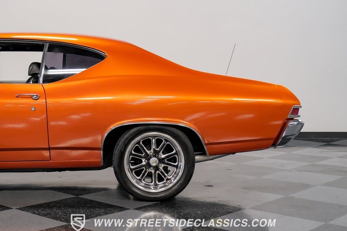 Ladies and gentlemen, start your engines and feast your eyes on this fire-breathing, asphalt-devouring 1968 Chevrolet Chevelle Malibu SS Tribute. Clad in an eye-catching Inferno Orange Metallic paint job that's as bold as a sunrise after the darkest night, this beast doesn't just roll down the street; it makes the pavement quiver. Accentuated by aggressive black stripes that trace its muscular contours like the scars of street battles won. It sits proudly on 17" US Mags rims, shod in 225/45R17 rubber, ready to grip the road or burn rubber, depending on how you're feeling when you hit the gas. The blacked-out grille and tinted windows hint at the rebel heart beating within, while the clean lines and sparkling chrome bumpers front and rear ensure it's always dressed to impress.