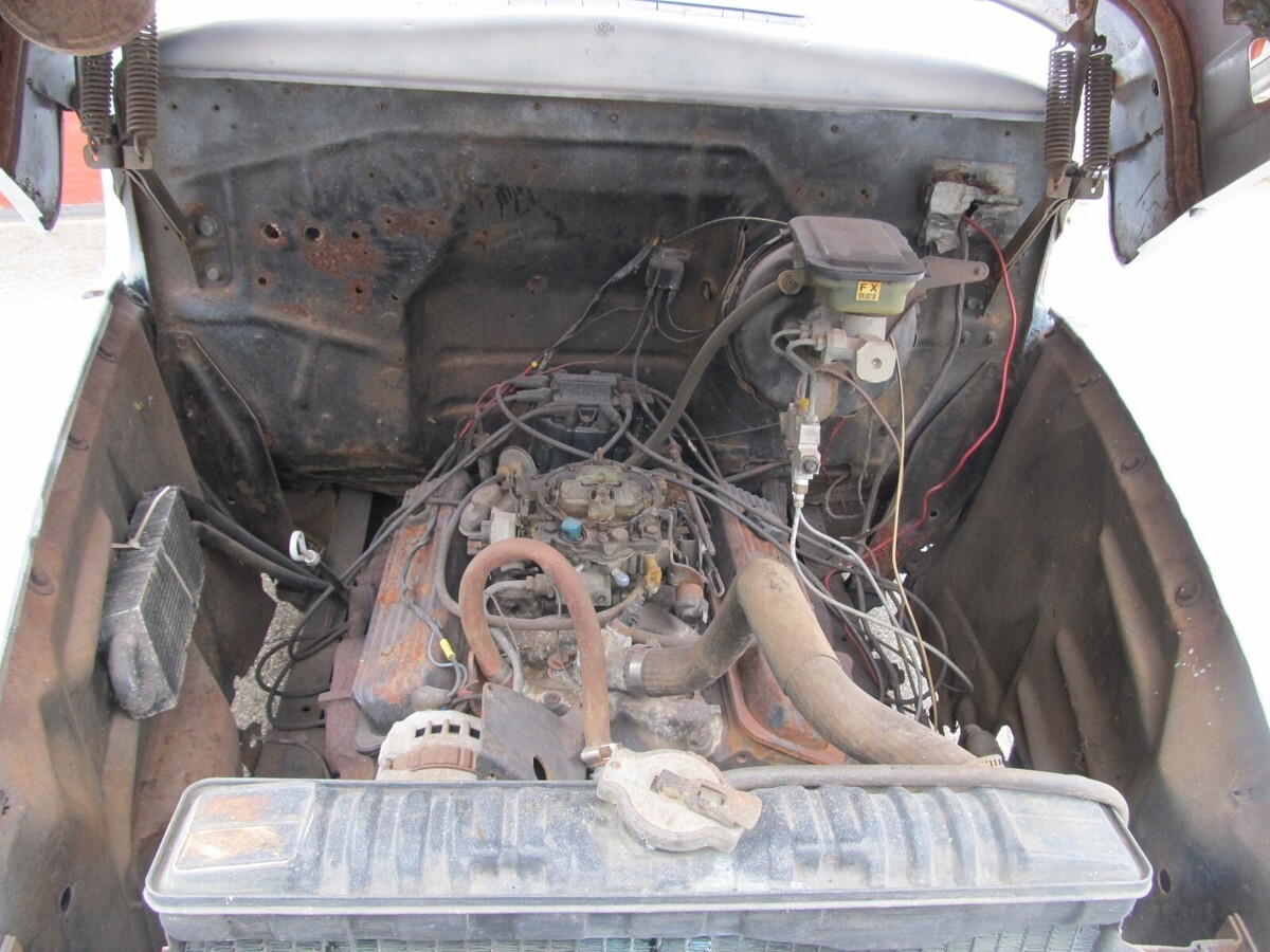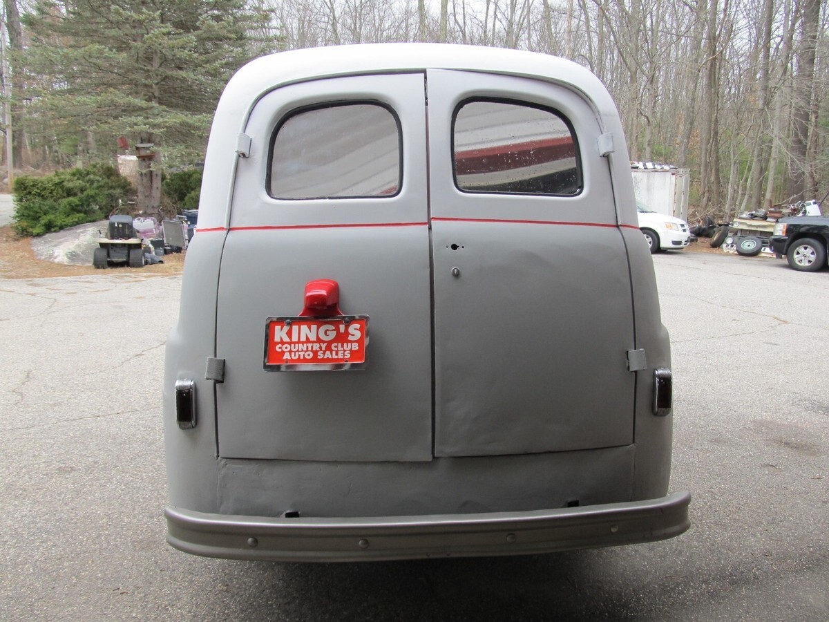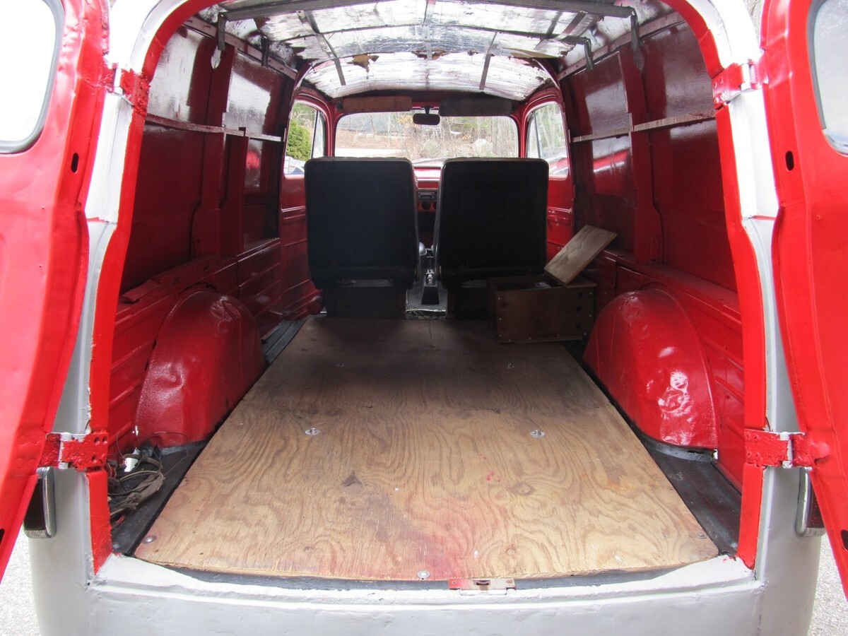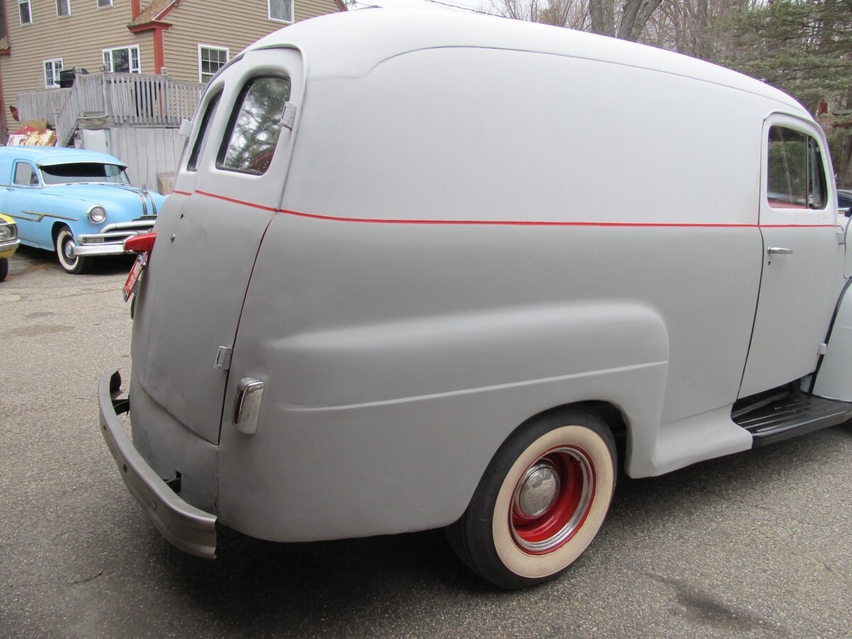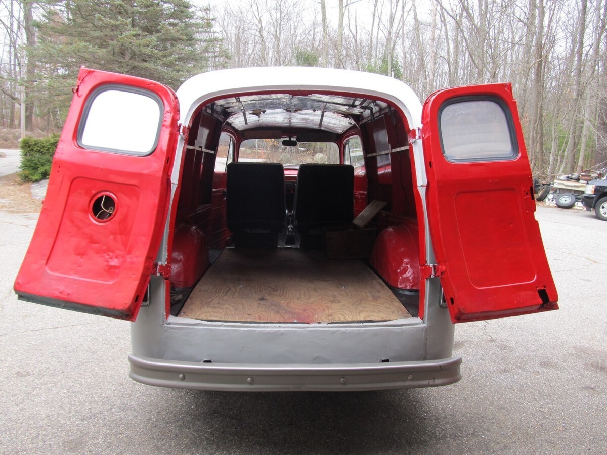 This auction is for a 1951 Ford F1 Half Ton Panel Van. Recently out of lengthy storage. When we acquired it the vehicle had been painted a dark blue and it was peeling and chipping everywhere. We stripped the vehicle down to bare metal, primed it completely and then painted the top section flat white. Inside was several different colors so we stripped that also and put it back to the red that it was. Cleaned up some of the prior body work that was done just to make it more presentable. Back doors still have some dents and will need attention. Inner wheel tubs are all intact but should be stiffened up. We cleaned up the back frame section which is good and solid and under coated it. Bolted in a piece of heavy duty ply wood for the back floor. Has a mid 80s 305 V-8 4BBL with Automatic Transmission, Dual Exhaust. We did get it fired up and seems to run fine but carburetor needs cleaning or replacement. Brakes will need to be gone through. We got the right side front to bleed and hold if your going slow. Glass in drivers door is cracked and will need replacement. Just a cool rig to make a rat rod or fleamarket vehicle. A blank canvas for whatever way you want to go. We do have the front bumper. It has a crack on the right side that needs to be welded and then paint it. Overall a real cool project if you put the time and effort into it. Very reasonable reserve. We have a Maine Registration and proper dealer transfer paperwork should you need a title in your state. We require $500 non refundable deposit at end of auction and prefer bankwire transfer or cash in person 3 days after auctions end. any questions or concerns feel free to call us at 1-207-432-2862. We are easy to deal with.